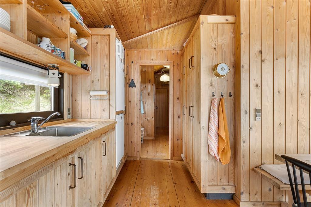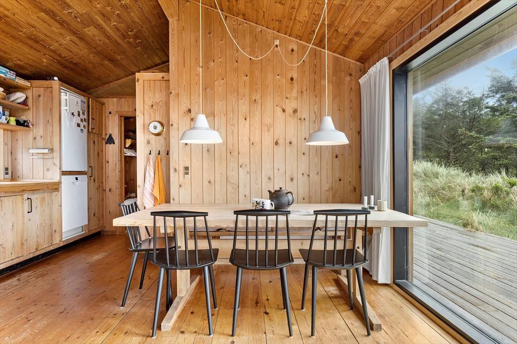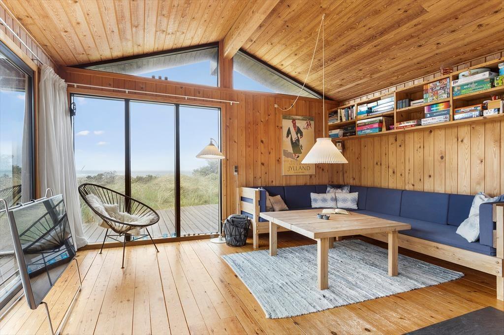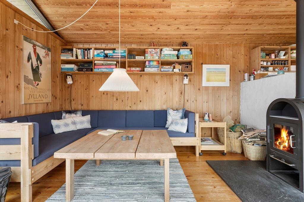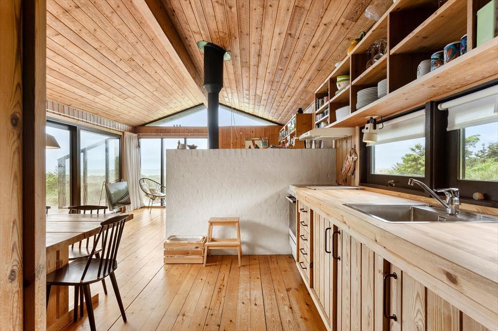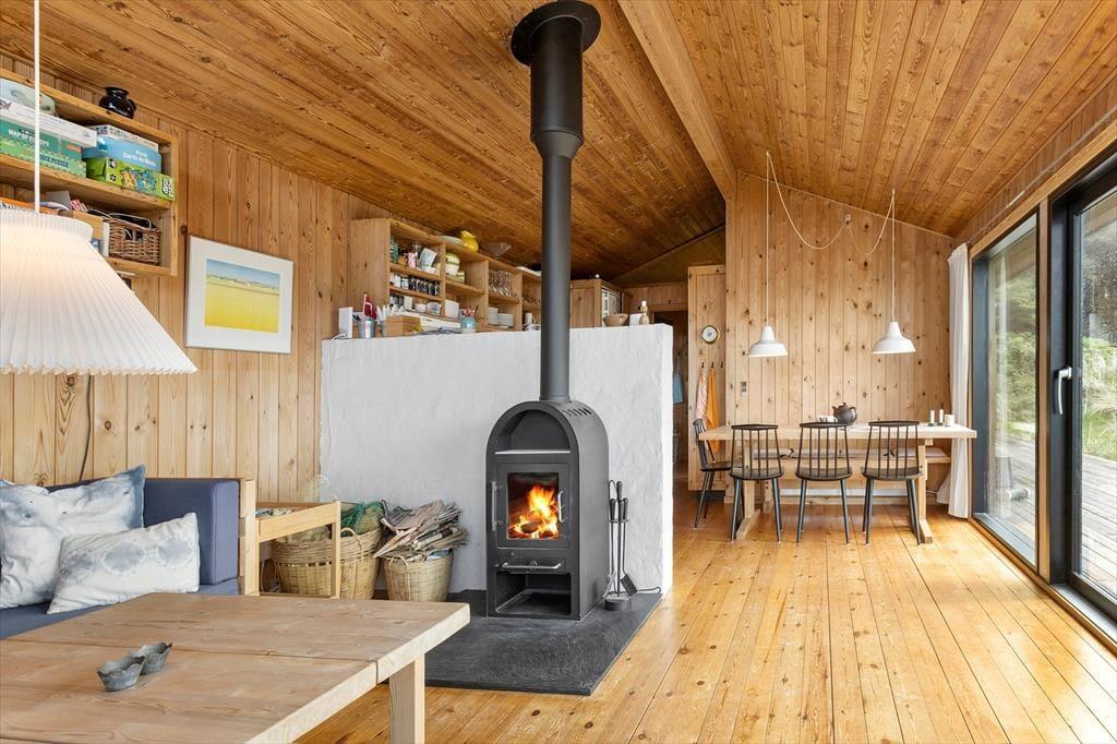 Das Ferienhaus versprüht Charme und Authentizität – und schon beim Betreten spürst du die besondere Stimmung, die zu einem klassischen dänischen Ferienhaus gehört. Es ist hell und gemütlich mit schönen Lichtstimmungen, die sich im Laufe des Tages verändern. Das Wohnzimmer bildet das Herzstück des Hauses – eingerichtet mit bequemen Möbeln und einem knisternden Kaminofen, der für wohlige Wärme sorgt, wenn es abends kühler wird. Die Küche ist teilweise offen zum Wohnzimmer gestaltet, sodass hier Raum für Gespräche und gemeinsames Kochen bleibt. Das Haus verfügt über drei gute Schlafzimmer, die Ruhe und Privatsphäre ermöglichen, und das Badezimmer ist schlicht und funktional – genau richtig, wenn du komplett abschalten und das einfache Ferienhausleben genießen möchtest. Die großen Fenster im Wohnbereich eröffnen dir einen beeindruckenden Ausblick auf Landschaft und Meer – ein Anblick, von dem du nie genug bekommst.