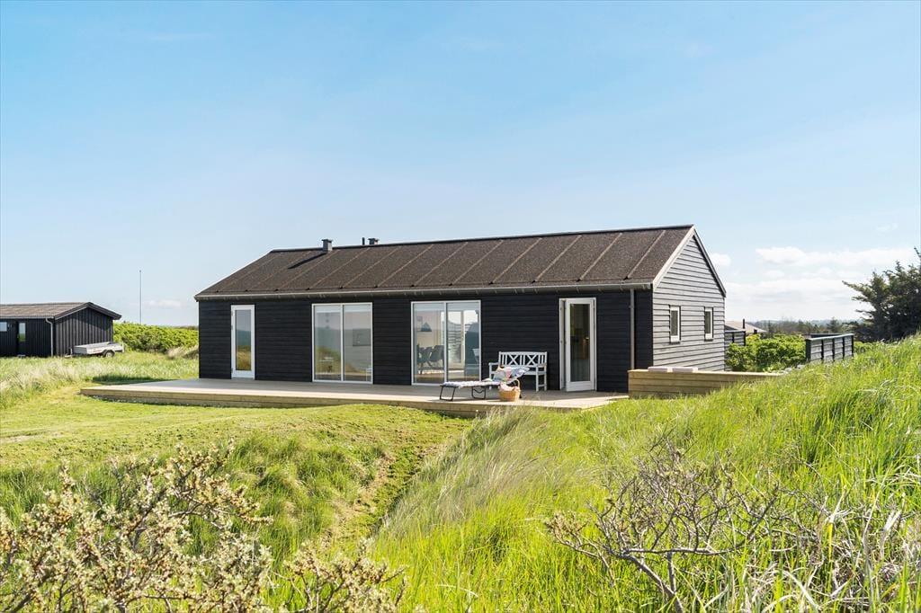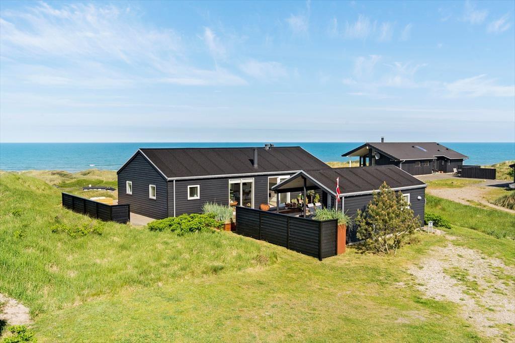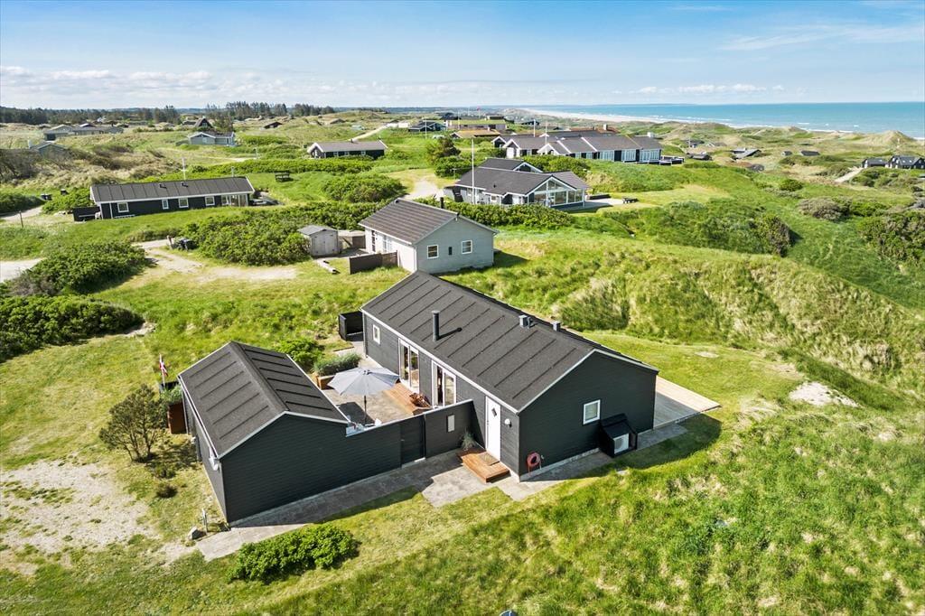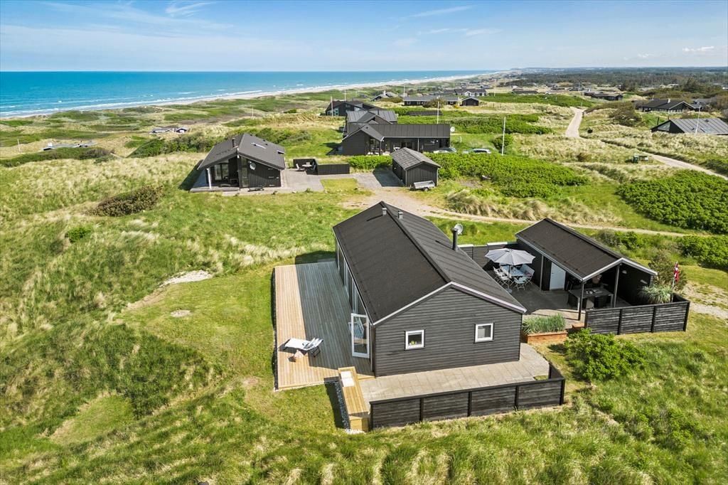Dieses wunderschöne Ferienhaus mit Panoramablick bietet den perfekten Rahmen für den nächsten Urlaub in Nordjütland. Vom Eingang aus hat man Zugang zum schönen Badezimmer des Hauses und zum Wohnzimmer. Das Wohnzimmer ist das Herz des Hauses und umfasst die offene Küche, den Essbereich und das Wohnzimmer mit Kamin. Die großen Fenster bieten einen fantastischen Panoramablick auf das Meer und die Dünen, und der gesamte Raum vermittelt ein außergewöhnliches Raumgefühl, da die Decke bis zum First reicht. Von allen Stellen im Wohnzimmer und in den beiden westlich gelegenen Schlafzimmern kann man die Aussicht genießen. Das Ferienhaus verfügt über ein Badezimmer mit einer großen Dusche und drei Schlafzimmer; eines mit zwei Einzelbetten, eines mit einem Doppelbett und das letzte Zimmer enthält ein Einzelbett und einen Schreibtisch. Hier kann man sich ein wenig zurückziehen und das Internet des Hauses nutzen, wenn man einen Laptop oder ein Tablet mitbringt.