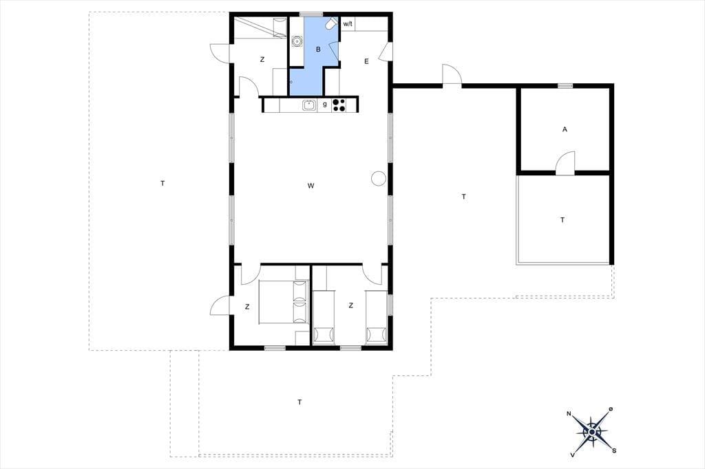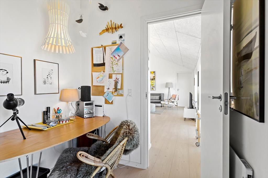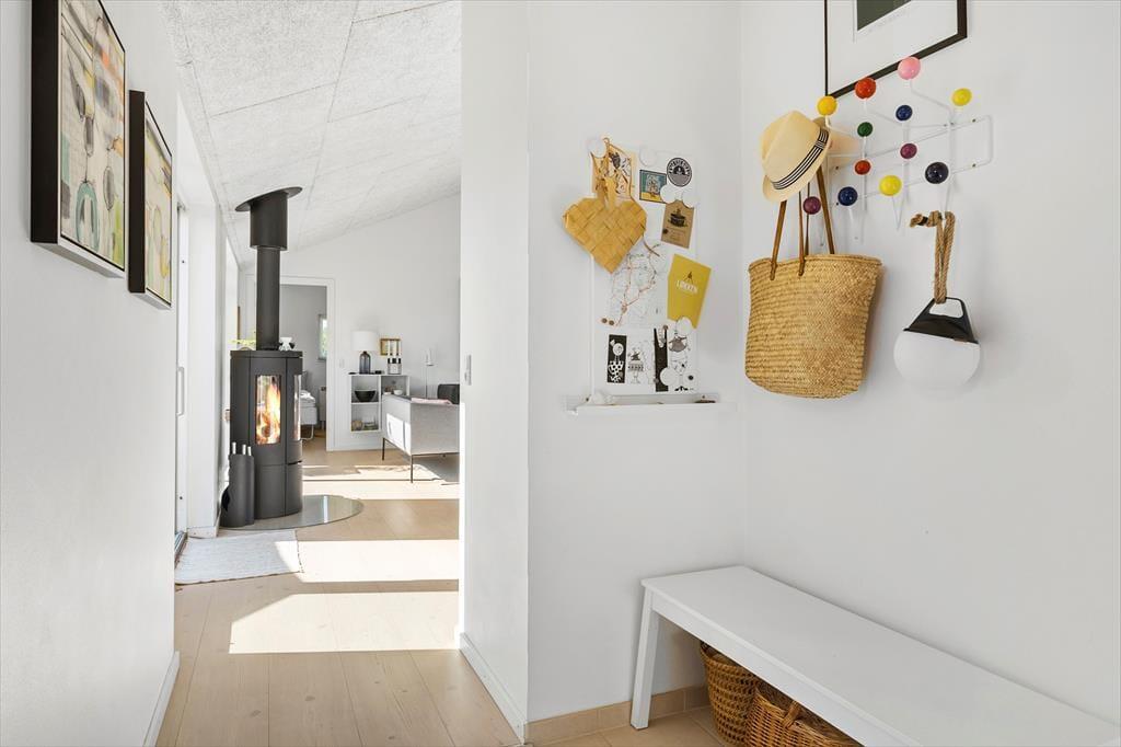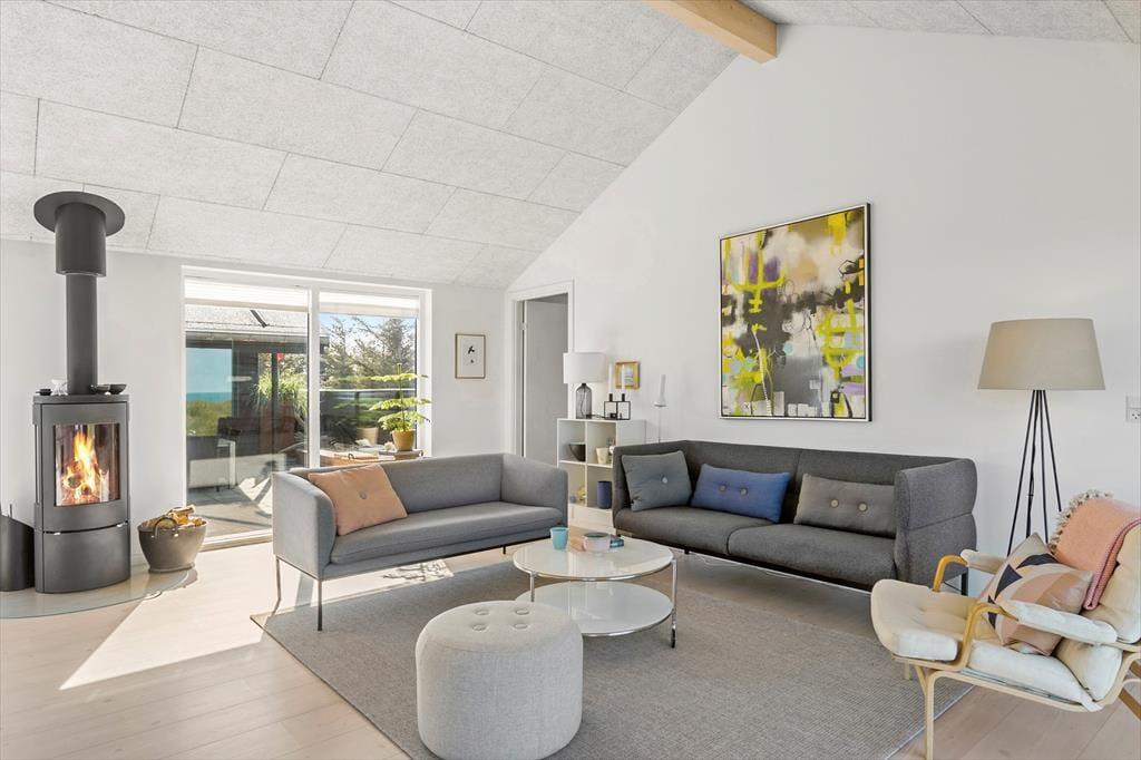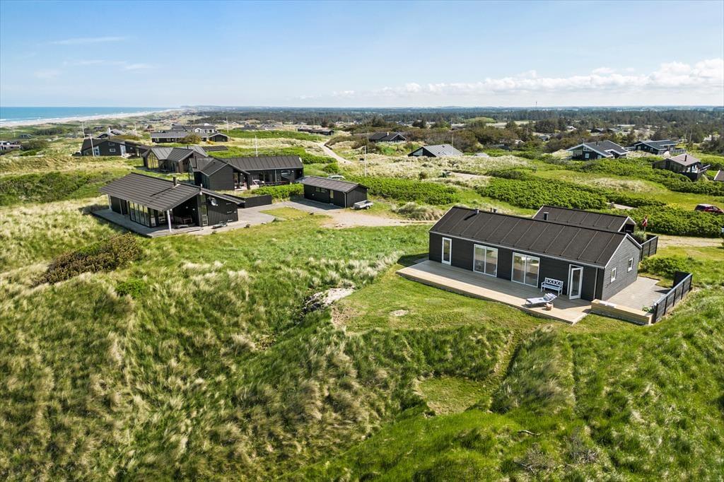 Dieses wunderschöne Ferienhaus mit Panoramablick bietet den perfekten Rahmen für den nächsten Urlaub in Nordjütland. Vom Eingang aus hat man Zugang zum schönen Badezimmer des Hauses und zum Wohnzimmer. Das Wohnzimmer ist das Herz des Hauses und umfasst die offene Küche, den Essbereich und das Wohnzimmer mit Kamin. Die großen Fenster bieten einen fantastischen Panoramablick auf das Meer und die Dünen, und der gesamte Raum vermittelt ein außergewöhnliches Raumgefühl, da die Decke bis zum First reicht. Von allen Stellen im Wohnzimmer und in den beiden westlich gelegenen Schlafzimmern kann man die Aussicht genießen. Das Ferienhaus verfügt über ein Badezimmer mit einer großen Dusche und drei Schlafzimmer; eines mit zwei Einzelbetten, eines mit einem Doppelbett und das letzte Zimmer enthält ein Einzelbett und einen Schreibtisch. Hier kann man sich ein wenig zurückziehen und das Internet des Hauses nutzen, wenn man einen Laptop oder ein Tablet mitbringt.