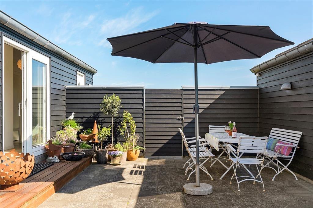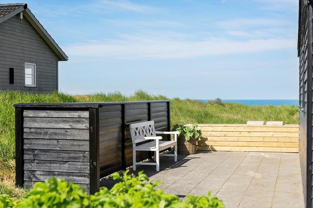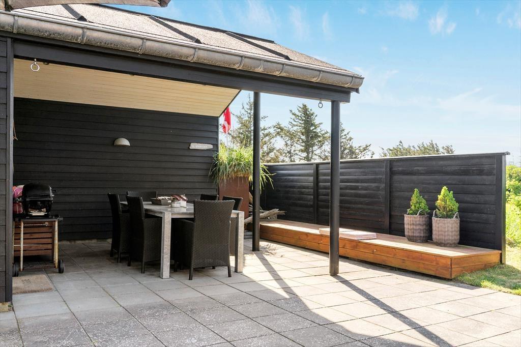 Von den beiden westlich gelegenen Schlafzimmern hat man Zugang zur Terrasse vor dem Haus, von der man die Dünenlandschaft und den fantastischen Blick auf die Nordsee genießen kann. Ist es zu windig, hat das Haus einen schön geschützten Innenhof nach Osten. Vor dem Nebengebäude gibt es eine überdachte Terrasse, auf der man ganz ungestört sitzen kann. Auf der fast 100 m² großen Terrasse findet man immer einen Platz im Windschutz oder in der Sonne, und die großen Fenster auf beiden Seiten des Wohnzimmers öffnen den Blick auf das Meer, auch wenn man im Innenhof sitzt.