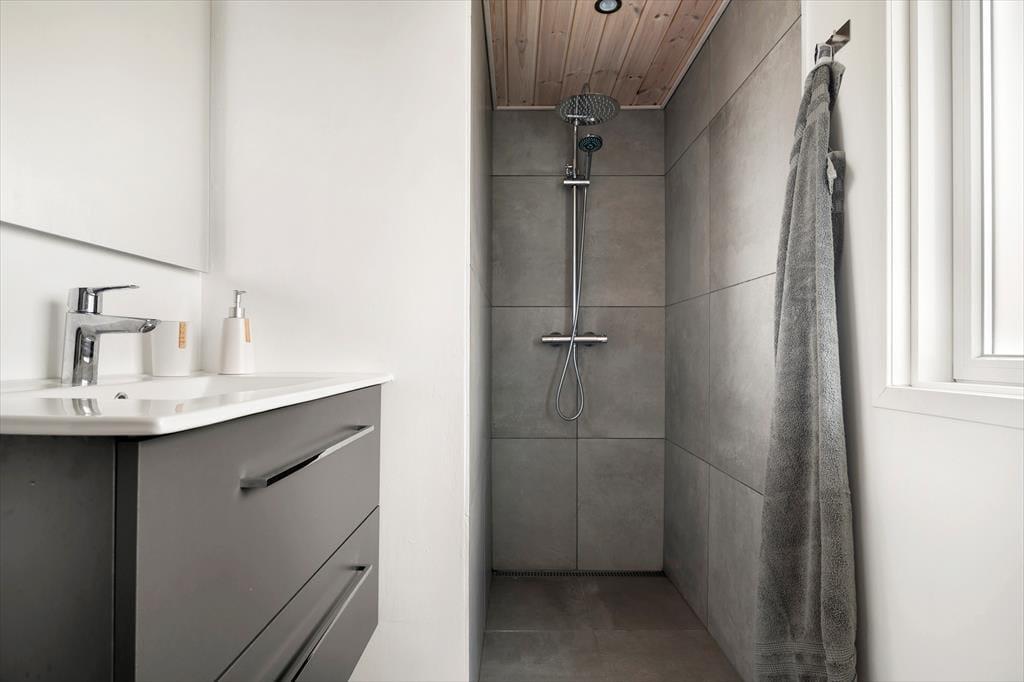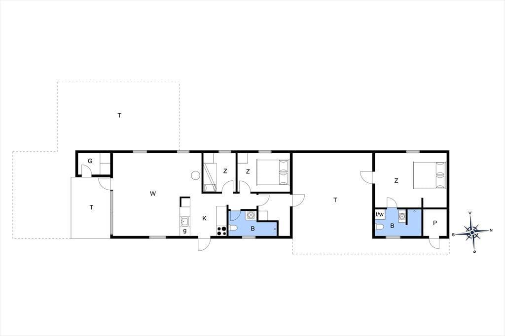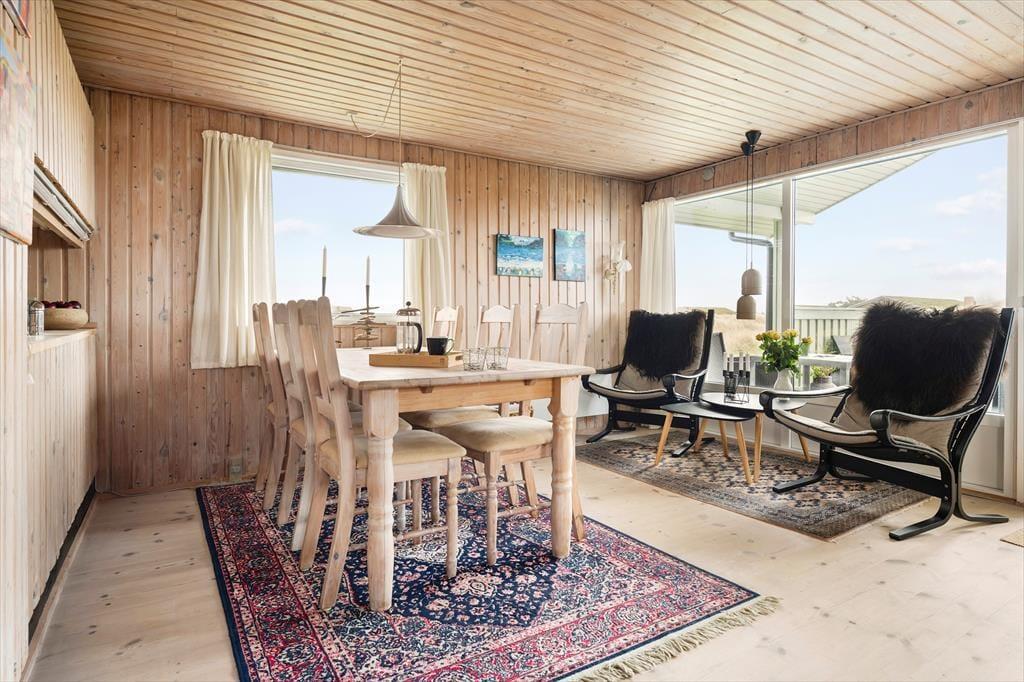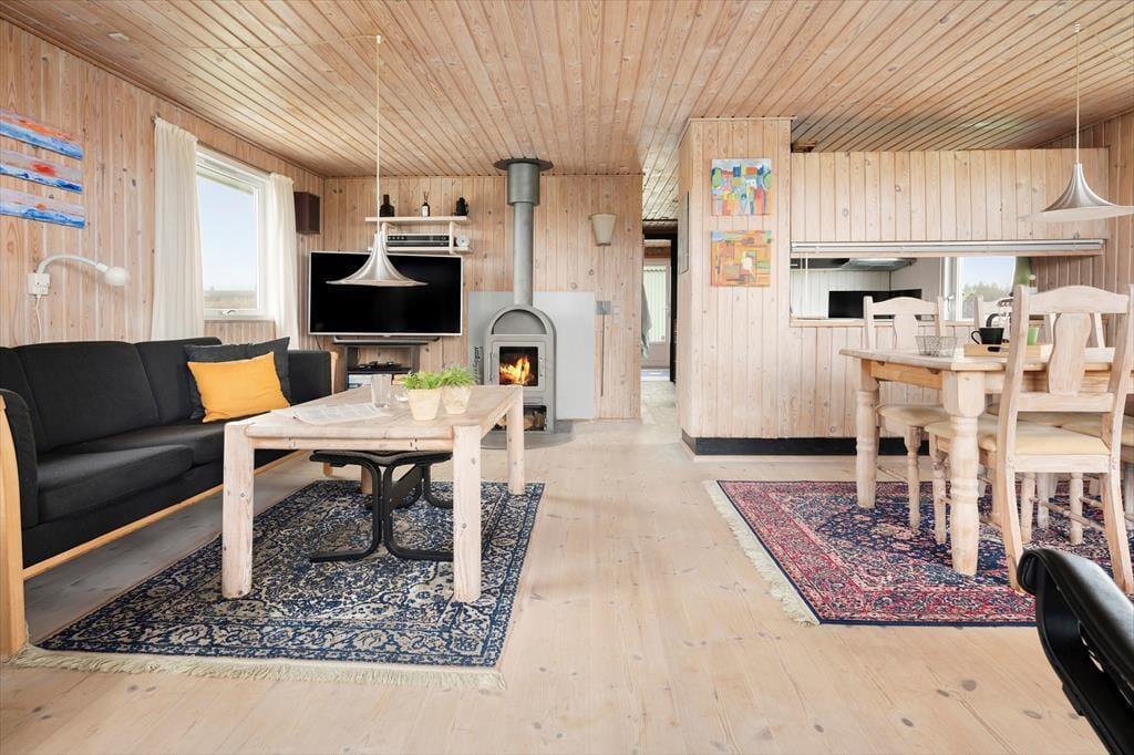 Das Ferienhaus ist im skandinavischen Stil eingerichtet und verfügt über eine große Fensterfront zur Terrasse, die für einen schönen Lichteinfall sorgt. Es ist sehr gut gepflegt, charmant und ein echtes klassisches Ferienhaus im besten Sinne des Wortes. Das Haus hat zwei Badezimmer, von denen eines in einem ganz neuen Nebengebäude untergebracht ist. Zwischen dem Nebengebäude und dem Hauptgebäude gibt es einen teilweise geschlossenen Innenhof. Im Haus gibt es drei Schlafzimmer: eines mit einem Doppelbett und die anderen beiden mit Etagenbetten. Das vierte Schlafzimmer befindet sich im schönen Nebengebäude und ist mit einem Doppelbett ausgestattet. Die gut ausgestattete Küche ist mit dem Wohnzimmer und dem Essbereich verbunden, von hier aus gelangt man auf eine der Terrassen des Hauses.