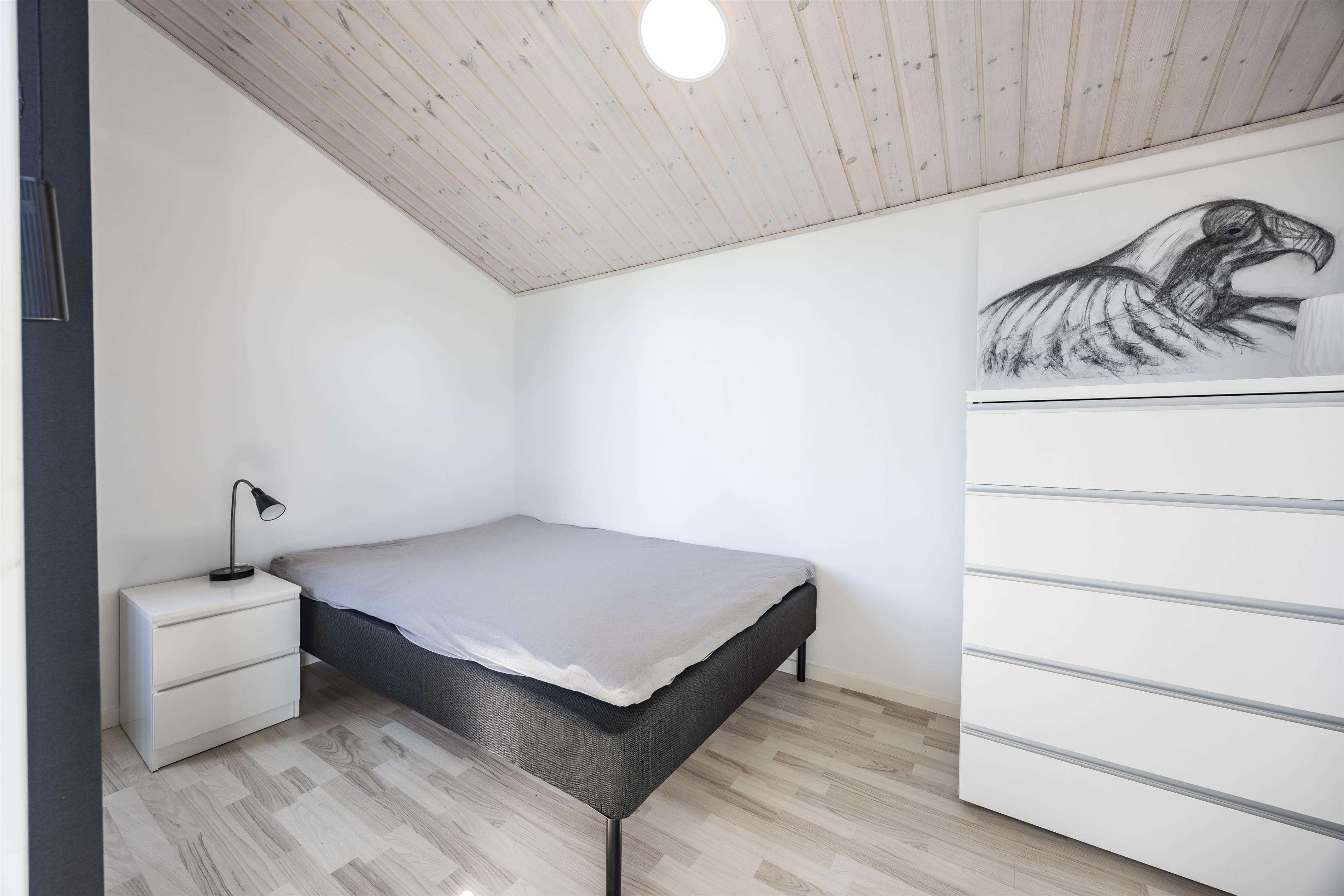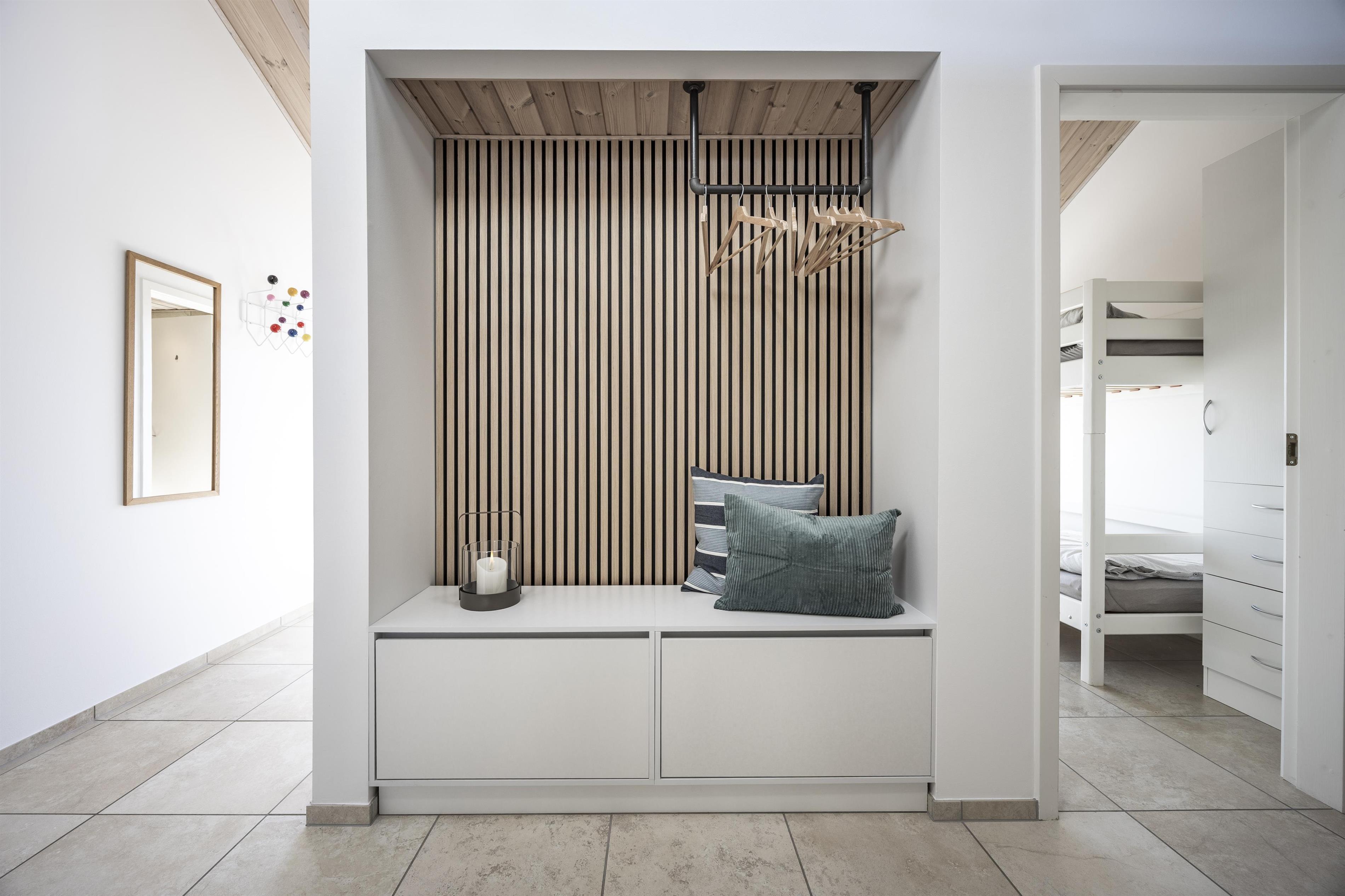 The holiday home is of high quality and features an exciting and thoughtfully designed interior. Guests are welcomed into a unique and well-considered layout that unfolds across multiple levels. The property offers two separate entrances – one of which leads directly into the utility room located on the lower ground floor. Here you will find both a washing machine and a tumble dryer, as well as ample space for storing outerwear. The second entrance brings you into the main living level of the house. This floor comprises two modern bathrooms and three beautifully appointed bedrooms. Throughout the house, high ceilings create a spacious and airy atmosphere in every room. Two of the bedrooms are furnished with double beds, while the third is equipped with a family bunk bed and a small loft area – ideal for children. Additionally, there is the possibility of two extra sleeping accommodations.
