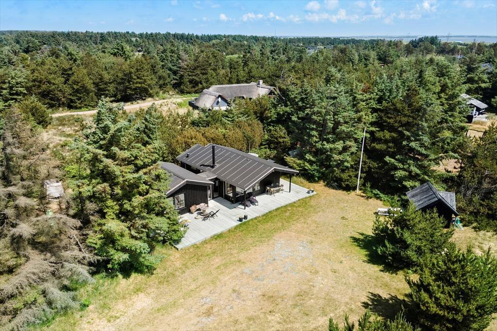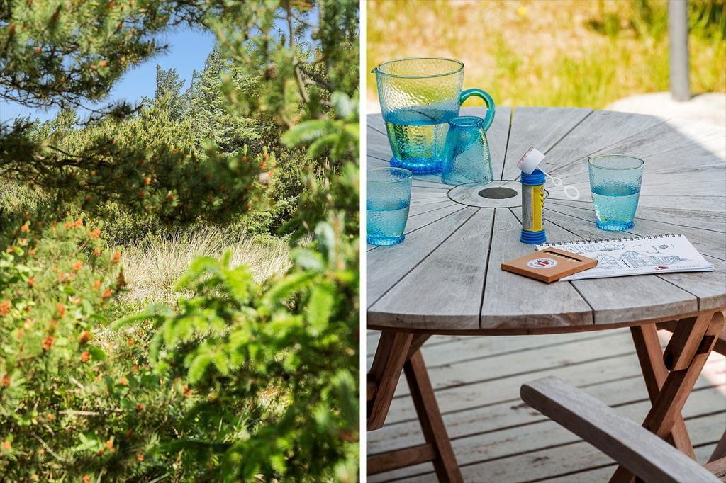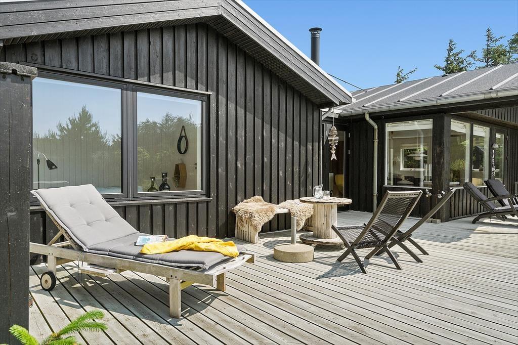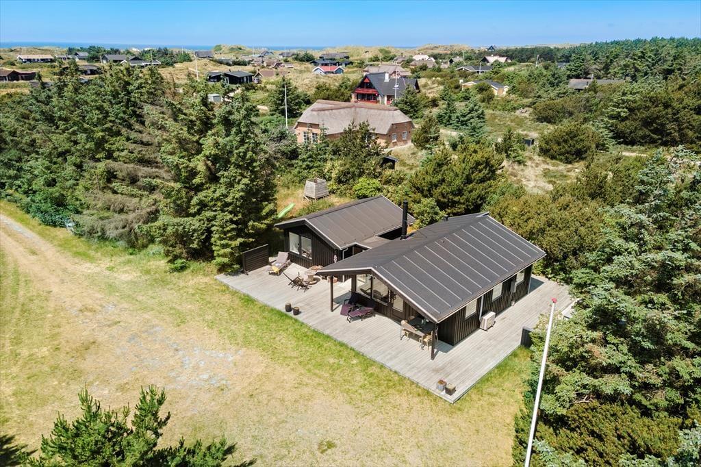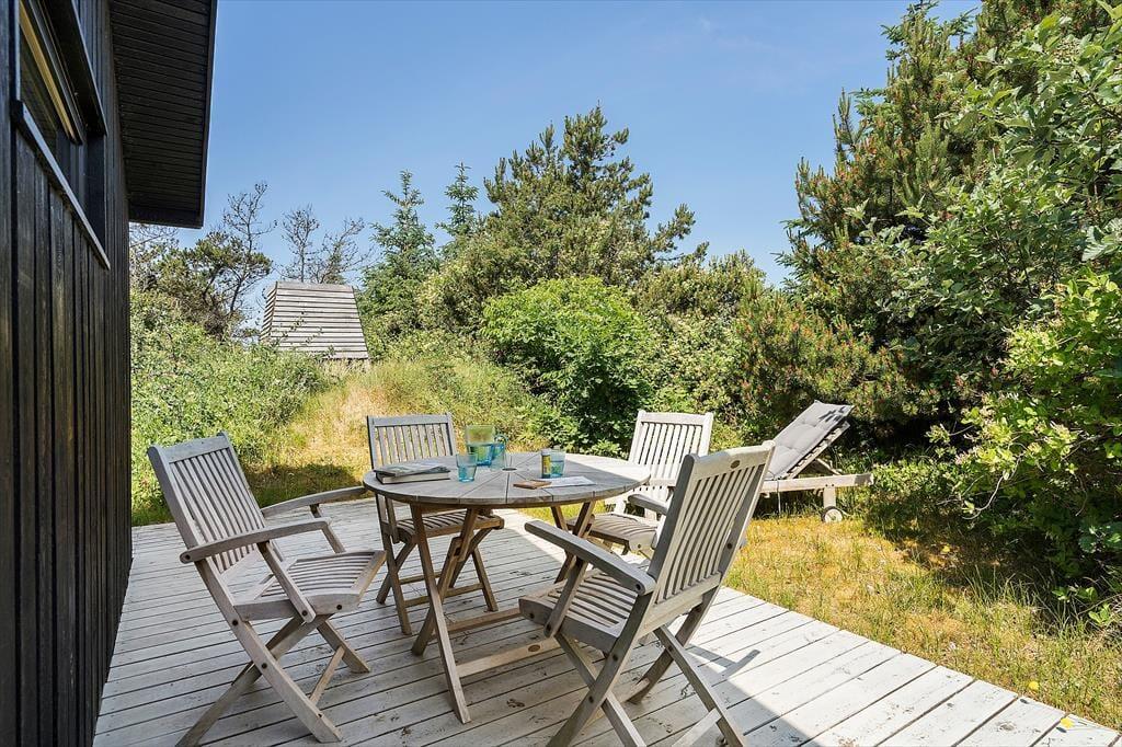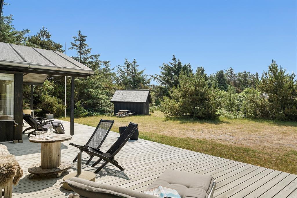 Das Sommerhaus liegt am Ende einer kleinen, gesperrten Nebenstraße, sodass die Umgebung völlig ungestört ist. Rund um das Haus erstreckt sich eine offene Holzterrasse, im Süden gibt es einen überdachten Bereich. Hier können Sie abends bequem sitzen, wenn die Dunkelheit über Søndervig hereinbricht. Zur Außenanlage gehören eine Außendusche, eine kleine Rutsche. Außerdem gibt es auf dem Naturgrundstück mehrere gemütliche Ecken und eine Liegewiese.