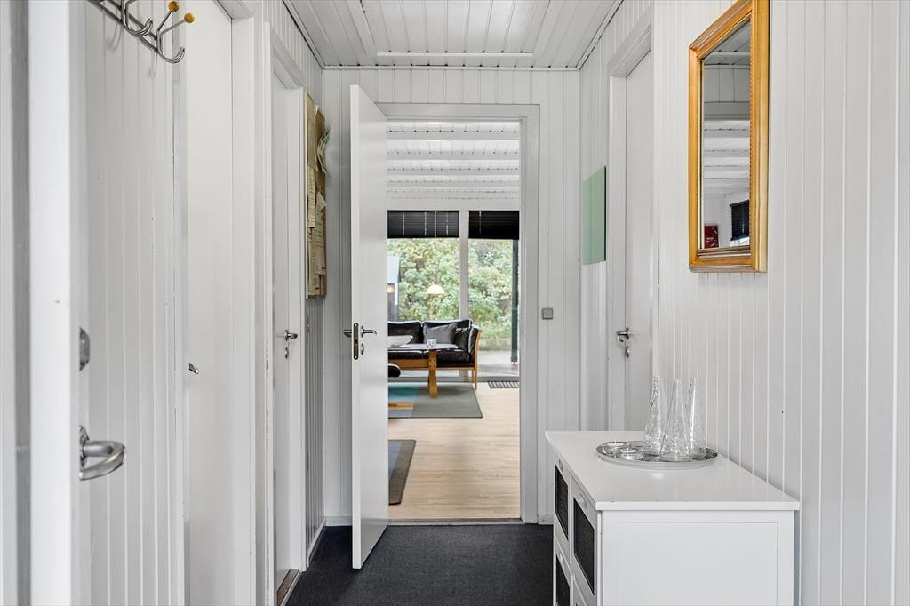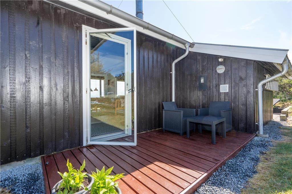Vom Wohnraum aus treten Sie hinaus auf das nach Osten und Süden weisende Terrassenareal, das sich in einen überdachten und einen komplett offenen Bereich unterteilt. Während Sie sich tagsüber auf dem offenen Bereich nach Herzenslust sonnen, spendet die Überdachung Windschutz und bietet sich sehr schön für einen entspannten Grillabend an. Von den Außenbereichen aus blicken Sie über Felder, Wiesen und den Fjord. Die kleinen Urlauber erfreuen sich an einer Grasfläche, an einer Schaukel und an einer Sandkiste.