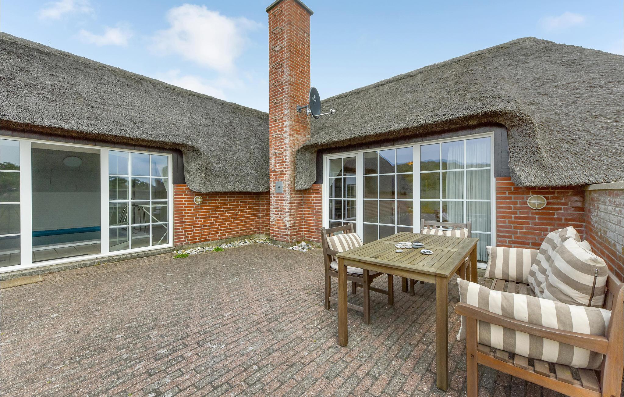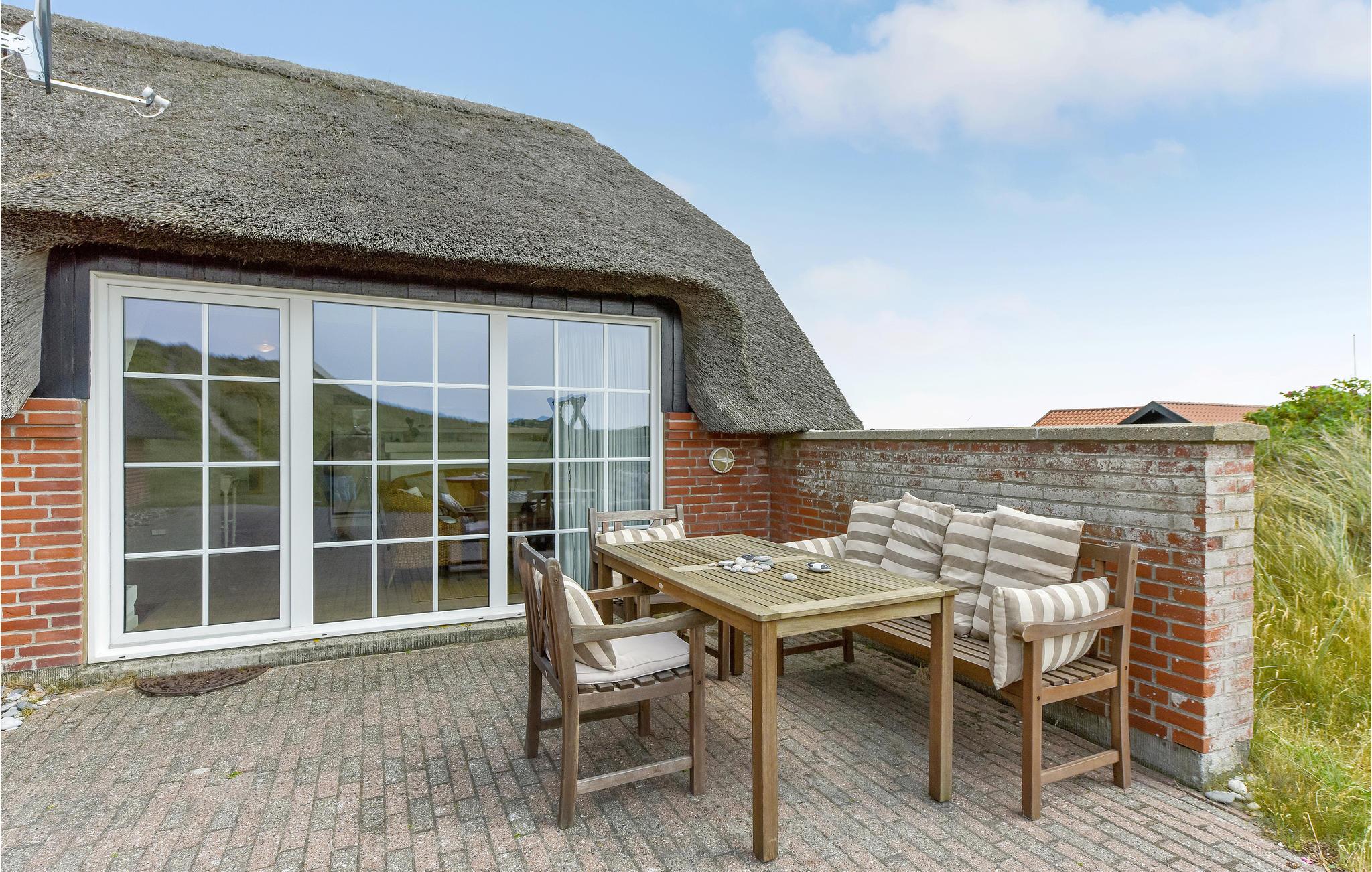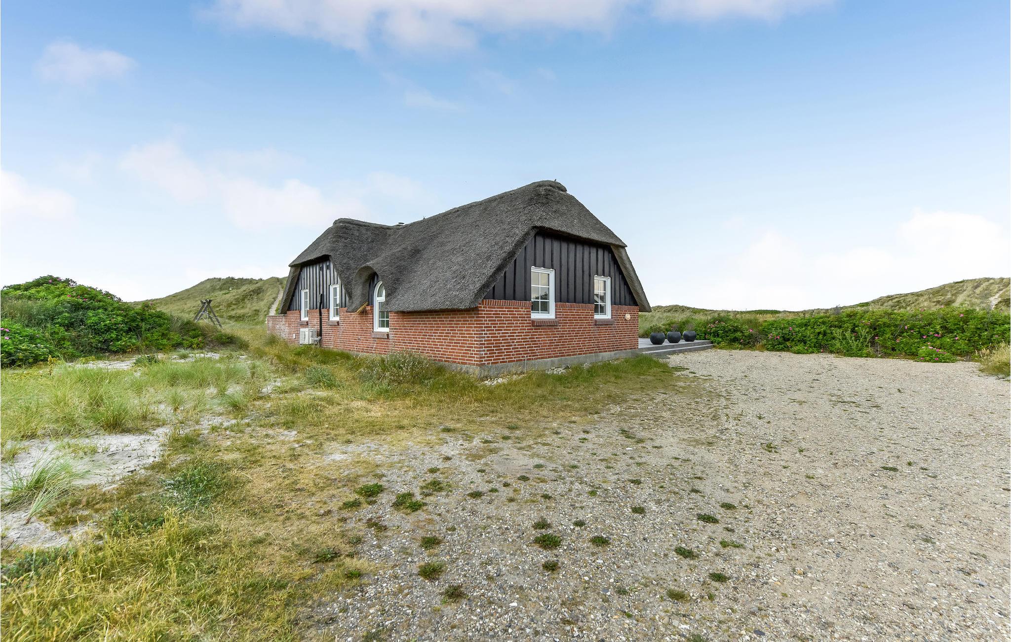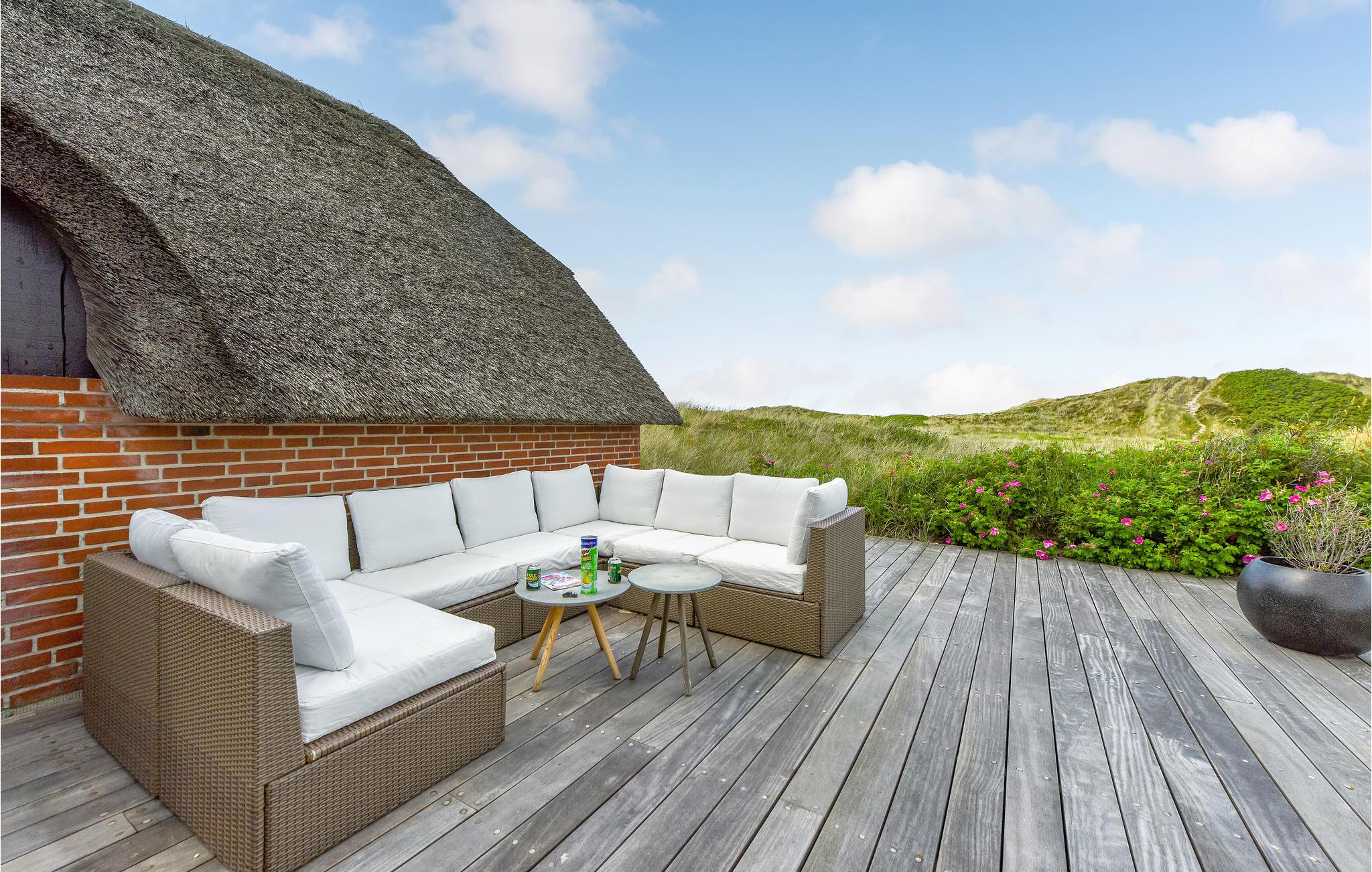 Das gemütliche Ferienhaus mit Schilfdach liegt in der ersten Dünenreihe, das an ein Naturschutzgebiet grenzt. Im Ferienhaus gibt es eine behagliche Wohnküche, vier Schlafzimmer, zwei Badezimmer und einen schönen Bereich mit Swimmingpool und sauna. Draußen bietet die Terrasse Aussicht auf die Dünenlandschaft.
