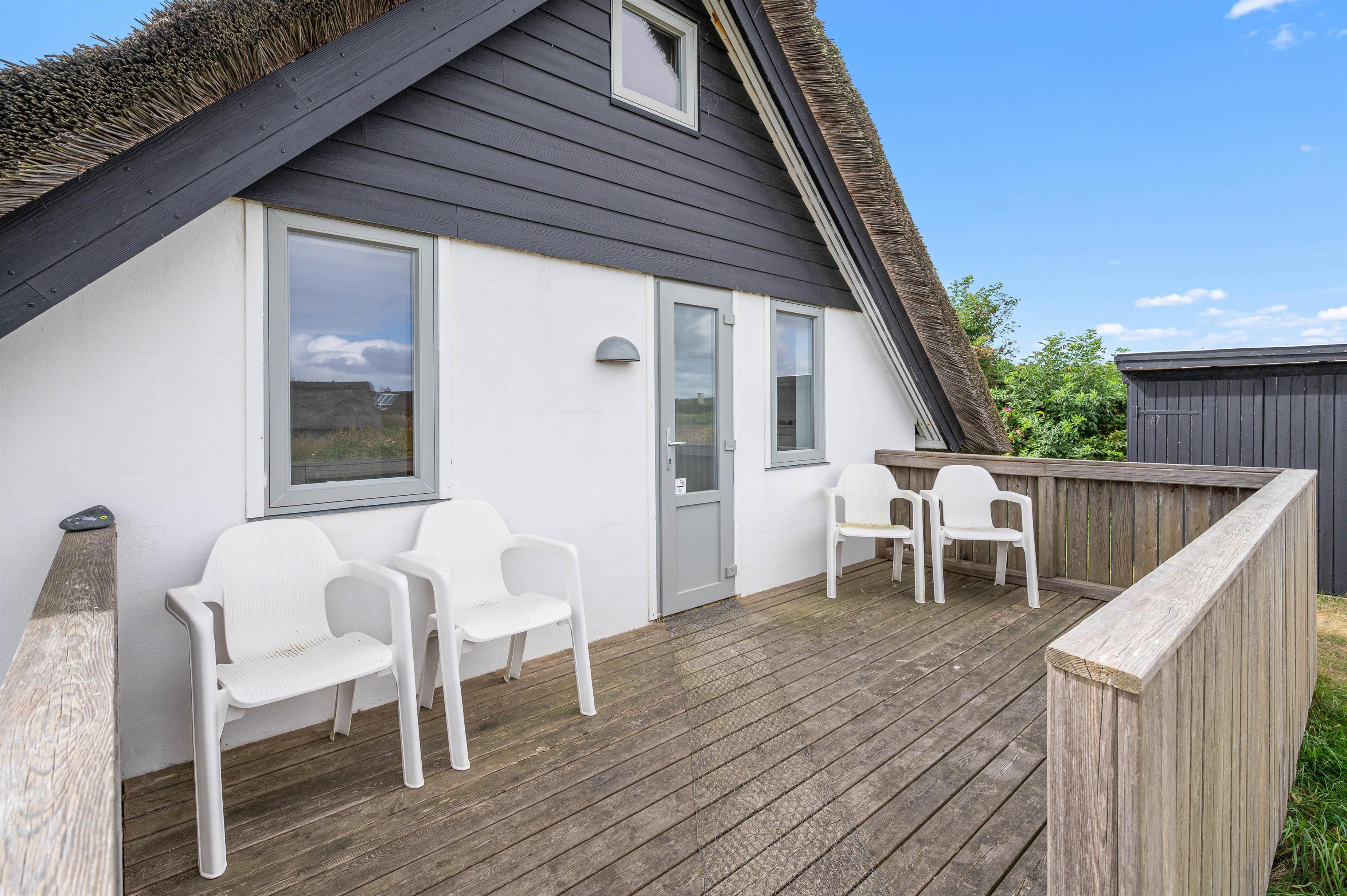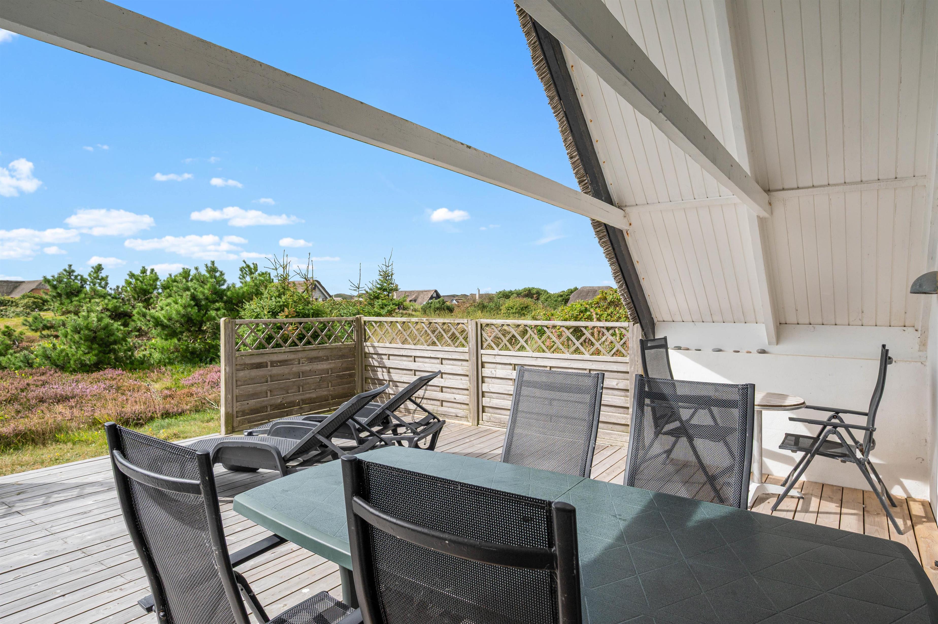 The holiday home features two terraces - one by the main entrance and a south-facing main terrace accessed from the living room. This allows you to choose your spot depending on the wind direction, enjoying the fresh sea breeze. For younger family members, there's a sandpit available.