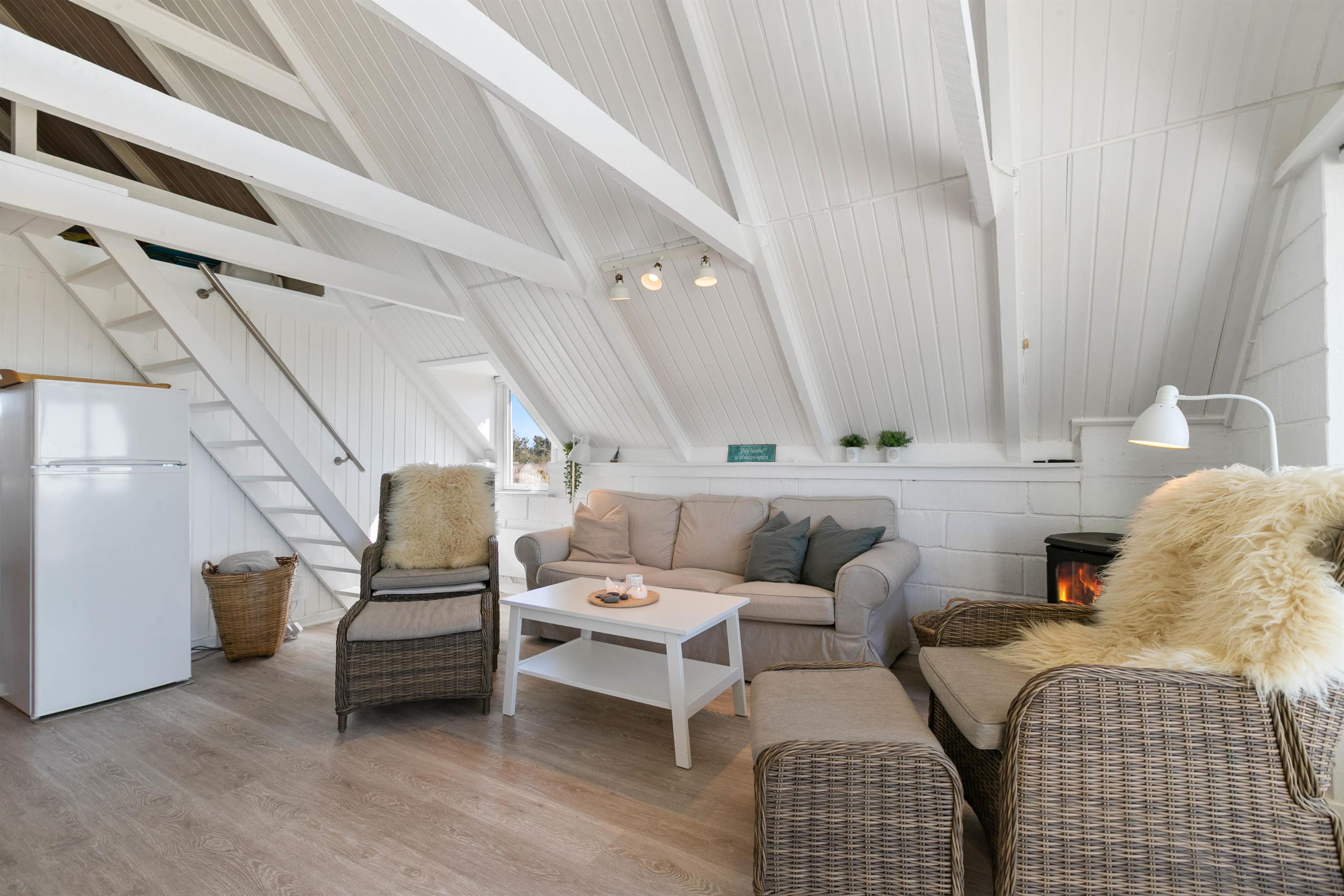 Hang your coats on the hallway hooks and step into the cosy living room with its wood-burning stove and vaulted ceiling. The bright interior design, featuring natural colour tones, creates a comfortable atmosphere that invites you to relax and unwind.