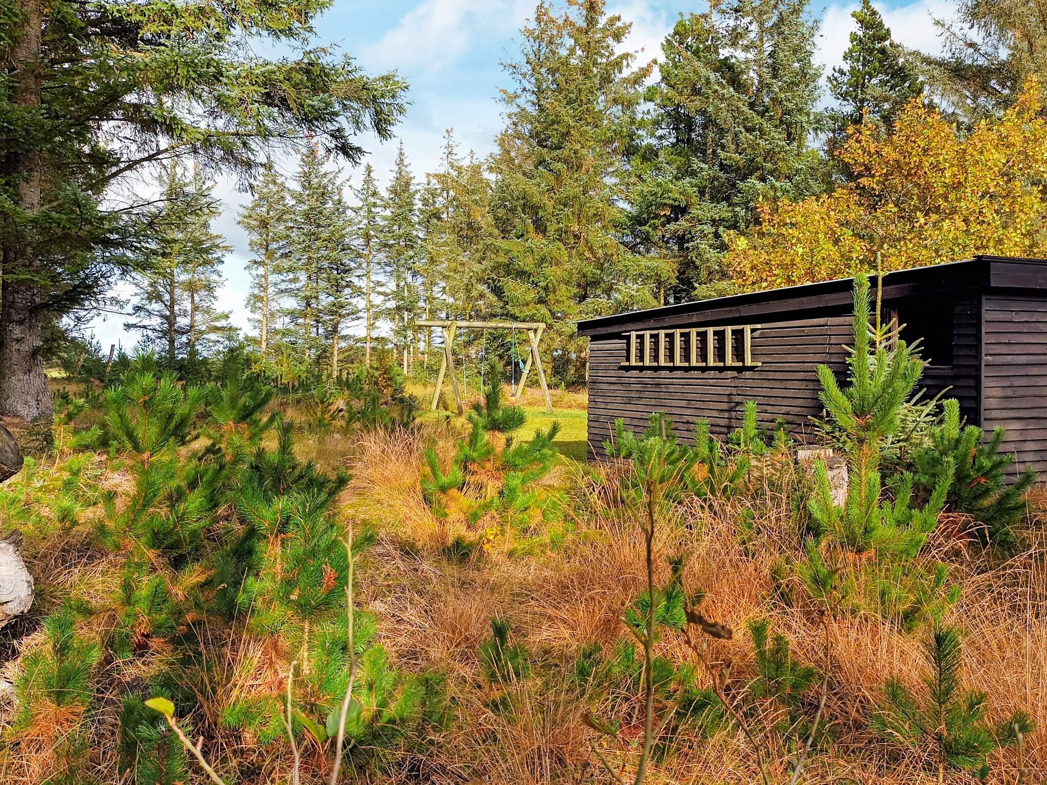 Im Garten gibt es eine Schaukel und eine große Feuerstelle. Das Haus steht auf einem naturbelassenen Grundstück, das teilweise mit Fichten, Moos und Büschen bewachsen ist.