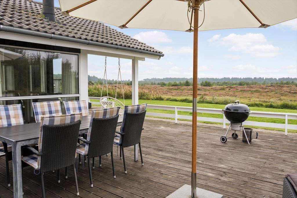 Die Aussicht von der großen, teilweise überdachten Terrasse, die sich Richtung Süden erstreckt, ist beeindruckend. Hier kannst du dich in den Gartenmöbeln zurücklehnen, grillen, die Ruhe spüren und die ungestörte Natur genießen. Wenn du dich etwas bewegen möchtest, gibt es auf dem Rasen viel Platz für Krocket und andere Gartenspiele. Für die jüngsten Familienmitglieder gibt es außerdem eine Schaukel und einen Sandkasten.