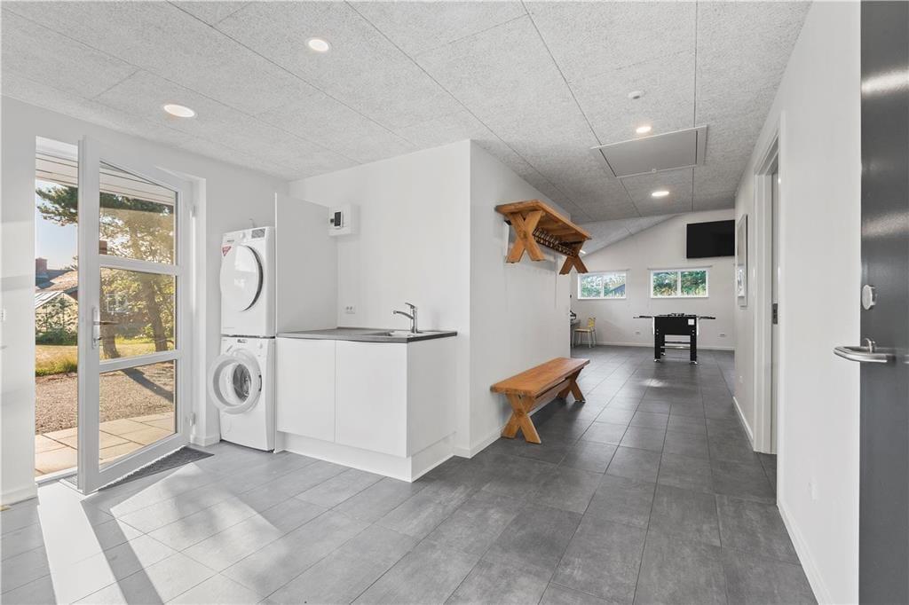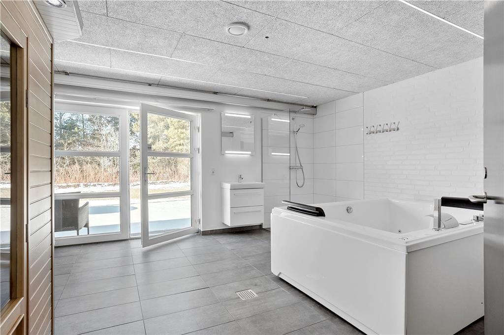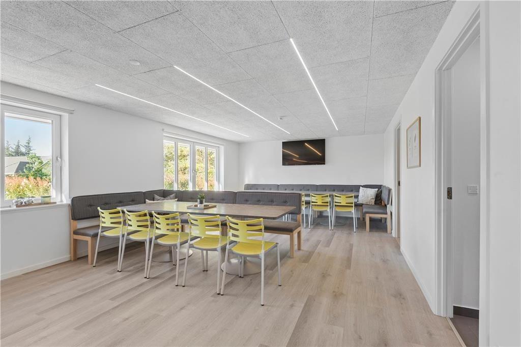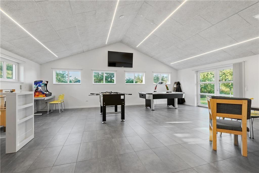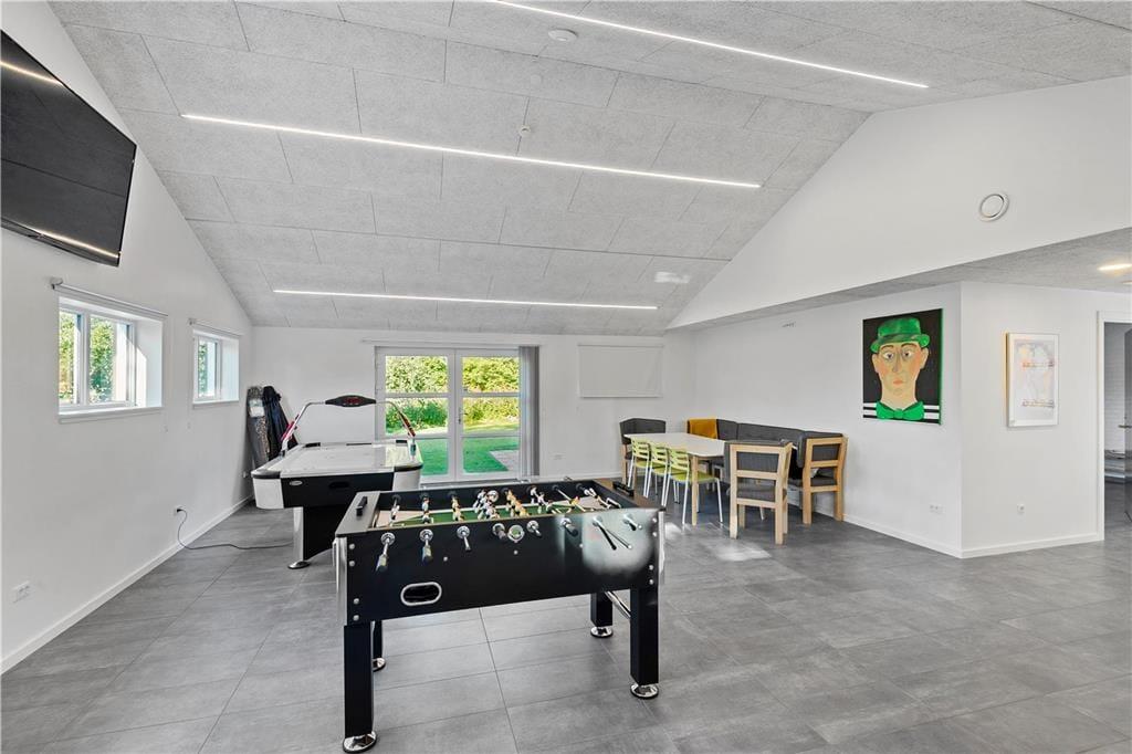 Wenn man mit vielen Leuten einen gemeinsamen Urlaub verbringt, haben nicht immer alle Lust, das Gleiche zu unternehmen. In diesem Fall bietet das Ferienhaus ganze drei verschiedene Aufenthaltsräume – einen Raum in offener Verbindung mit der Küche, in dem man sich an den großen Esstischen mit Gesellschaftsspielen vergnügen kann, ein Wohnzimmer mit zwei Sofagruppen und mehreren Kuschelecken, wenn man sich etwas zurückziehen möchte, sowie einen Aktivitätsraum mit u. a. Tischfußball und Sauna.