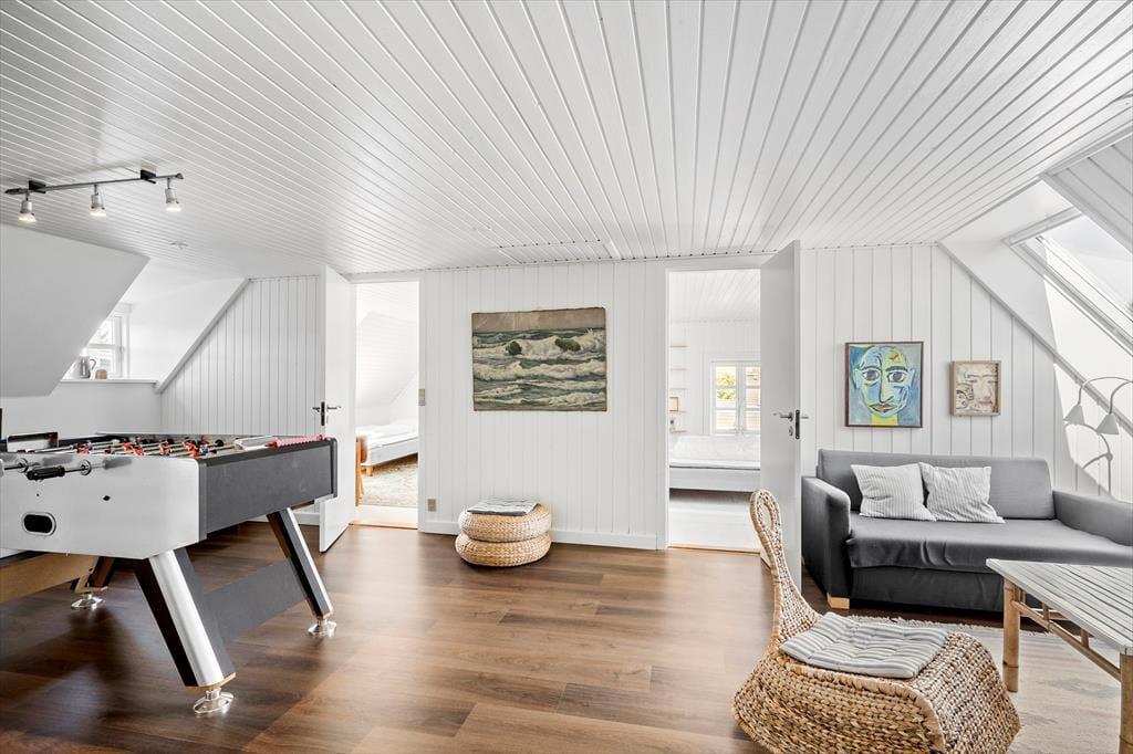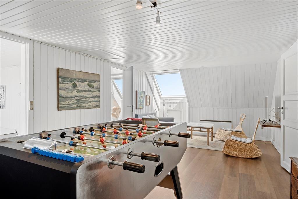 Das 350 m2 große Sommerhaus liegt sehr schön mit Blick auf das Wattenmeer zum Festland und zum Rømø-Damm. Die wunderschöne natürliche Umgebung kannst du bereits bei deiner Ankunft genießen, wenn du zur Tür hereinkommst und dich in den schönen Eingangsbereich begibst, und sowohl vom Erdgeschoss als auch vom ersten Stock aus den Meerblick genießen. Auch das Haus selbst verdient Beachtung, denn es wurde 2017 renoviert, sodass alle Räume hell und gepflegt wirken. In diesem Haus wurde Augenmerk daraufgelegt, dass viele gemütlich zusammen sein können, denn es gibt neun Schlafzimmer und fünf Badezimmer, mit denen man gut auskommen kann. Im Obergeschoss befinden sich eine Küchenzeile und ein Wohnzimmer mit Tischfußball, außerdem hast du in der Wohnküche, dem Aktivitätsraum und dem Wohnzimmer im Erdgeschoss viel Platz, um dich gemeinsam zu vergnügen.