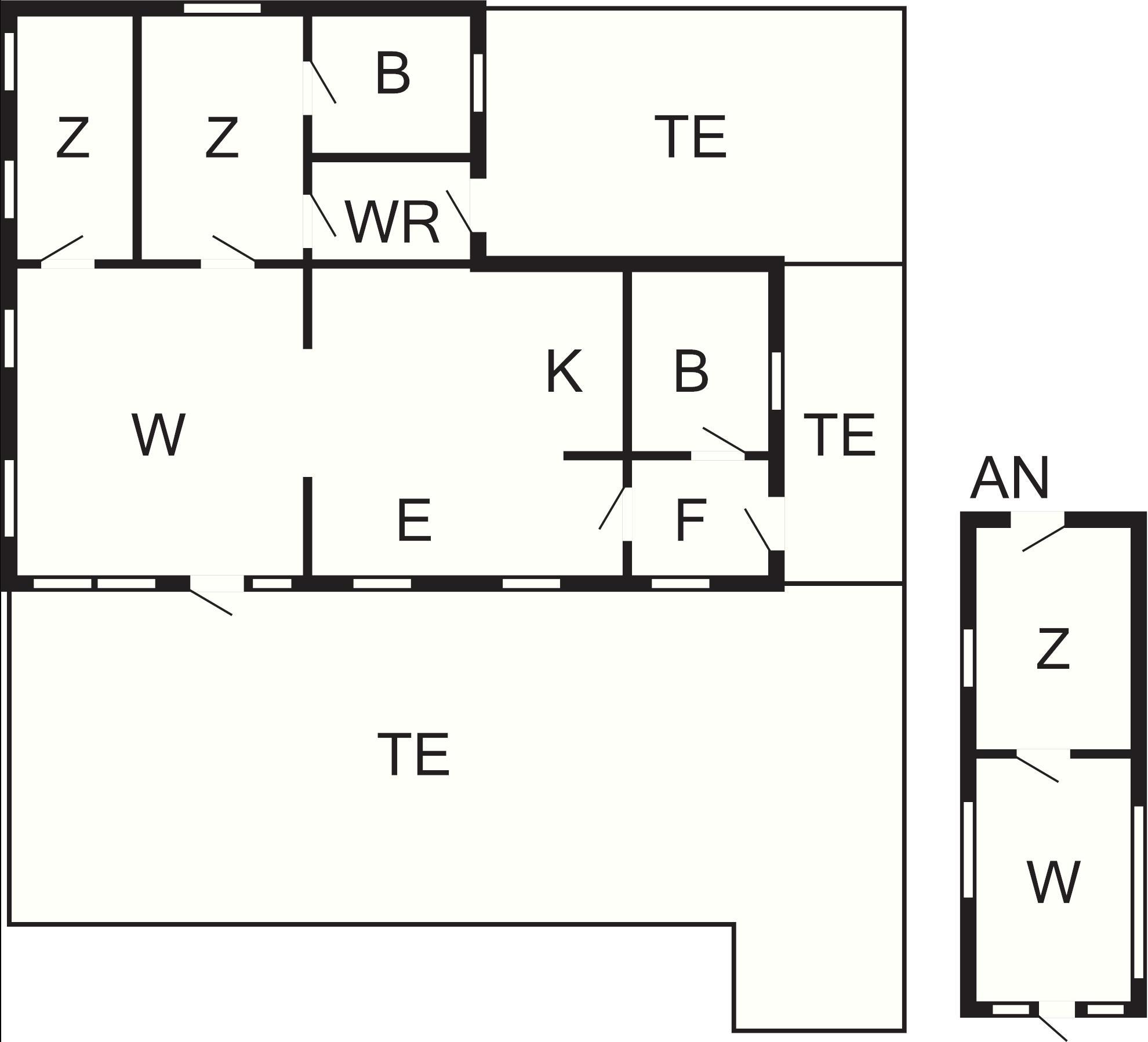 Das Ferienhaus verfügt über zwei Schlafzimmer mit jeweils zwei Betten sowie einen separaten Anbau mit zwei Einzelbetten und einem kleinen Sofazimmer mit Kühlschrank und großer Glasfront, von der aus Sie den Blick über die Felder genießen können. Der Anbau liegt direkt gegenüber dem Ferienhaus und bietet bequemen Zugang zu einem eigenen Badezimmer im Haus.