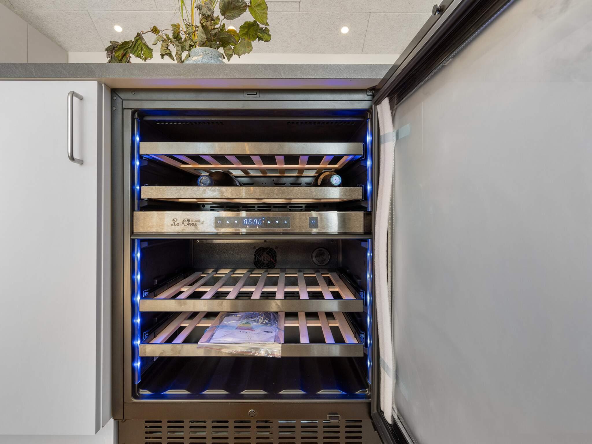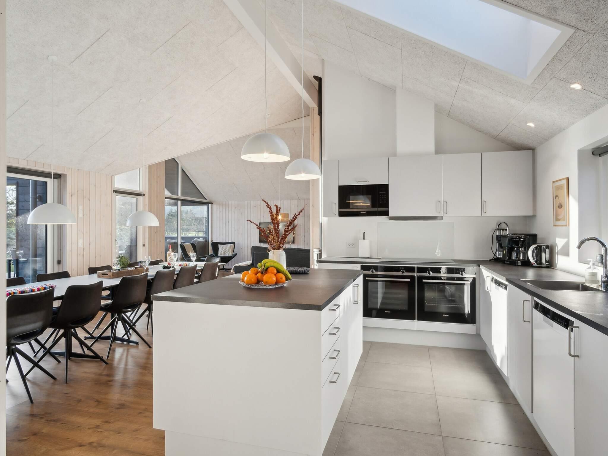 Viele Stunden lassen sich auch in der großen Wohnküche verbringen. Hier finden alle 18 Personen Platz, um den großen Esstisch und den Fernseher herum, wo man abends einen Film genießen kann. Für noch mehr Gemütlichkeit sorgt der Holzofen im Küchen-Essbereich. Wer lieber draußen kocht und isst, kann den Grill und die Gartenmöbel auf der Terrasse nutzen.