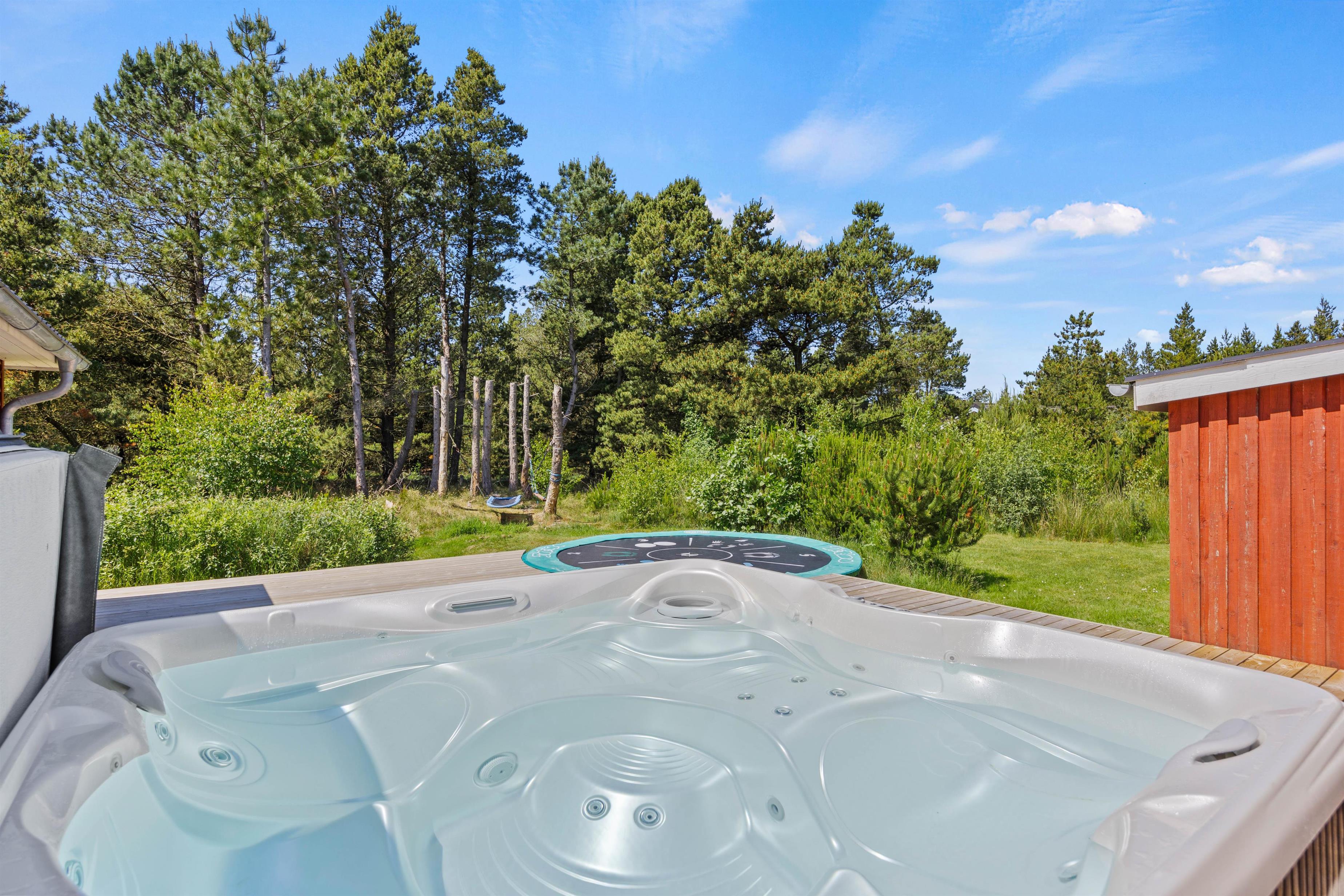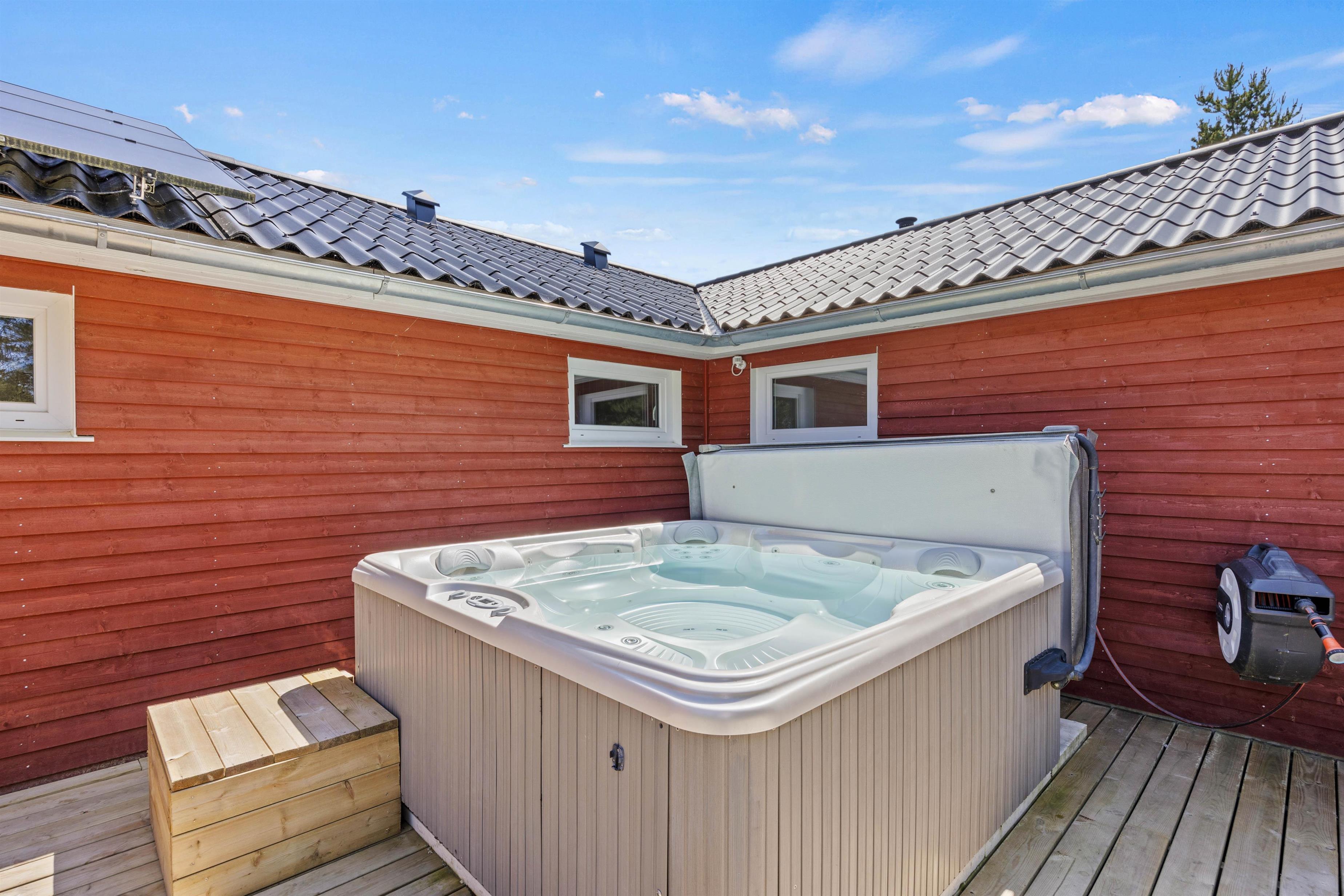 The outdoor hot tub, which seats five people, offers the perfect spot to unwind while gazing at the night sky.