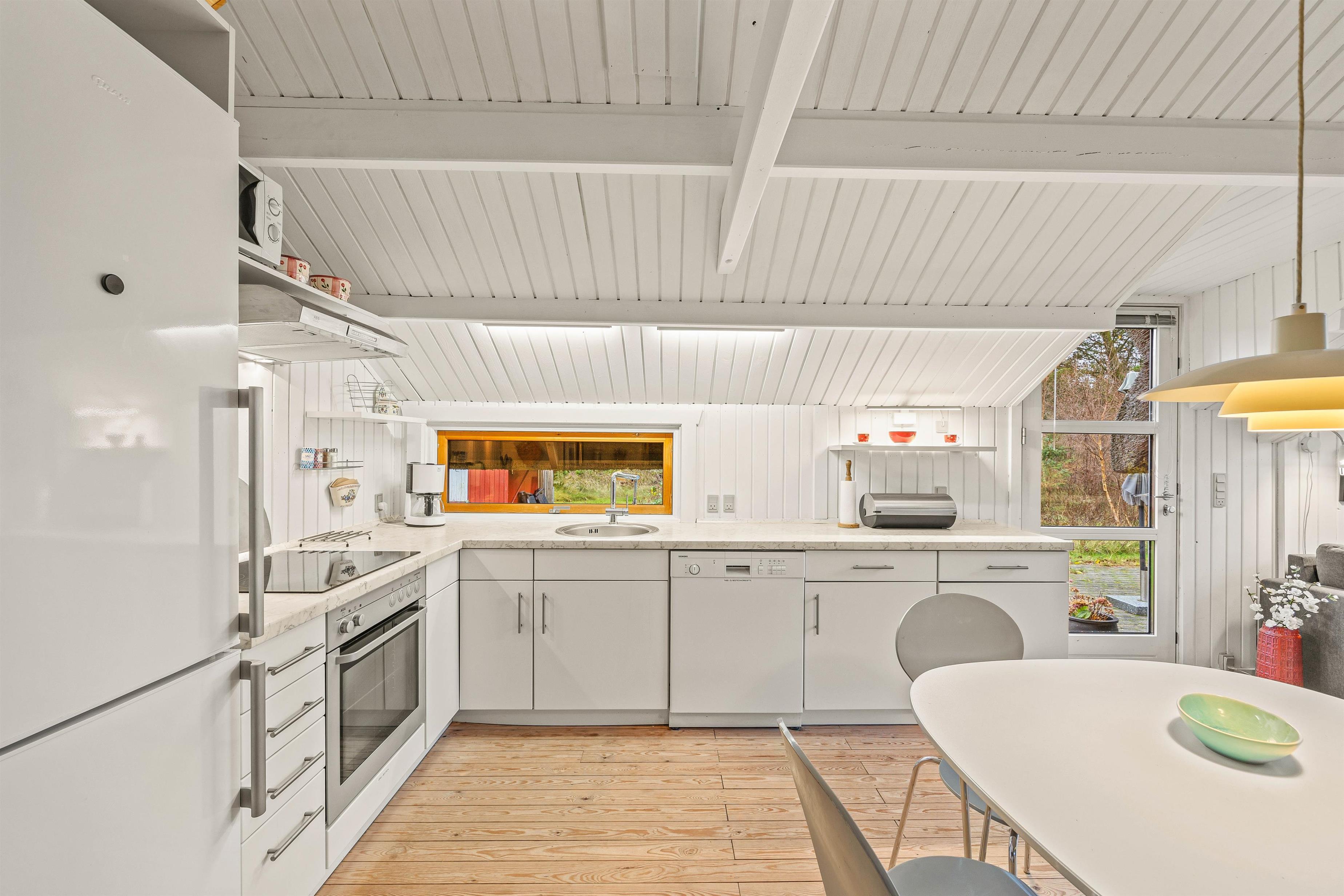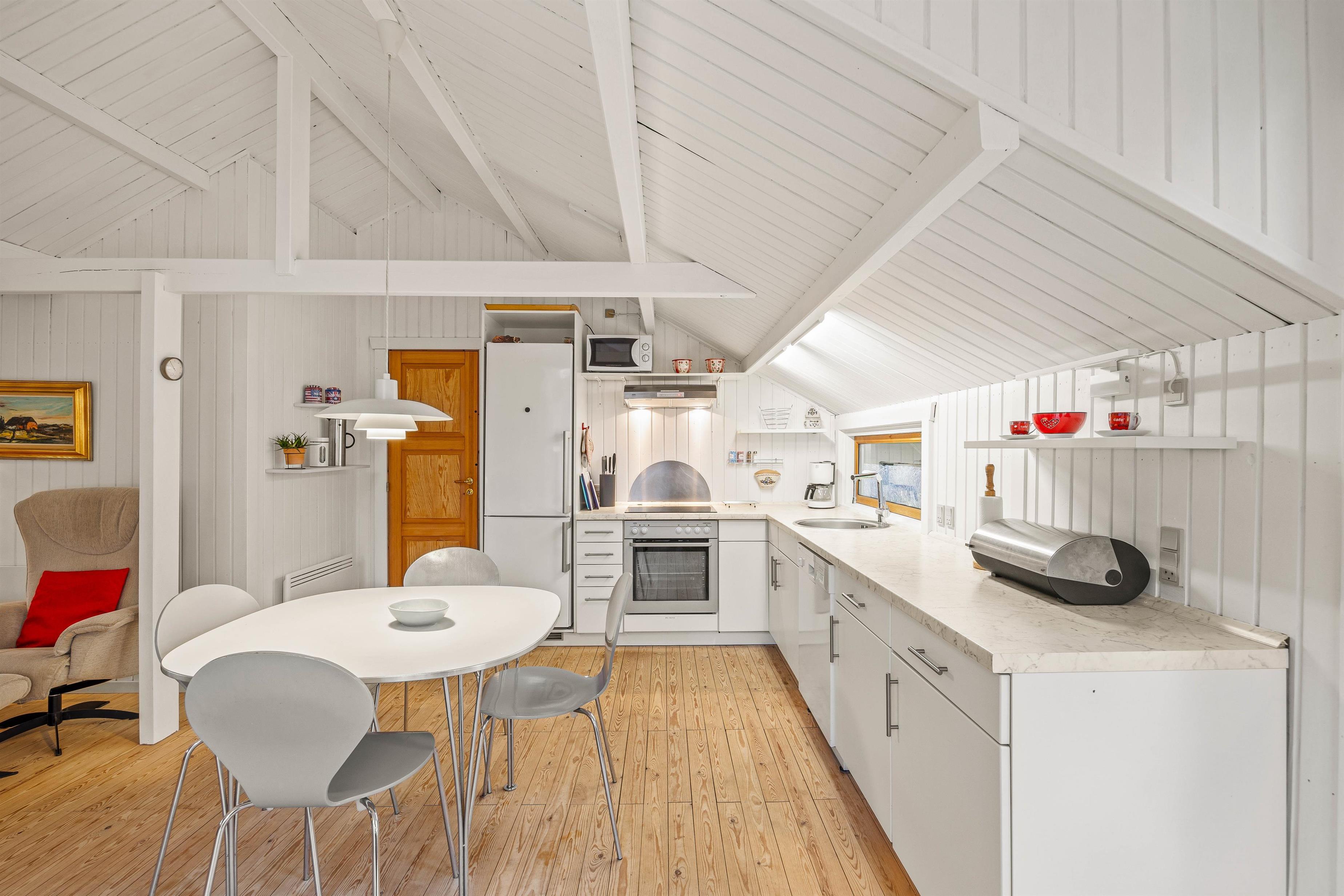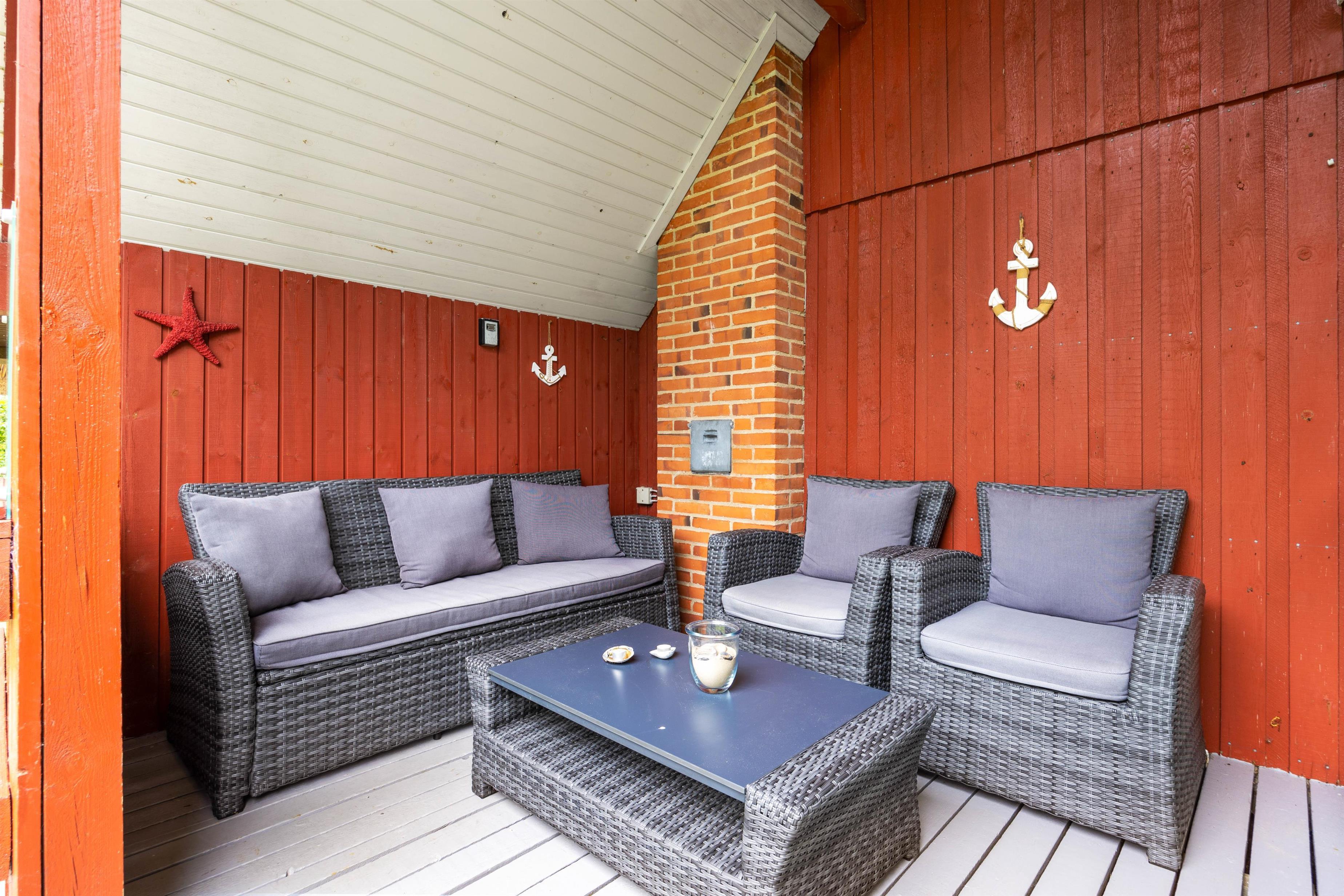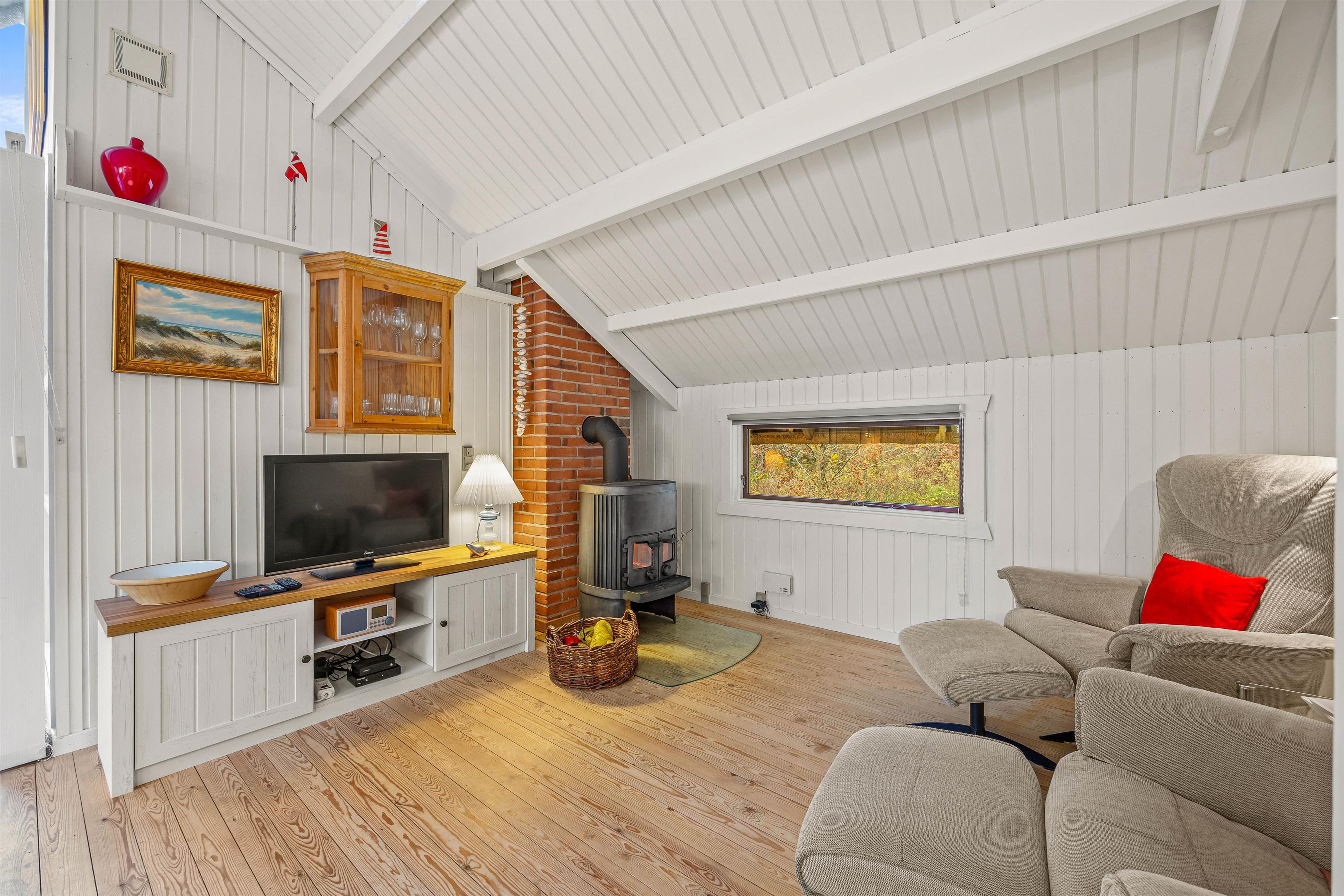 The holiday home, renovated in 2005, measures 62 square metres and features a beautiful thatched roof. The welcoming interior has an open-plan design incorporating the kitchen, living room and dining area. Spend your evenings relaxing in comfortable armchairs by the crackling wood-burning stove, enjoying the peaceful surroundings. Large windows offer wonderful views outside, and the living room provides direct access to the covered, well-equipped terrace with comfortable seating.