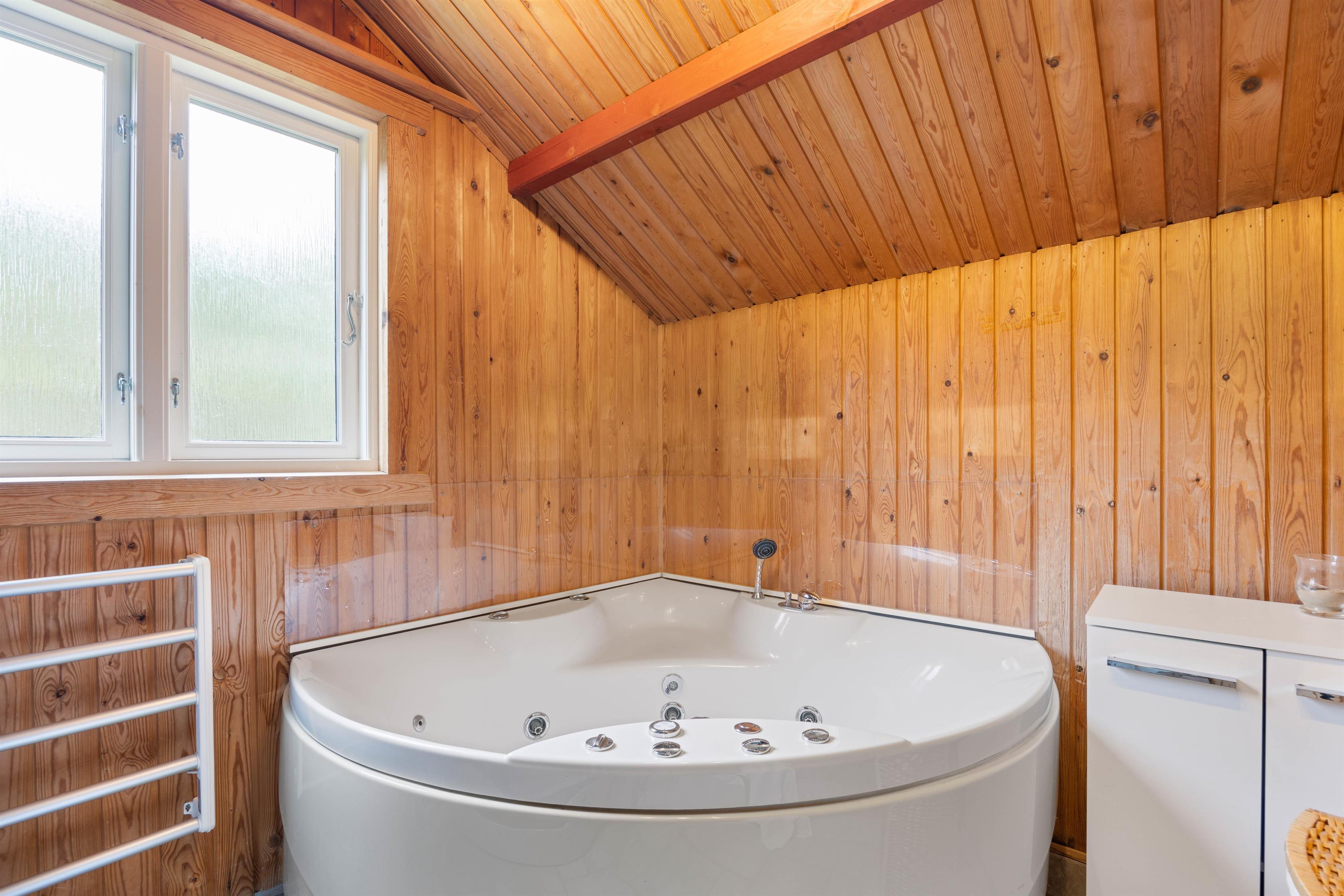 The holiday home features a large bathroom divided into two connected sections. One area contains a shower and WC, while the second includes a lovely whirlpool for two people and an additional shower. This area also benefits from underfloor heating.