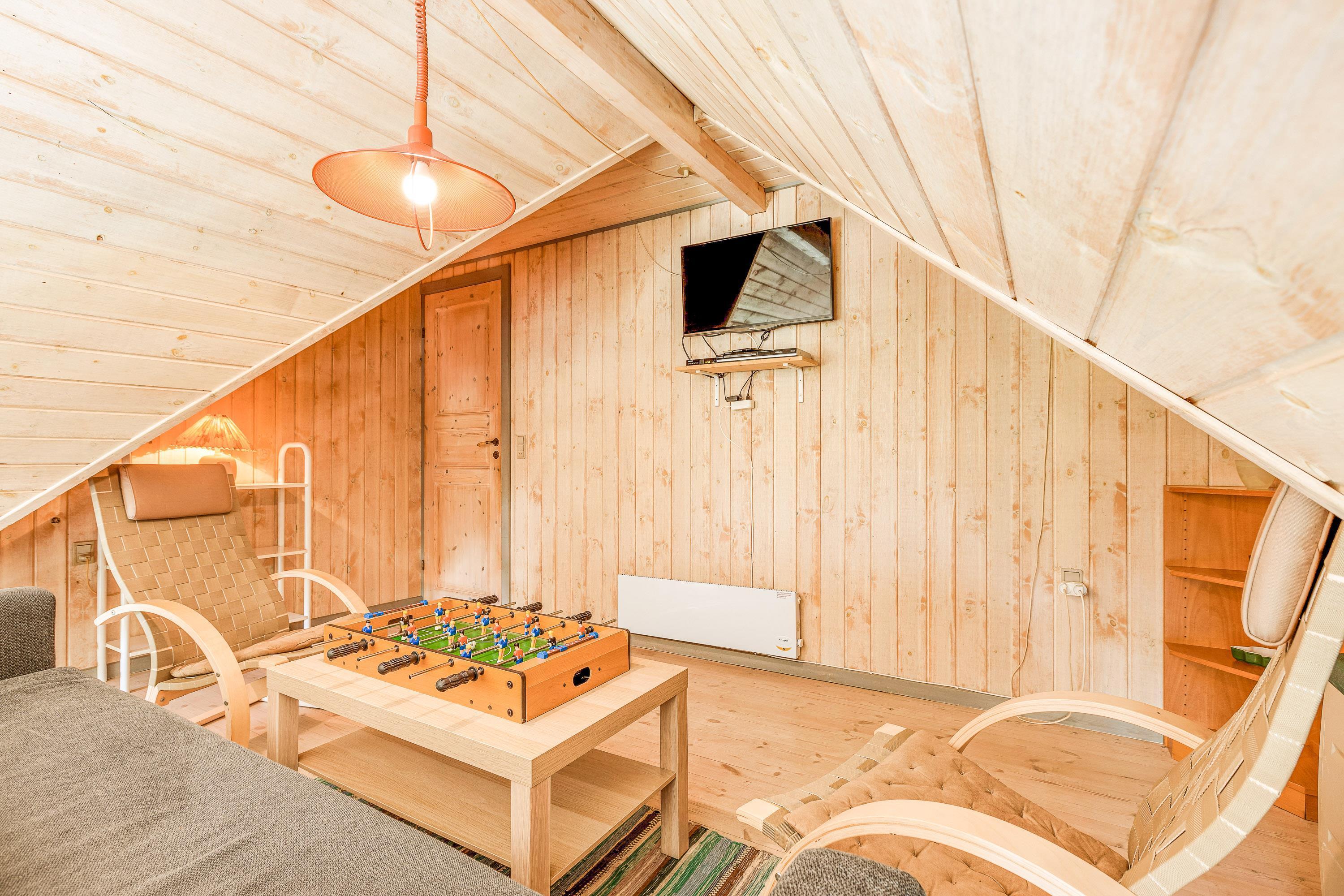 The tasteful décor spans two floors with two spacious living areas. Special architectural features include south-facing panoramic windows and a converted loft space, totalling 44 square metres with generous, light-filled layouts. The living area offers comfortable leather sofas, a 70-inch 4K UHD LED Smart TV with Chromecast, 5.1 surround sound with Bluetooth, satellite TV, Blu-ray player, stereo system with CD player, wireless phone charging, and an efficient wood-burning stove. A powerful heat pump provides warmth in winter and air conditioning in summer. The living area windows overlook the pool area.