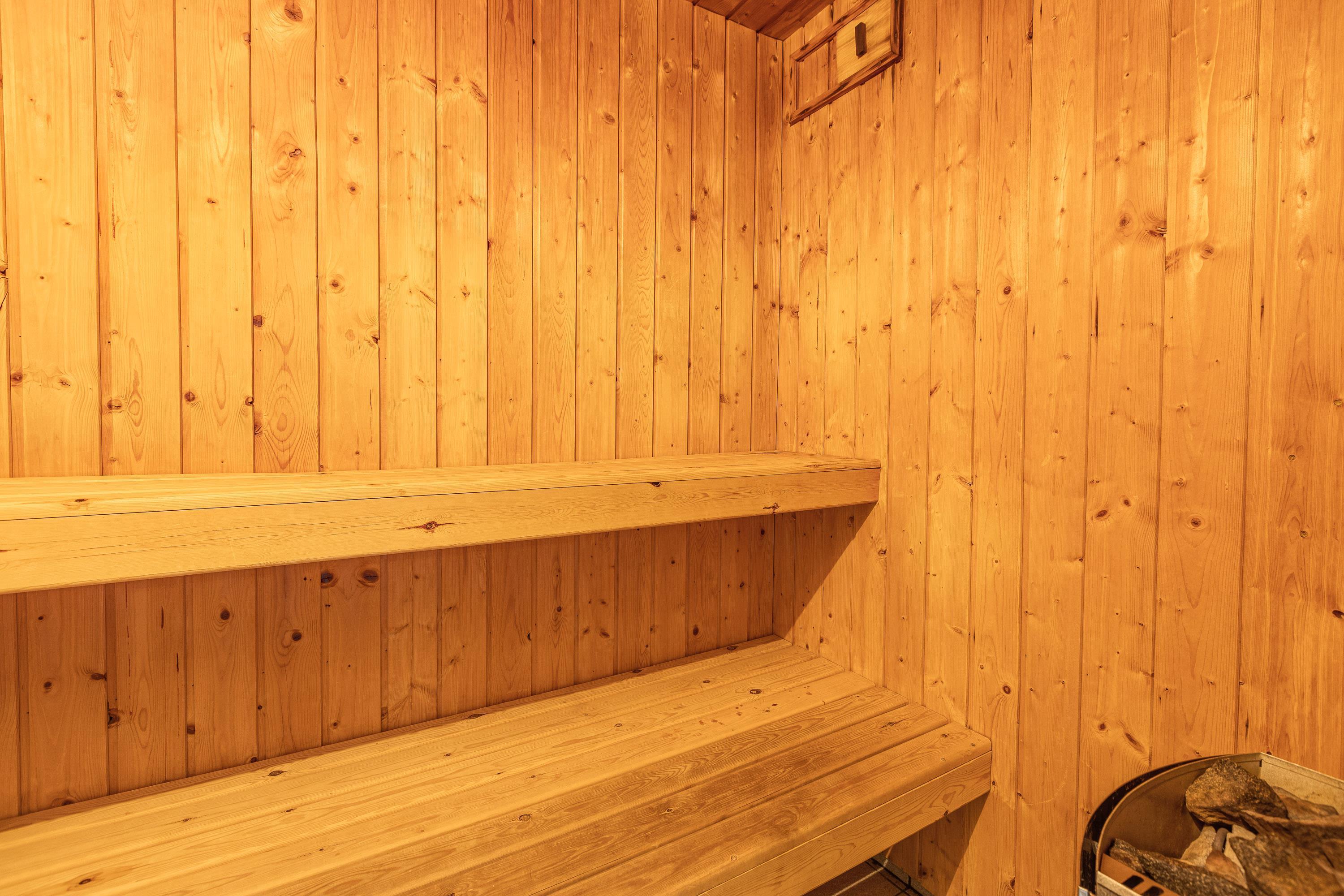 Two bathrooms were renovated in 2015, one featuring a sauna. Both include toilets, shower enclosures, and non-slip tiles. The larger bathroom contains a washer/dryer, and the sauna features two full-length benches. Underfloor heating is installed in the bathrooms, kitchen, dining room, and pool area.