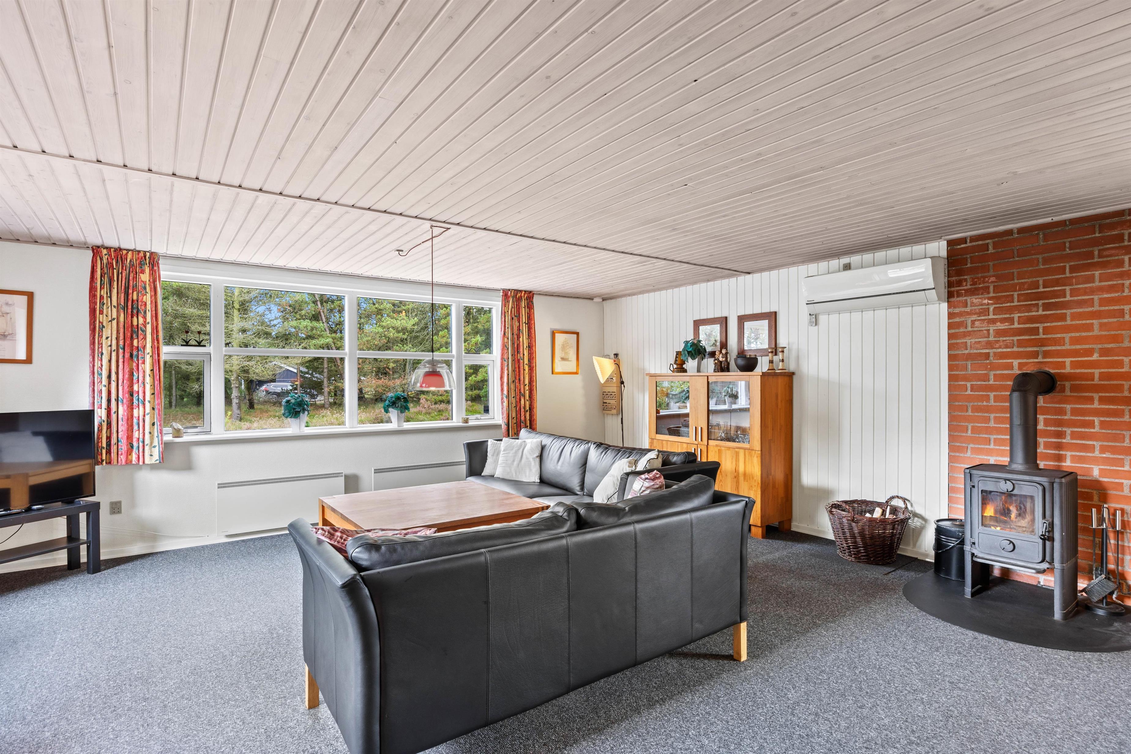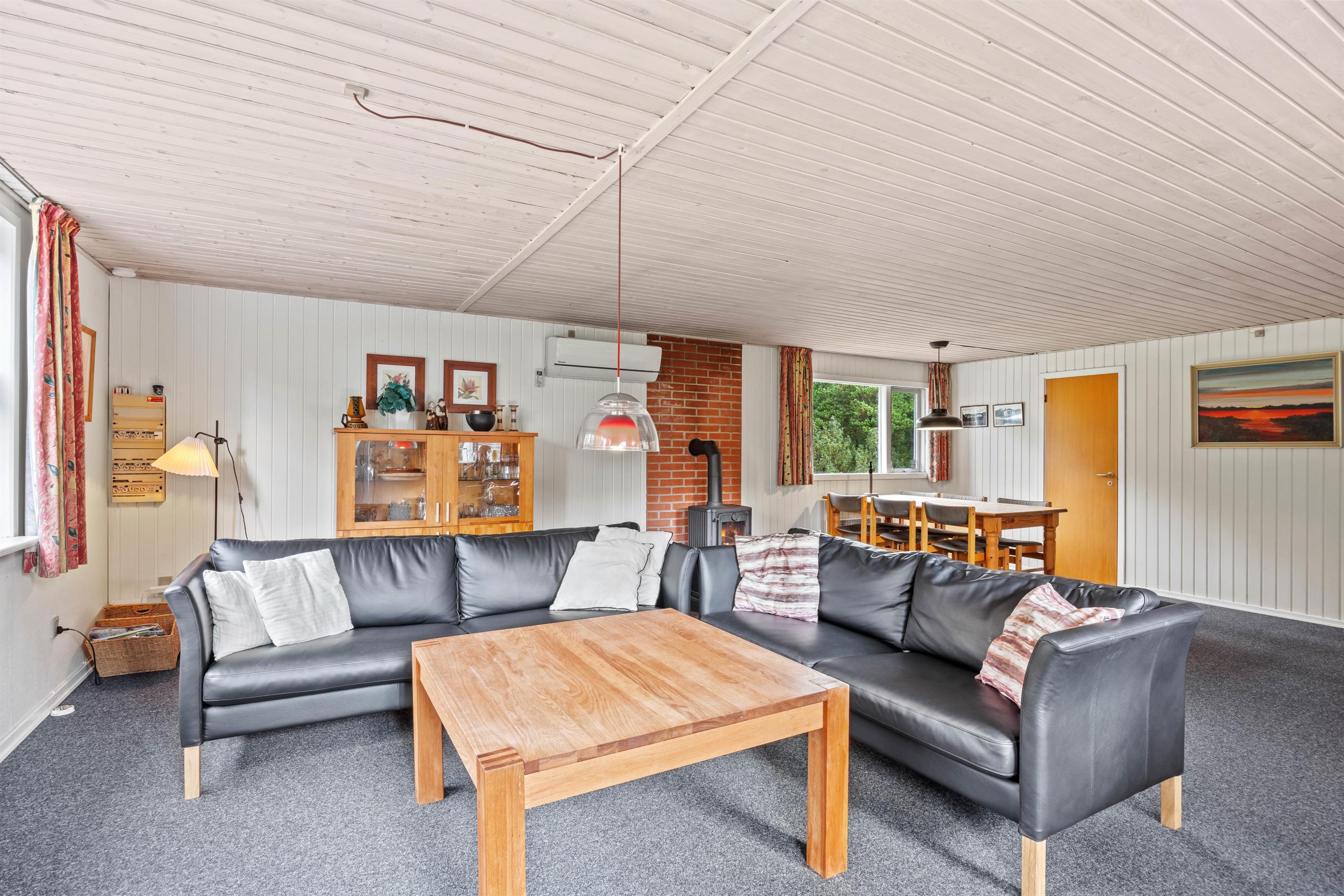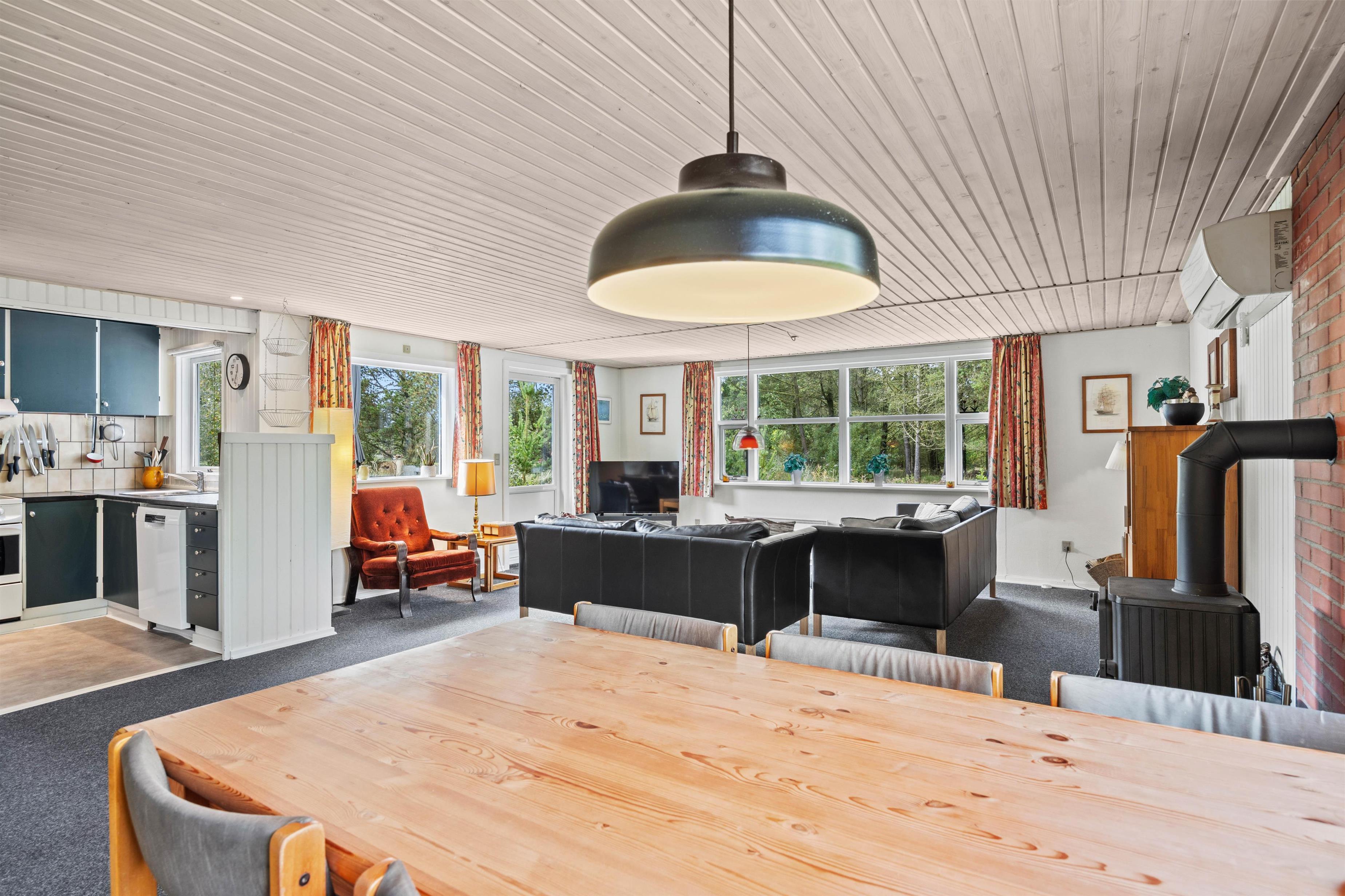 Moving further into this classic holiday home, you'll find the practical fitted kitchen, equipped with a dishwasher, microwave, and fridge-freezer. The kitchen opens onto the dining area, which flows into the living room. The wood-burning stove provides not only cosy warmth but creates a comfortable atmosphere with the crackling of wood. An energy-efficient heat pump is also available when needed.