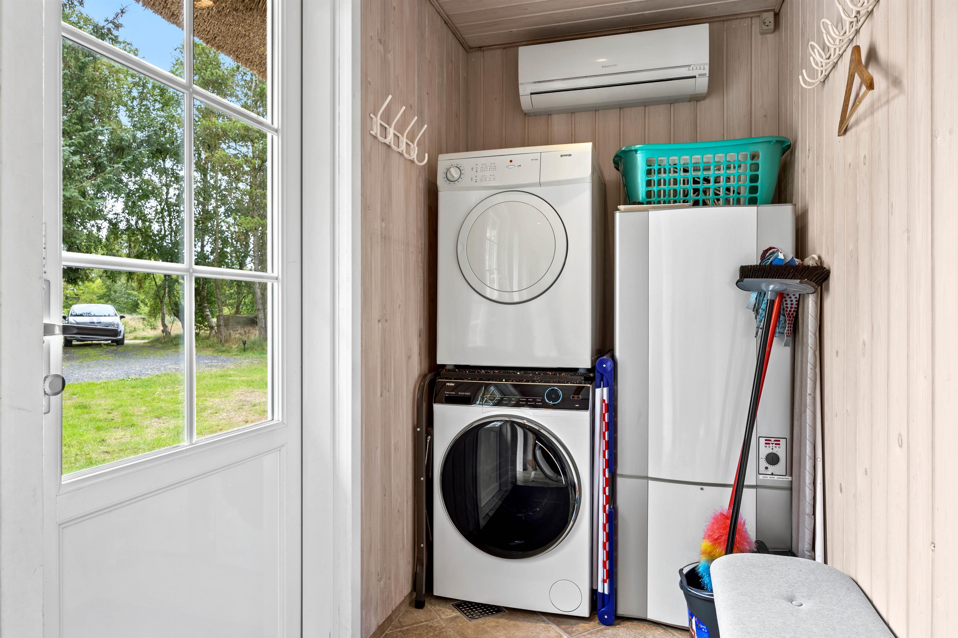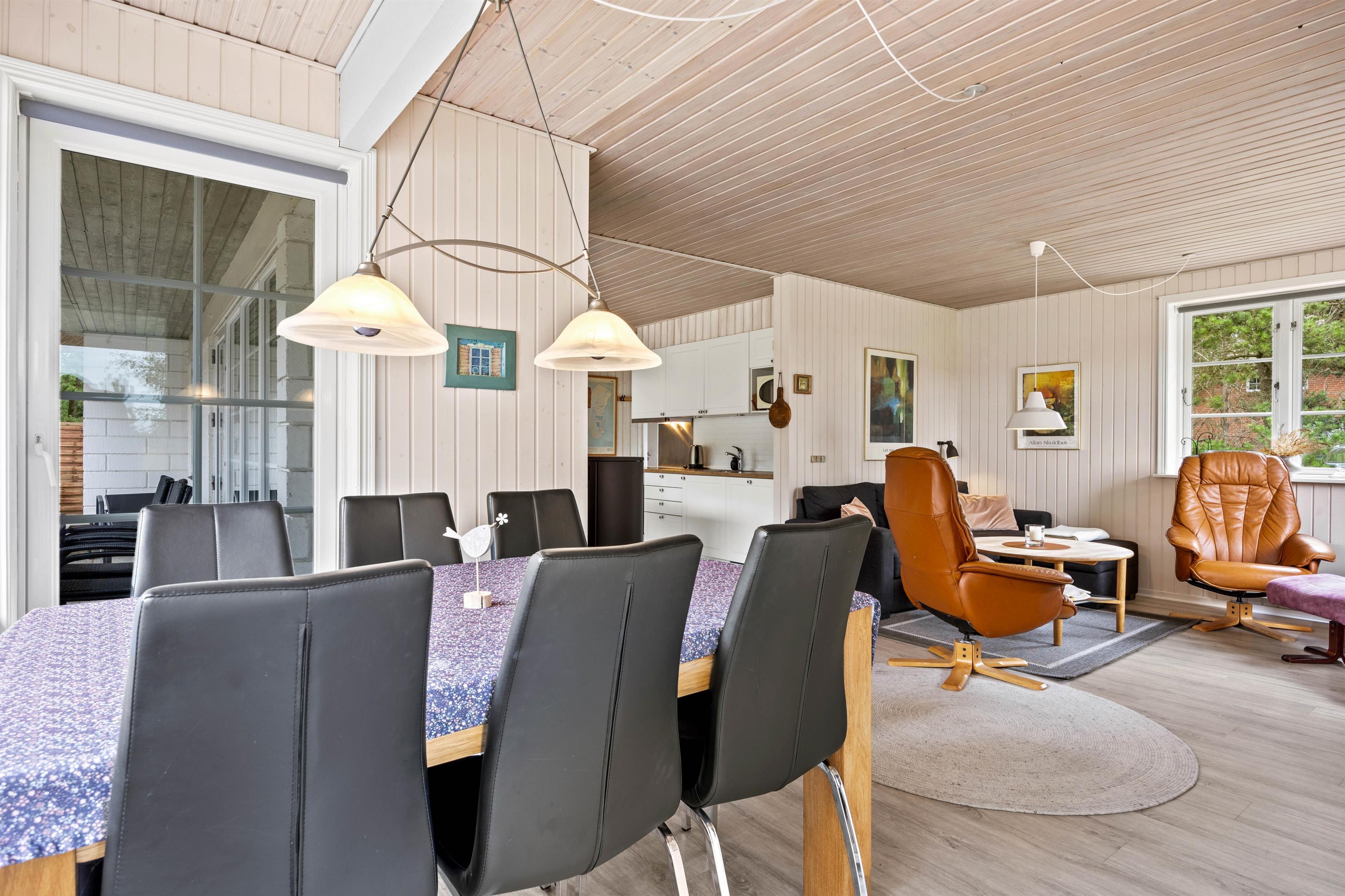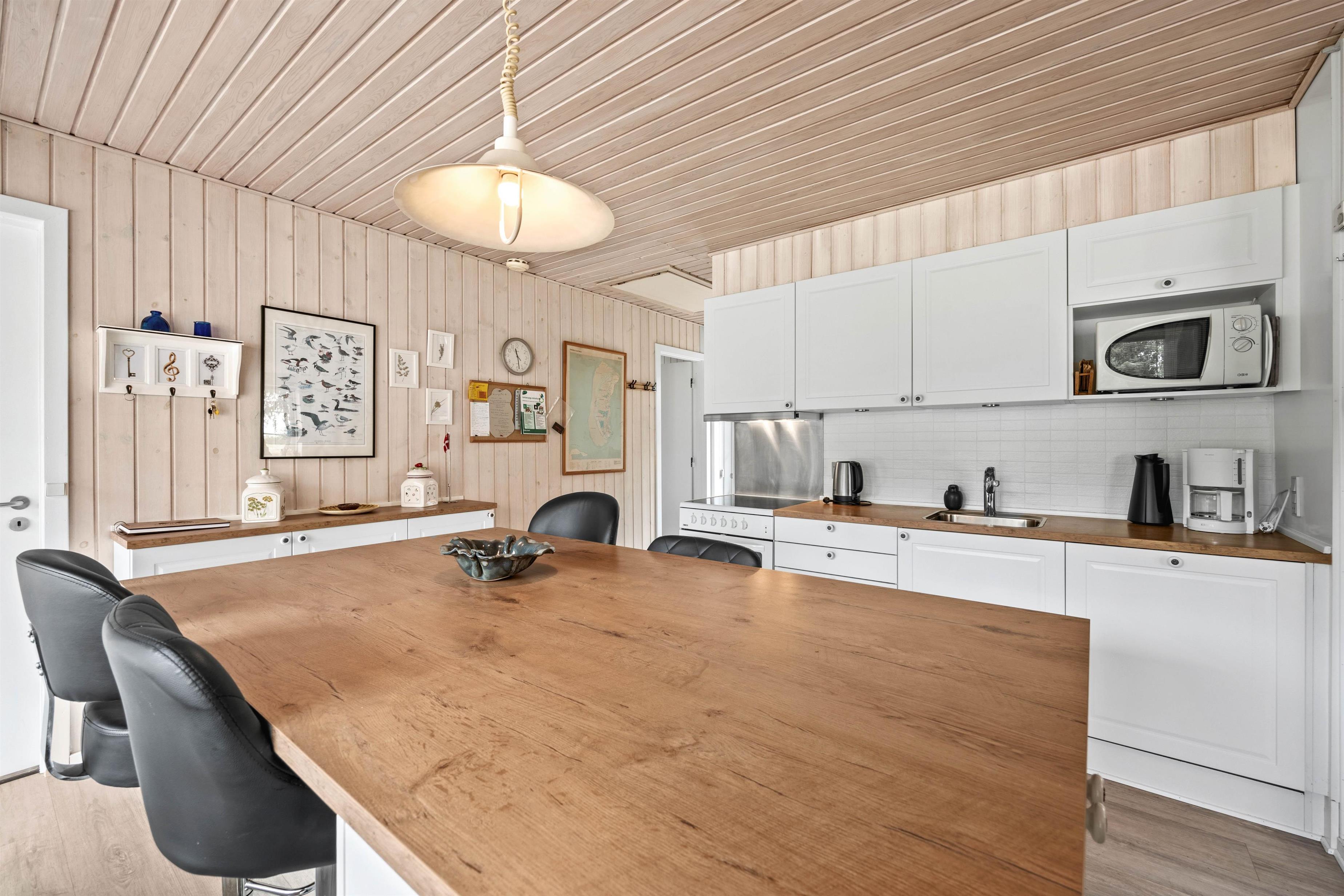 Upon entering this typical Scandinavian thatched house, you'll immediately notice the bright, light-filled living area. The comfortable sofa and TV armchairs are perfect for enjoying a DVD evening or an engaging book by the fire. The wood-burning stove is newly installed for 2024. Adjacent to this is the dining area, which also serves well for family game nights.