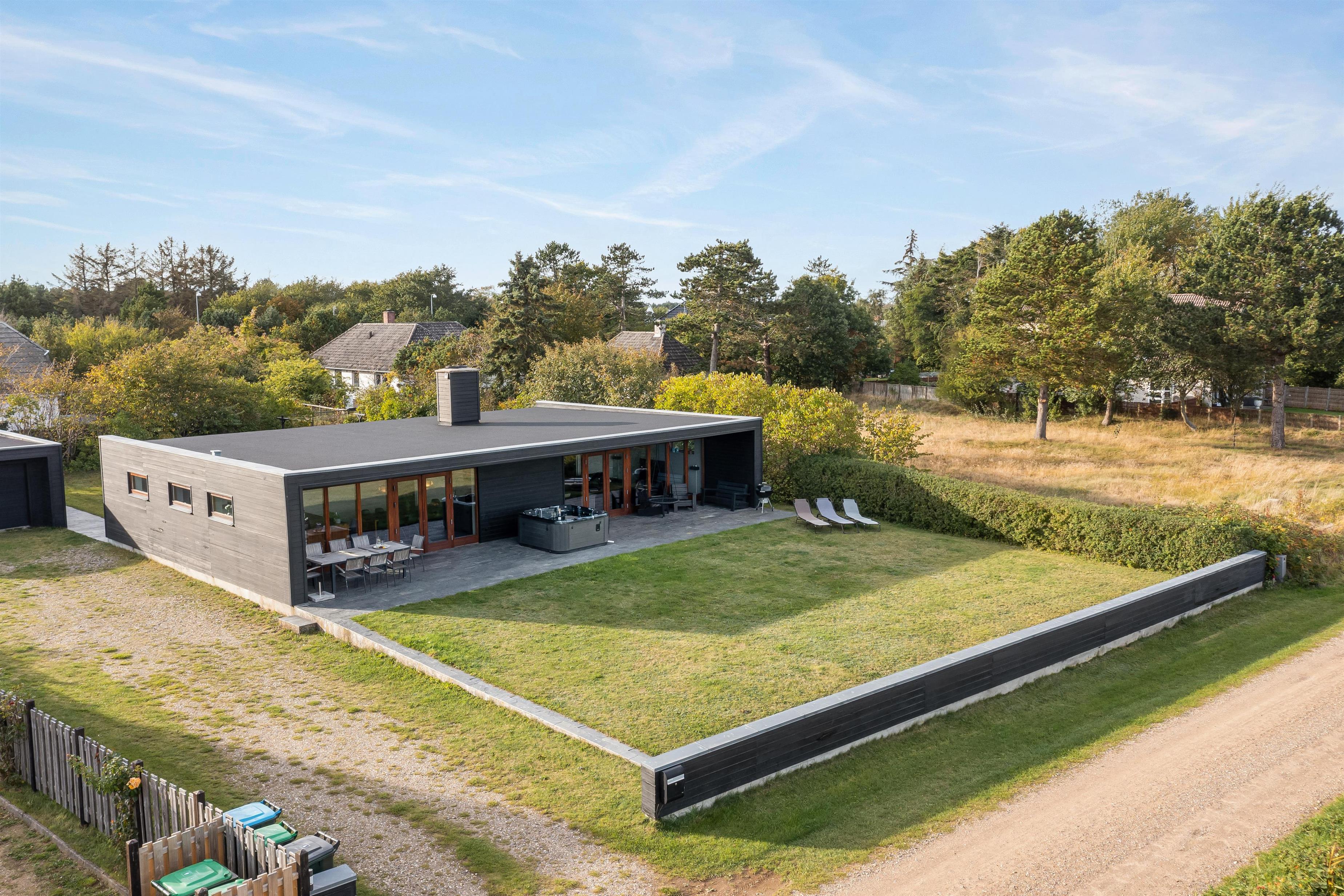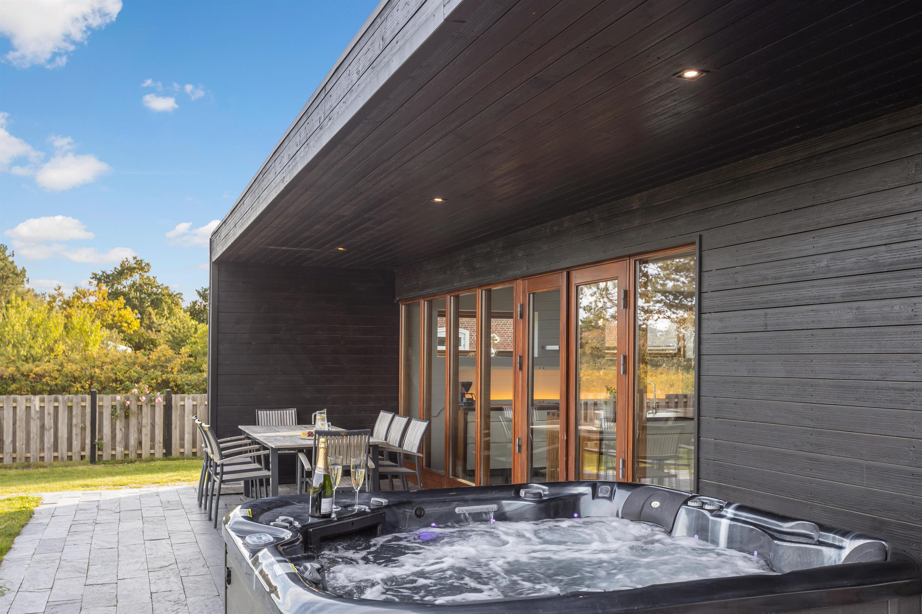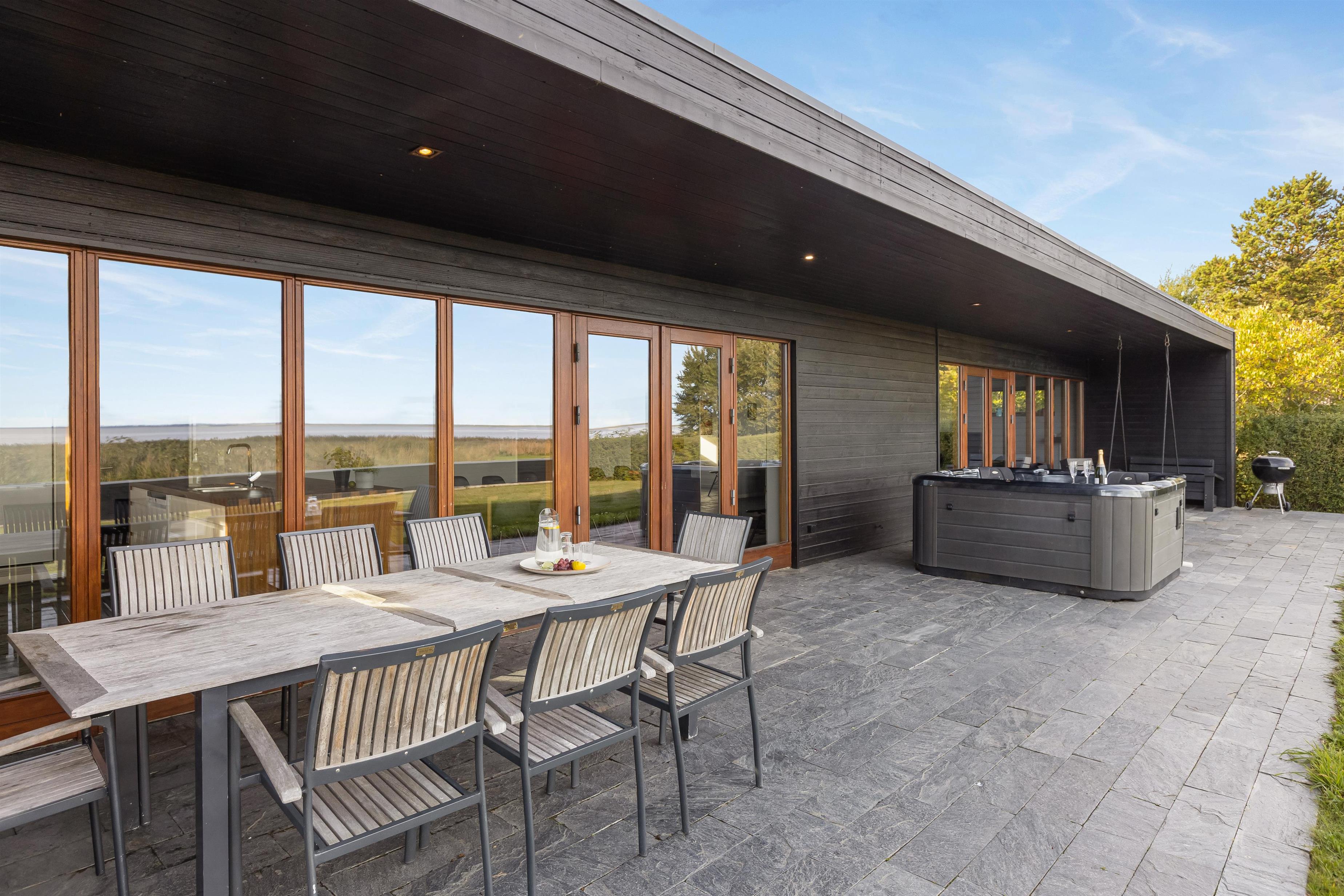 The spacious outdoor area features an extensive lawn, perfect for activities or a game of Viking chess (Kubb). The partially covered terrace is ideal for a family barbecue. In the evening, you can unwind in the outdoor hot tub with a glass of wine, enjoying beautiful views of the water and starlit sky.