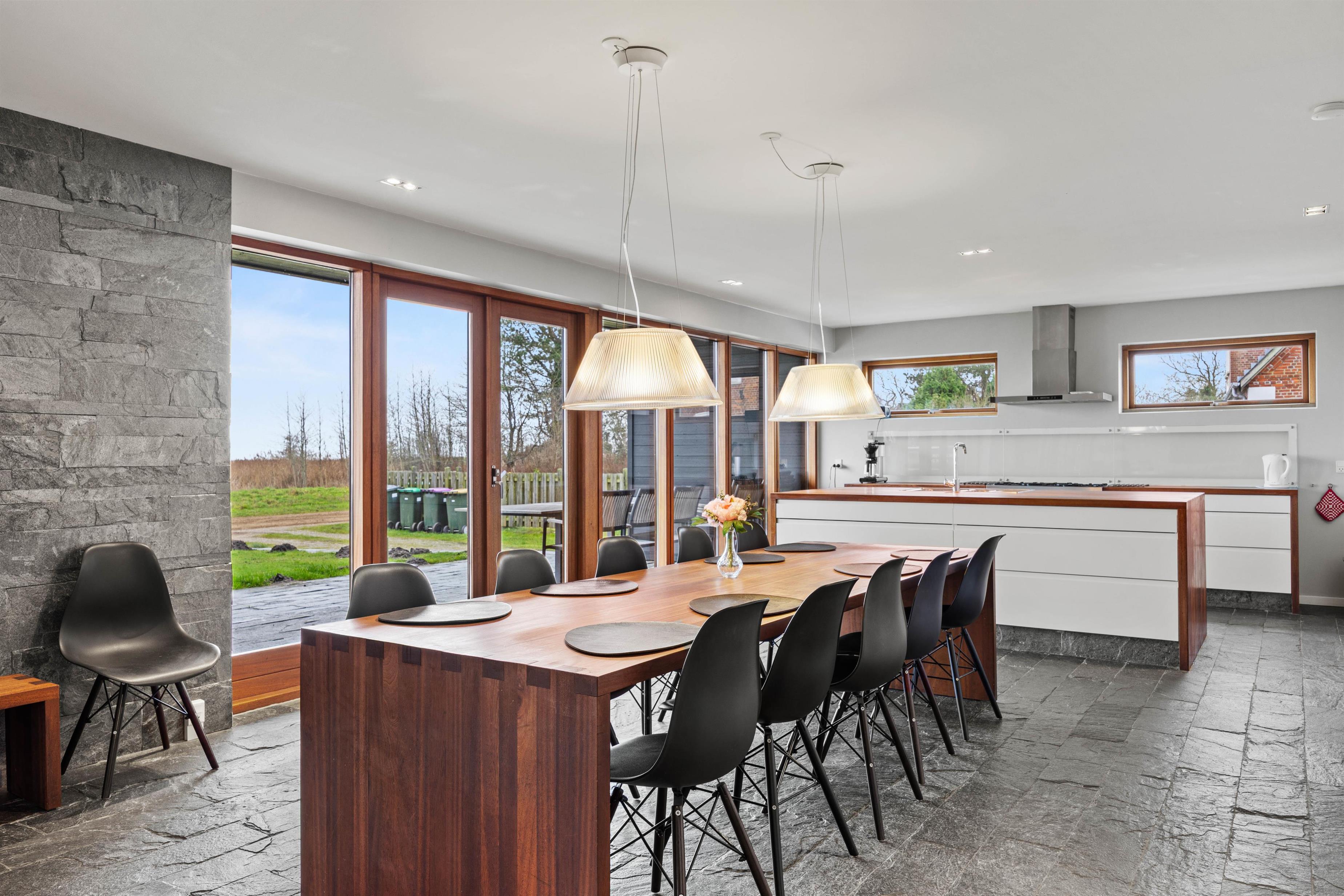 The open-plan kitchen offers plenty of space for cooking together and creating delicious meals. Equipment includes a dishwasher, microwave, fridge with 60-litre freezer compartment, and a premium gas stove. The holiday home can be fully heated using energy-efficient heat pumps. The entire main house features tiled floors with floor heating.