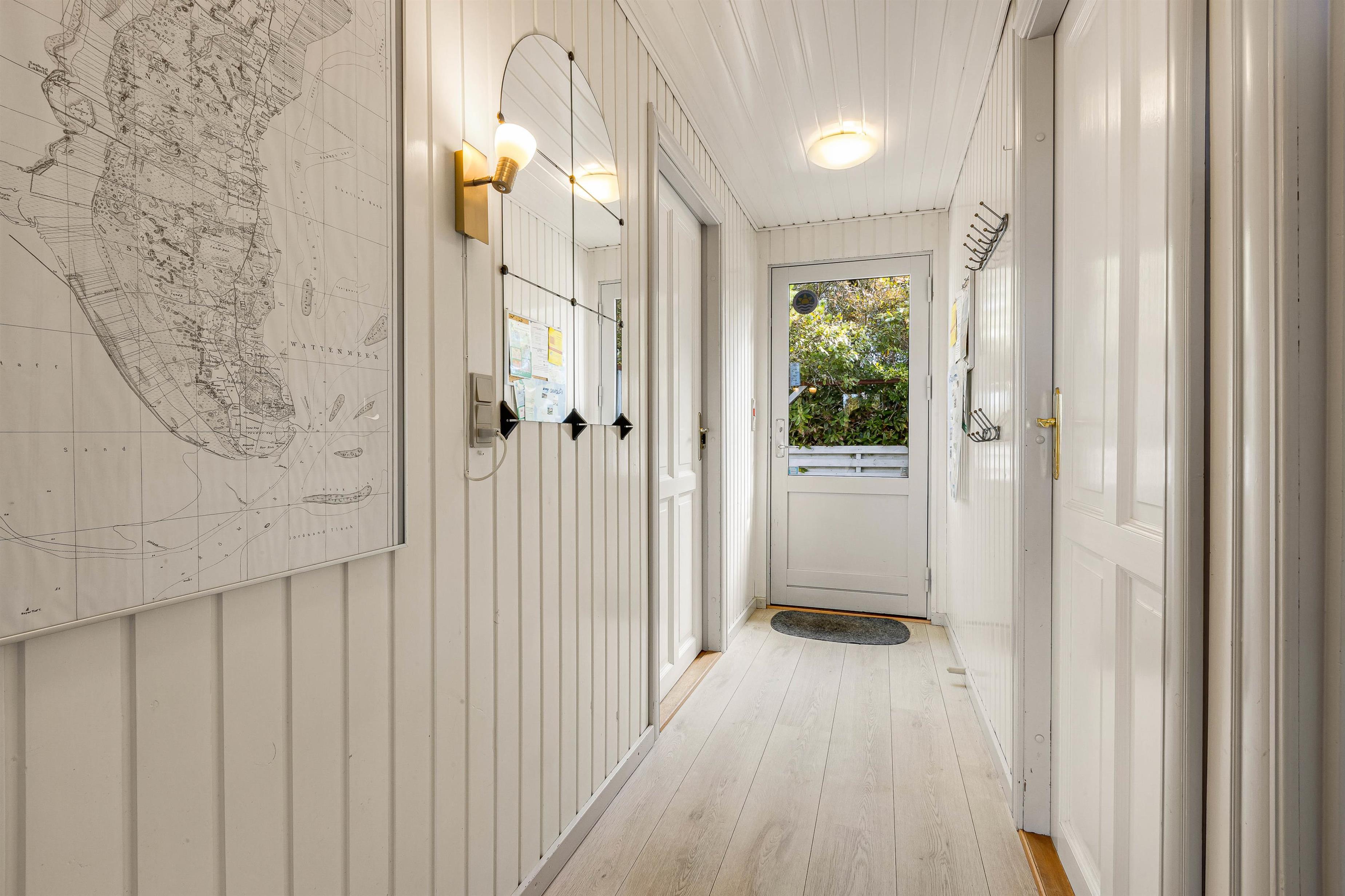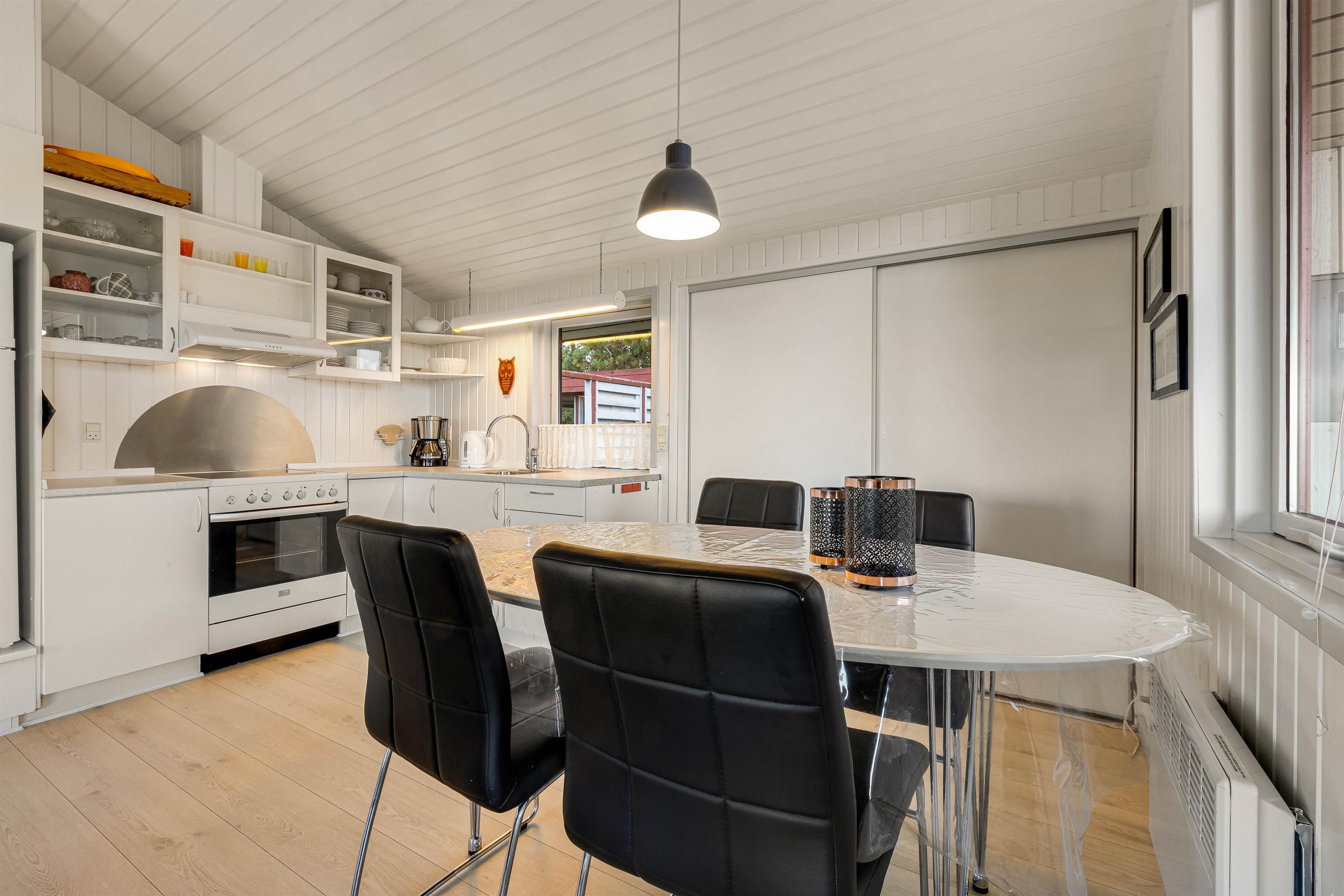 Plenty of natural light and an open-plan living and dining area await you here at Julianehåb 19. The comfortable seating area is perfect for evening television or reading a good book by the crackling fire. From here, you'll enjoy lovely views of the greenery. With the fireplace positioned in the centre of the room, its warmth reaches throughout the space. An energy-efficient heat pump provides additional heating.