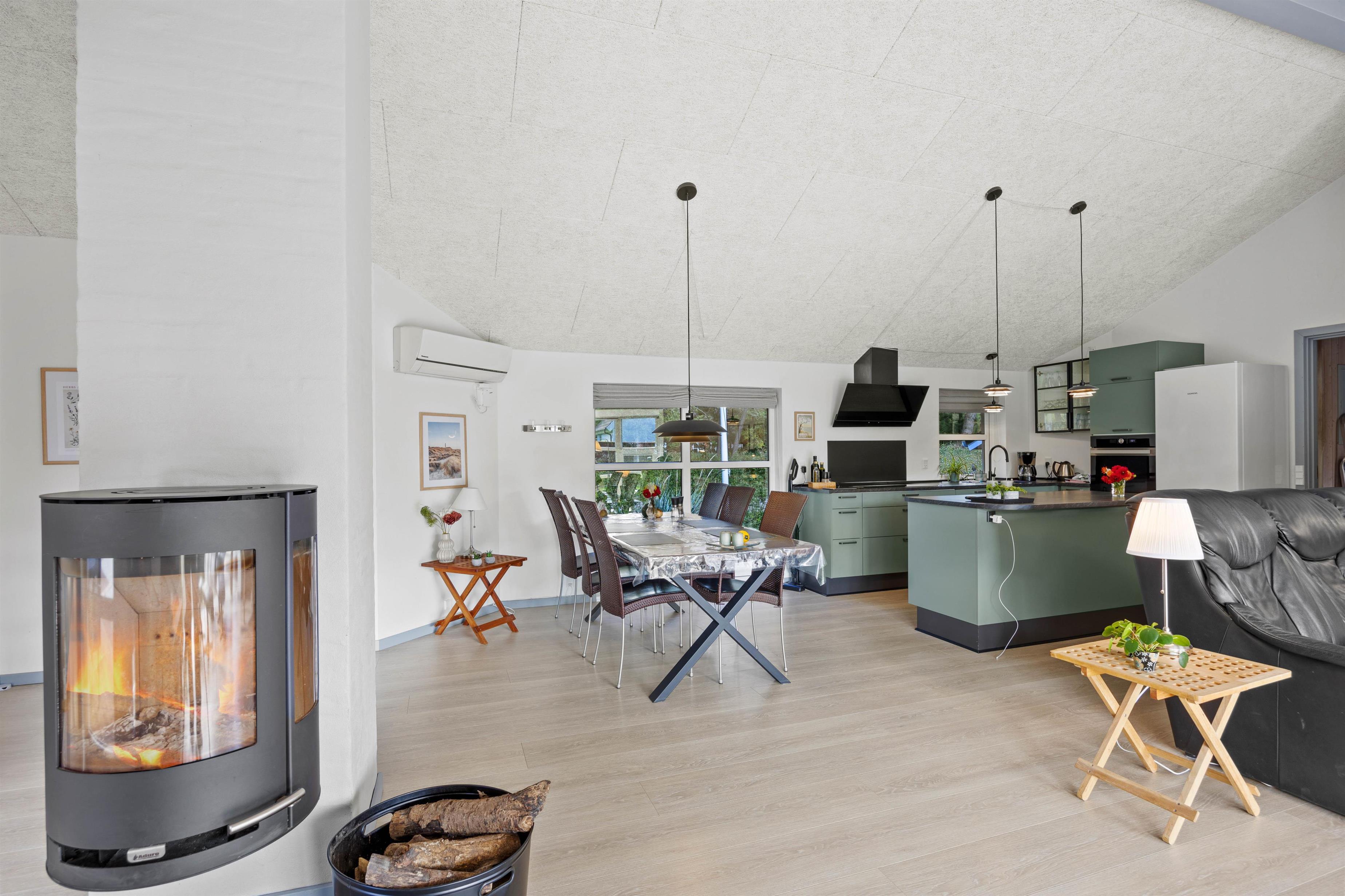 The spacious living area invites you to relax with its large dining table, comfortable leather sofa and armchairs. The laminate flooring in the living room and kitchen creates a warm atmosphere. You can watch German TV channels and cosy up in front of the wood-burning stove. Additionally, an energy-efficient heat pump provides excellent heating during the cooler months.