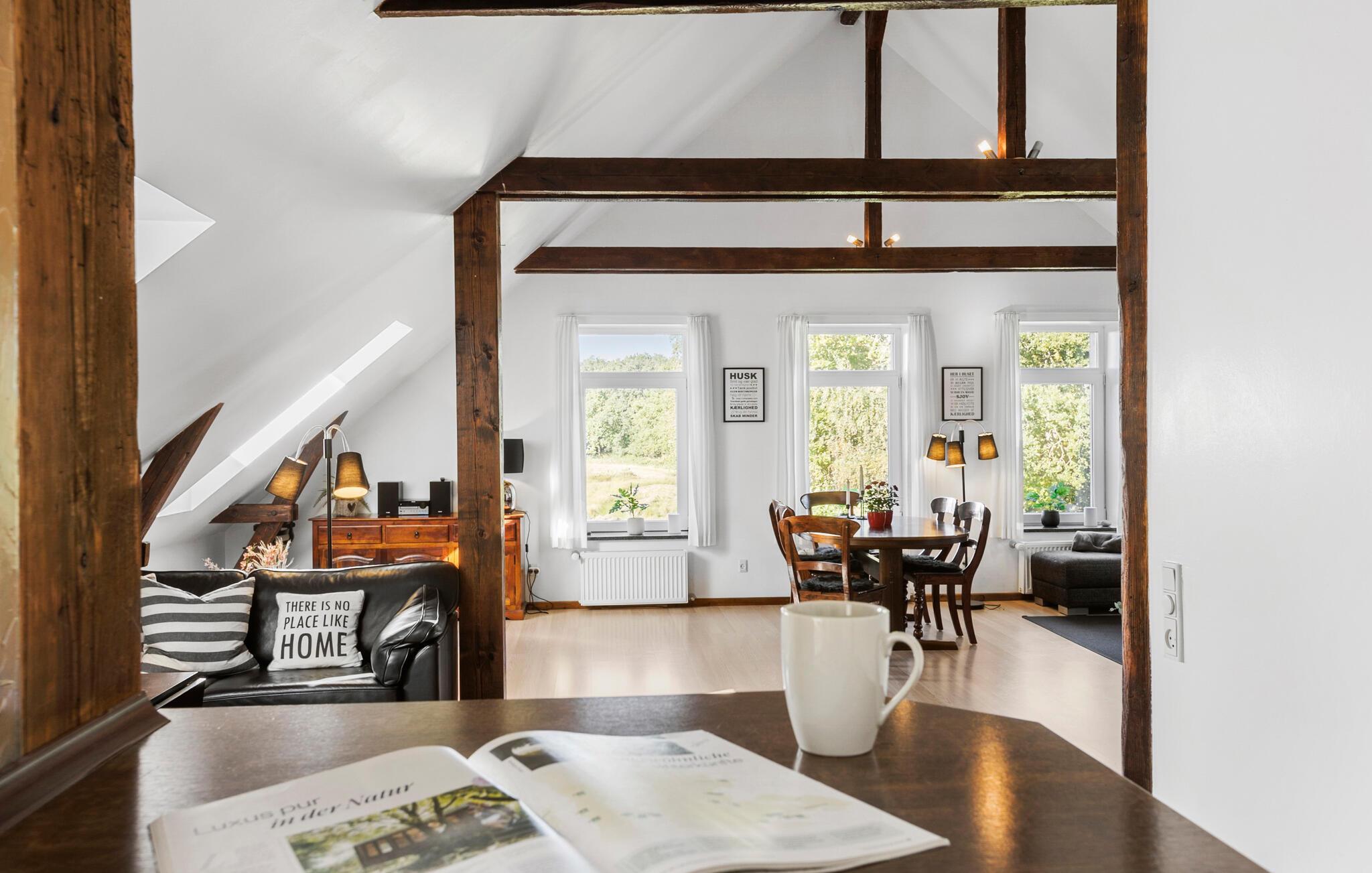 Der großzügige Wohnbereich mit seinen hohen Decken und rustikalen Holzbalken strahlt eine warme Atmosphäre aus. Machen Sie es sich auf den bequemen Sofas gemütlich und genießen Sie die Aussicht durch die großen Fenster oder lassen Sie sich von einem guten Buch in den gemütlichen Sesseln inspirieren. Die gut ausgestattete Küche lädt zum gemeinsamen Kochen ein. Genießen Sie die Mahlzeiten am urigen Holzesstisch mit Blick auf die ländliche Umgebung.