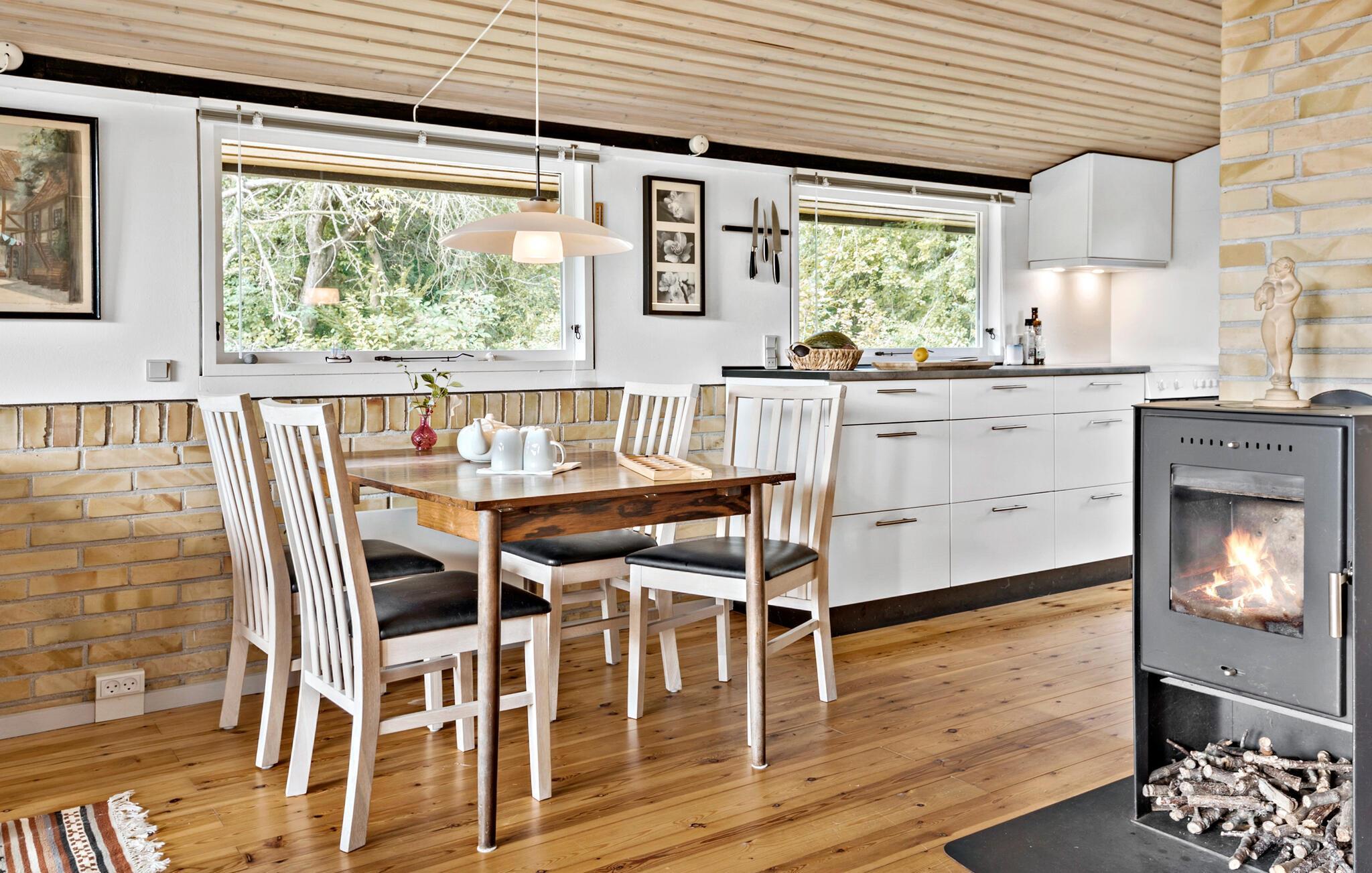 Ihr Ferienhaus am Kulhuse Strand bietet Ihnen einen offenen Wohn-, Ess- und Küchenbereich. Die Holzdecke und der schöne Holzfußboden sowie die rustikalen Backsteinelemente sorgen für eine warme, heimelige Atmosphäre, in der Sie sich wohlfühlen werden. Zünden Sie an kühlen Tagen den Kaminofen an und lassen Sie sich von der wohligen Wärme verwöhnen.