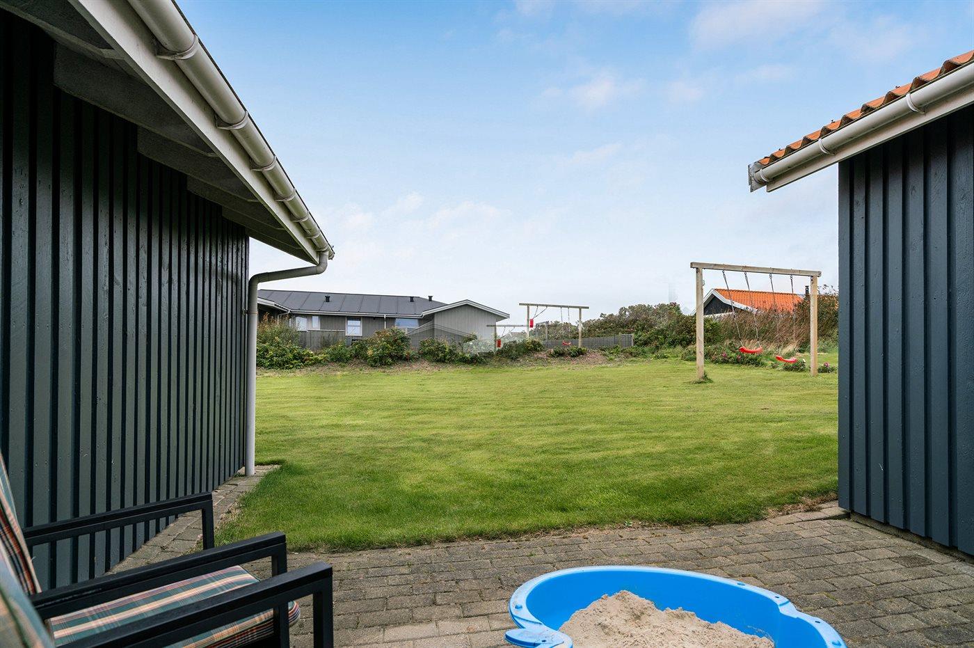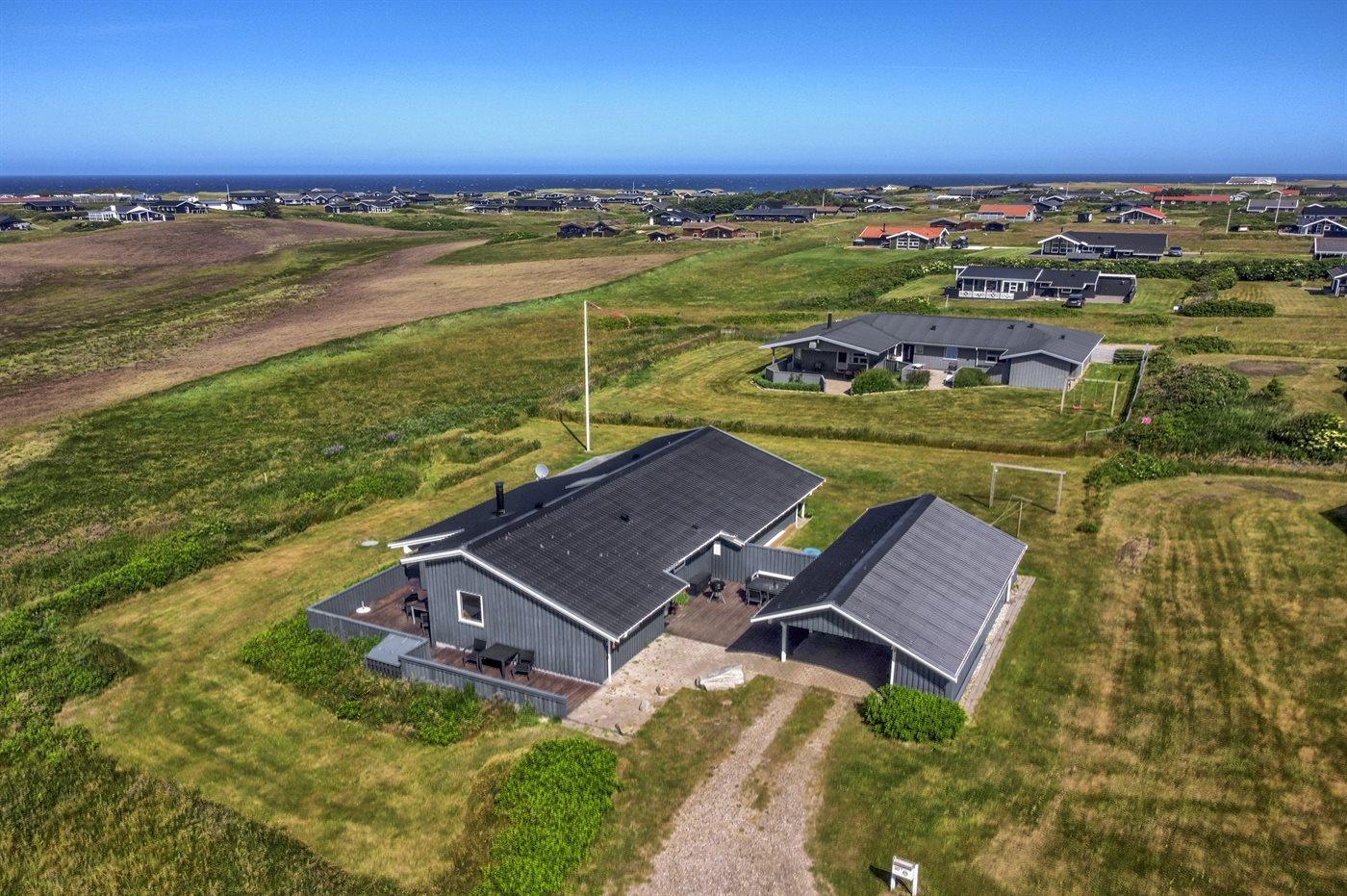 The holiday home is situated on a 1260 m² natural site. Situated 500 m from the sea. Nearest shop is 1500 m away. You will find a golf course in a distance of 3000 m. A 50 m² terrace belong to the holiday home. Furthermore the house has a 20 m² covered terrace. You find a tool shed. Swing. Carport is at your disposal. Plug for charging electric car is available. Charging socket type 2. With 11 kW power output. Parking place by the holiday home.