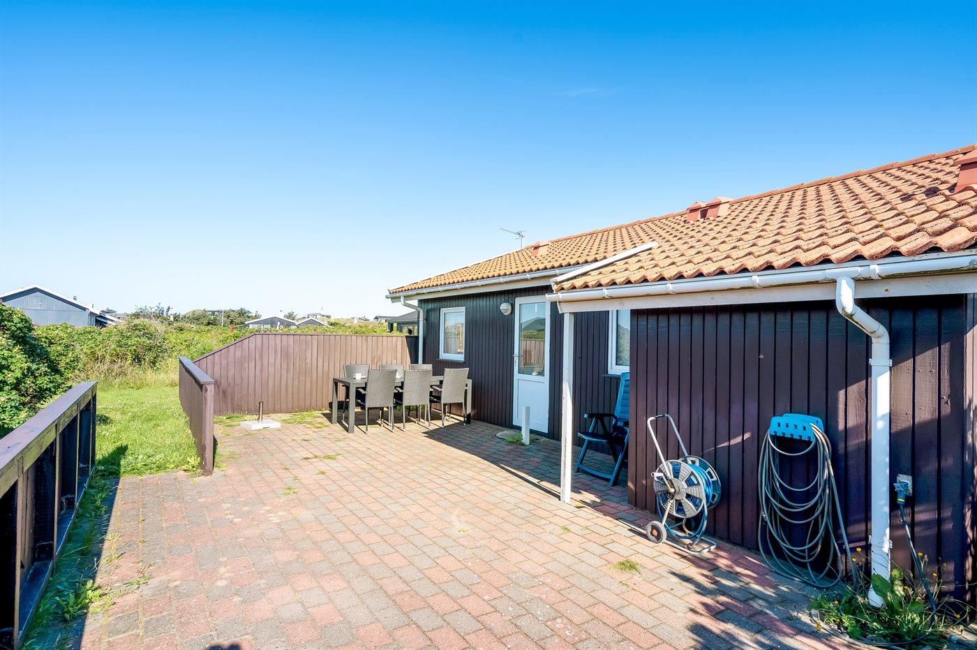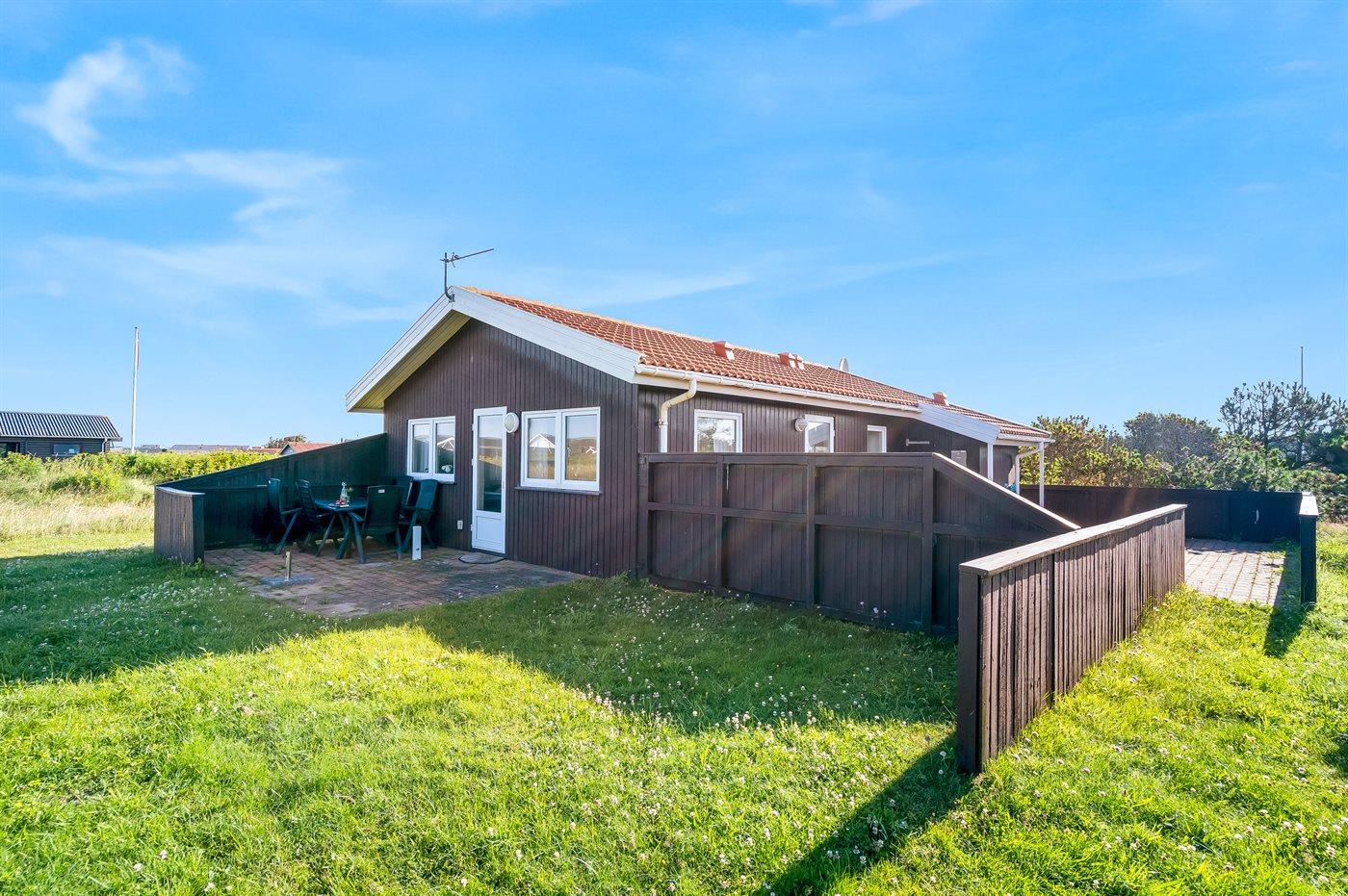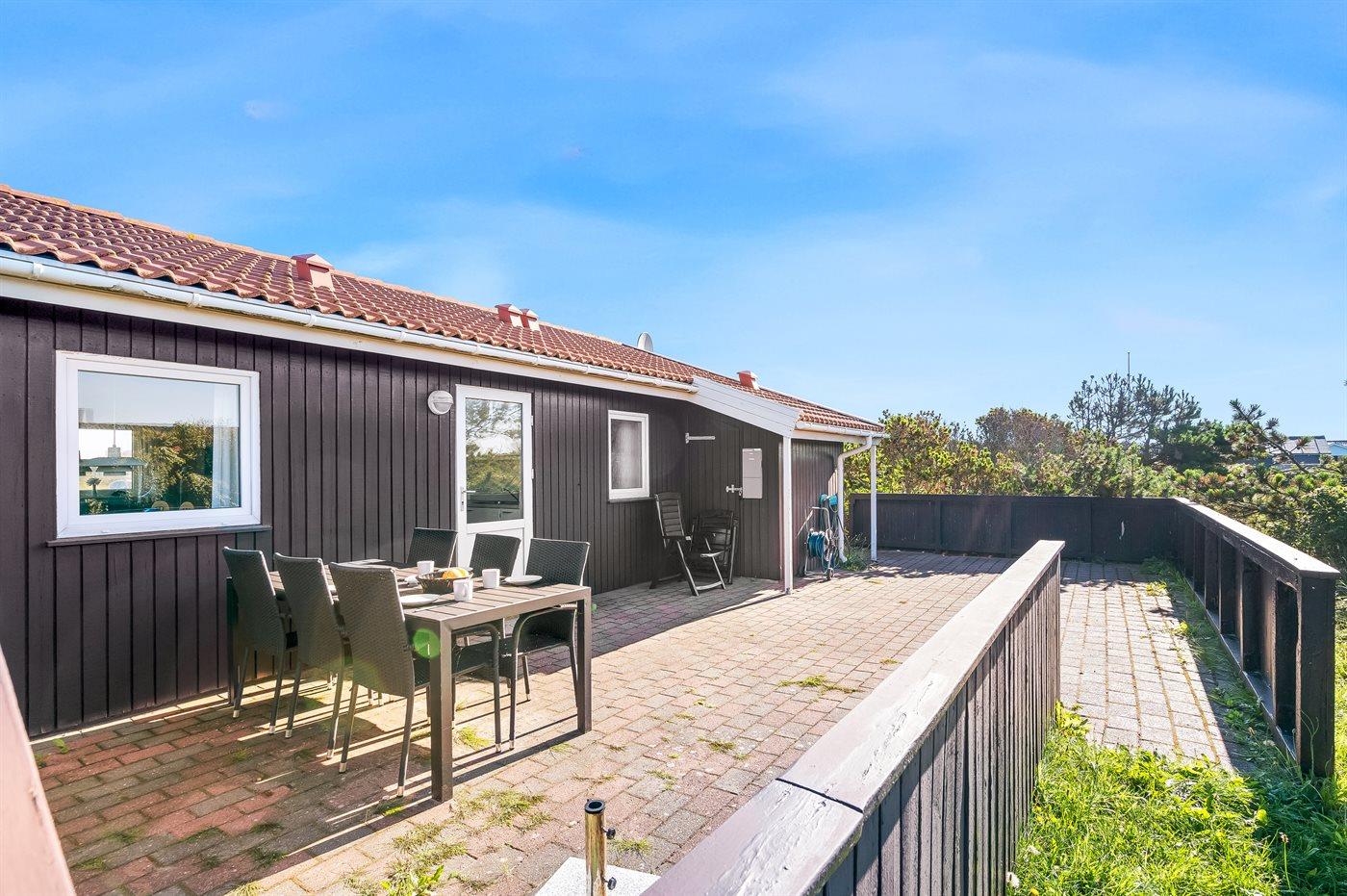 The holiday home is situated on a 1258 m² natural site. Situated 300 m from the sea. Nearest shop is 2000 m away. A 84 m² terrace belong to the holiday home. You find a tool shed. Parking place by the holiday home.