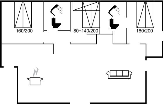 All together there are 3 bedrooms. The beds are divided on: 4 sleeping places in double beds. 3 sleeping places in bunk beds.