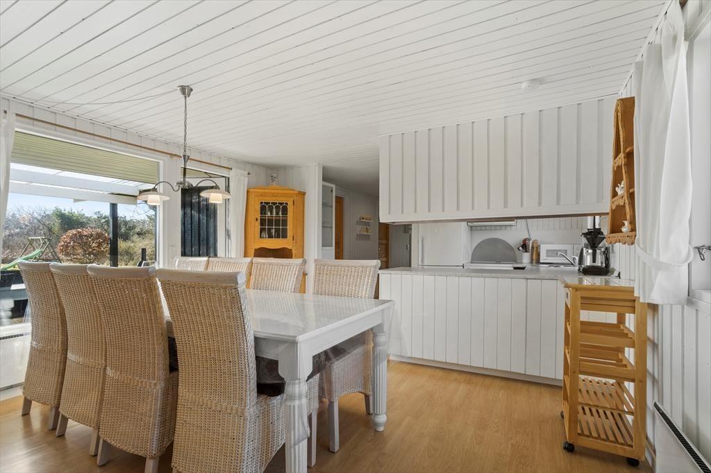 Dies ist ein "richtiges" Ferienhaus mit einer schwarz gestrichenen Holzfassade und weißen Fensterrahmen, die in einem schönen Kontrast zum Grün des Gartens stehen. Die Idylle könnte fast nicht perfekter sein. Das Haus ist sehr gut eingerichtet, und die gemütliche Gemeinschaft während des Urlaubs hat hier ideale Bedingungen. Die halb-offene Küche ist mit einem Esszimmer verbunden, und es gibt auch ein schönes Wohnzimmer mit Kaminofen. Es gibt vier Schlafzimmer – drei mit Doppelbetten und eines mit Etagenbetten. Schließlich gibt es zwei Badezimmer, von denen eines mit einer Badewanne und das andere mit einer Dusche ausgestattet ist.
