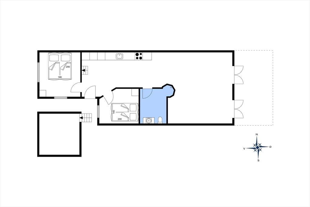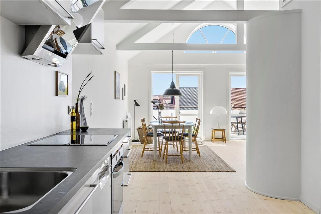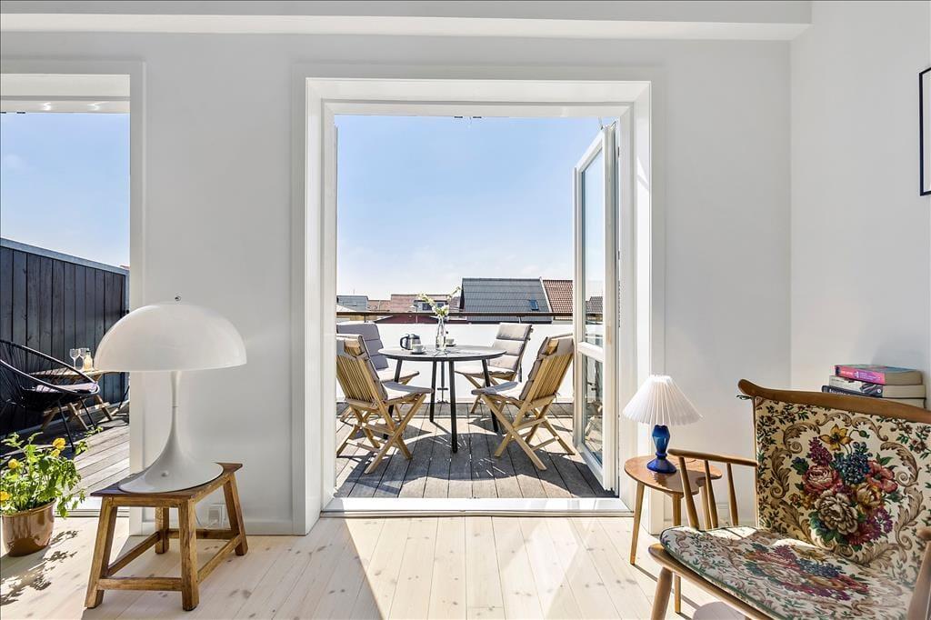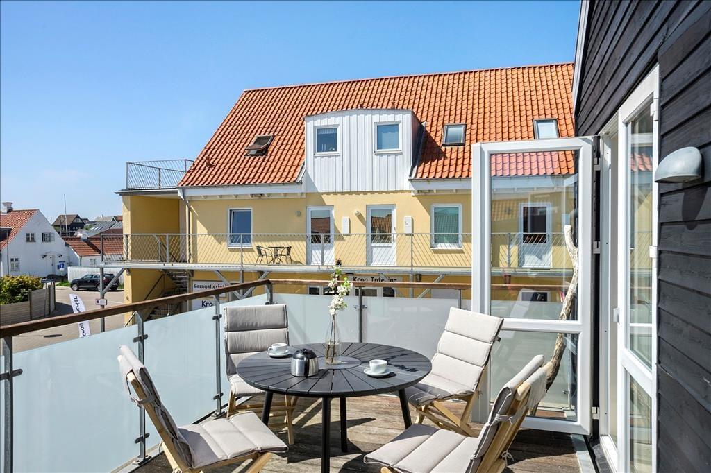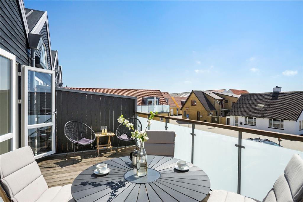 Die große Terrasse ist zweifellos eine der Hauptqualitäten der Wohnung. Hier finden Sie einen wunderbaren Außenbereich, in dem Sie sich in den Gartenmöbeln mit der ersten Tasse Kaffee des Morgens oder einem kühlen Drink am Abend entspannen können. Hier spüren Sie sowohl das pulsierende Urlaubsleben in Løkken als auch die frische Meeresluft vom Strand, der nur wenige hundert Meter entfernt liegt.