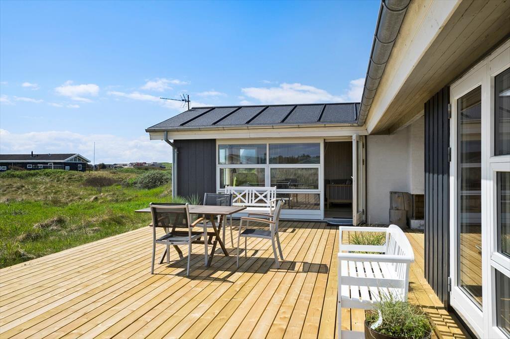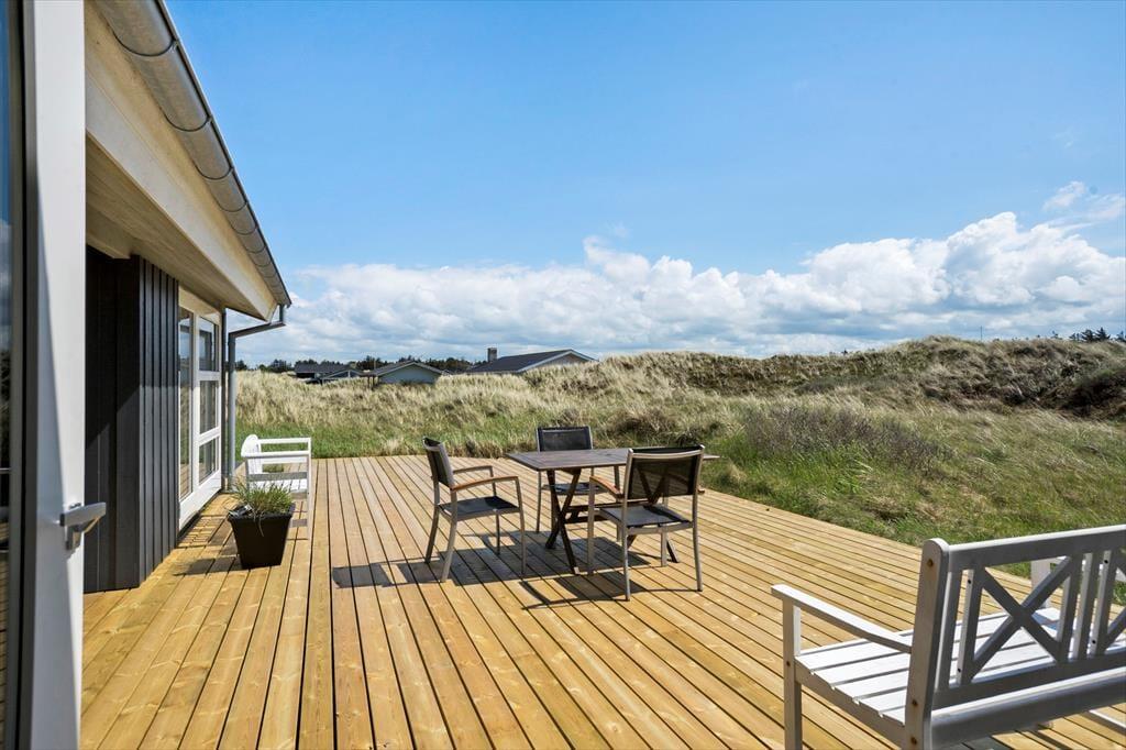 Durch die Fenster des Ferienhauses habt ihr einen Blick auf die schwingenden Strandhafer und Dünen, und dieses herrliche Panorama wird nur noch besser, wenn ihr das Leben ins Freie verlagert. Hier könnt ihr es euch auf der süd- und ostgewandten Terrasse gemütlich machen, die mit allem ausgestattet ist, was ihr braucht: Gartenmöbel, Liegestühle, Grill und Sonnenschirm. Auf dem großen Dünengrundstück steht übrigens ein Carport für das Auto bereit.