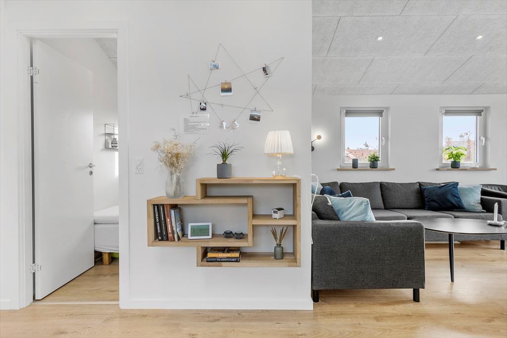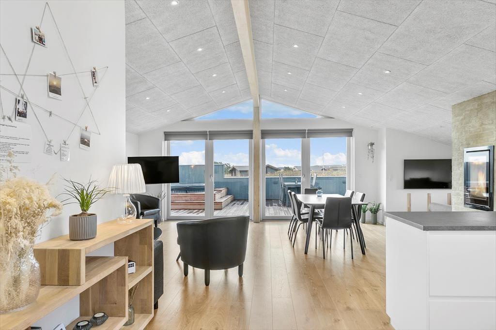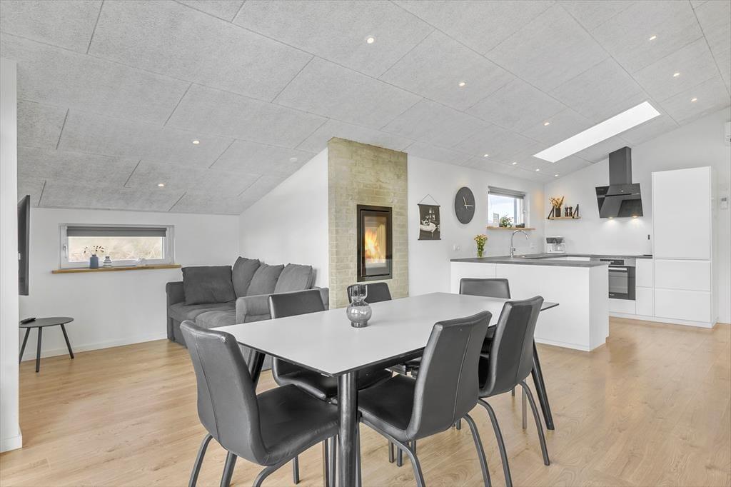 Es herrscht eine helle und einladende Atmosphäre im Haus, und man fühlt sich wohl, sobald man eintritt. Im großen Wohnzimmer gibt es hohe Decken, und Fensterfronten in drei Himmelsrichtungen sorgen sowohl für viel Tageslicht als auch für eine schöne Aussicht. In diesem Haus sind der Himmel und die umliegende Landschaft ein integraler Bestandteil des Raumerlebnisses. Der Stil ist leicht und hell, und durch doppelte Flügeltüren gelangt man direkt vom Wohnzimmer auf die große Holzterrasse, die sich entlang der Fassade des Hauses erstreckt. Die Küche ist offen mit dem Wohnzimmer verbunden, und der gemauerte Kamin mit Einsatz sorgt an kühlen Abenden für Wärme und Gemütlichkeit. Das Haus verfügt außerdem über drei Schlafzimmer und ein Badezimmer.