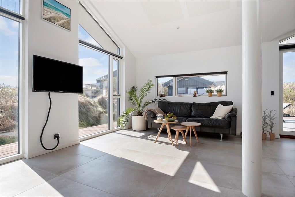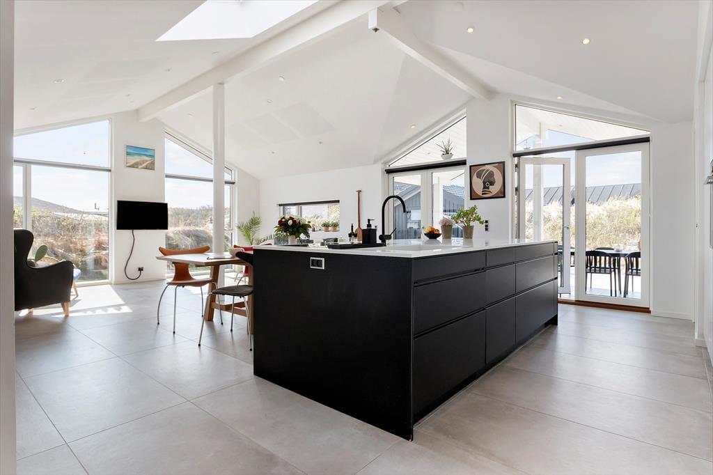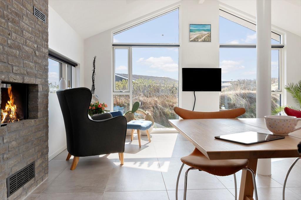 Wenn du das Ferienhaus in der Magnus Christensens Vej 107 betrittst, erwartet dich eine helle und einladende Umgebung, in der nordische Schlichtheit und echtes Ferienhausflair Hand in Hand gehen. Die Einrichtung ist modern und gemütlich mit viel Liebe zum Detail – genau das, was für die richtige Urlaubsstimmung sorgt. Im Wohnzimmer lassen große Fenster viel Licht herein und geben dir das Gefühl, der Natur ganz nah zu sein – selbst wenn du drinnen bist. Der Kamin sorgt für wohlige Wärme und knisternde Gemütlichkeit, wenn draußen der Wind weht oder nach einem langen Tag am Strand. Der offene Wohnbereich vereint Küche, Essplatz und Sofaecke – so kannst du gemeinsam mit deiner Familie Zeit verbringen, ganz gleich ob ihr zusammen kocht, Brettspiele spielt oder Gute-Nacht-Geschichten lest. Ein Ort, an dem man zur Ruhe kommt und die Zeit einfach ihren Lauf nehmen darf.