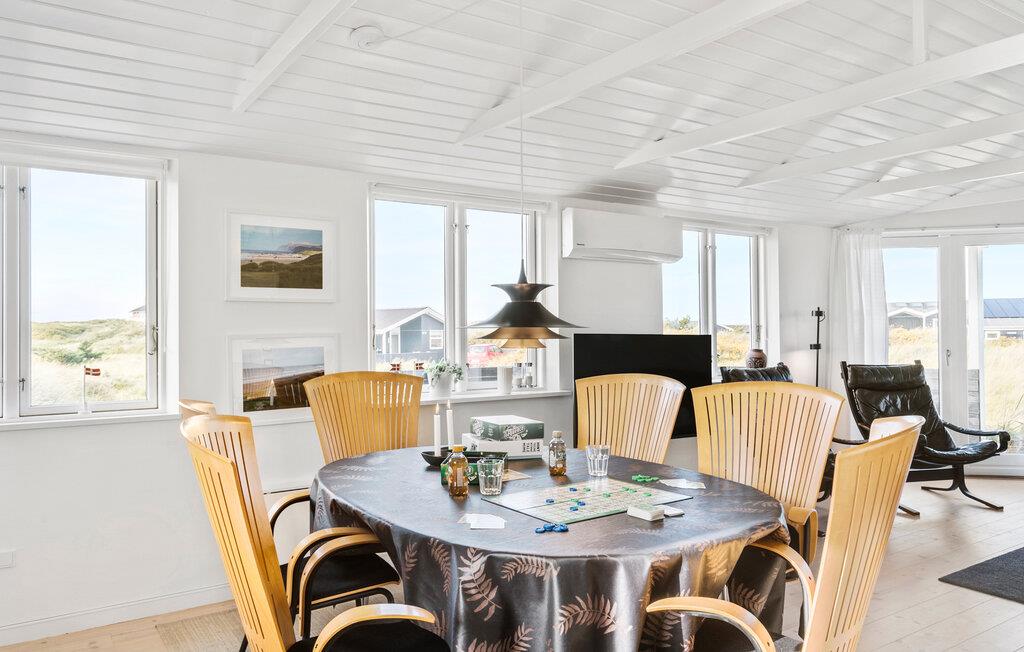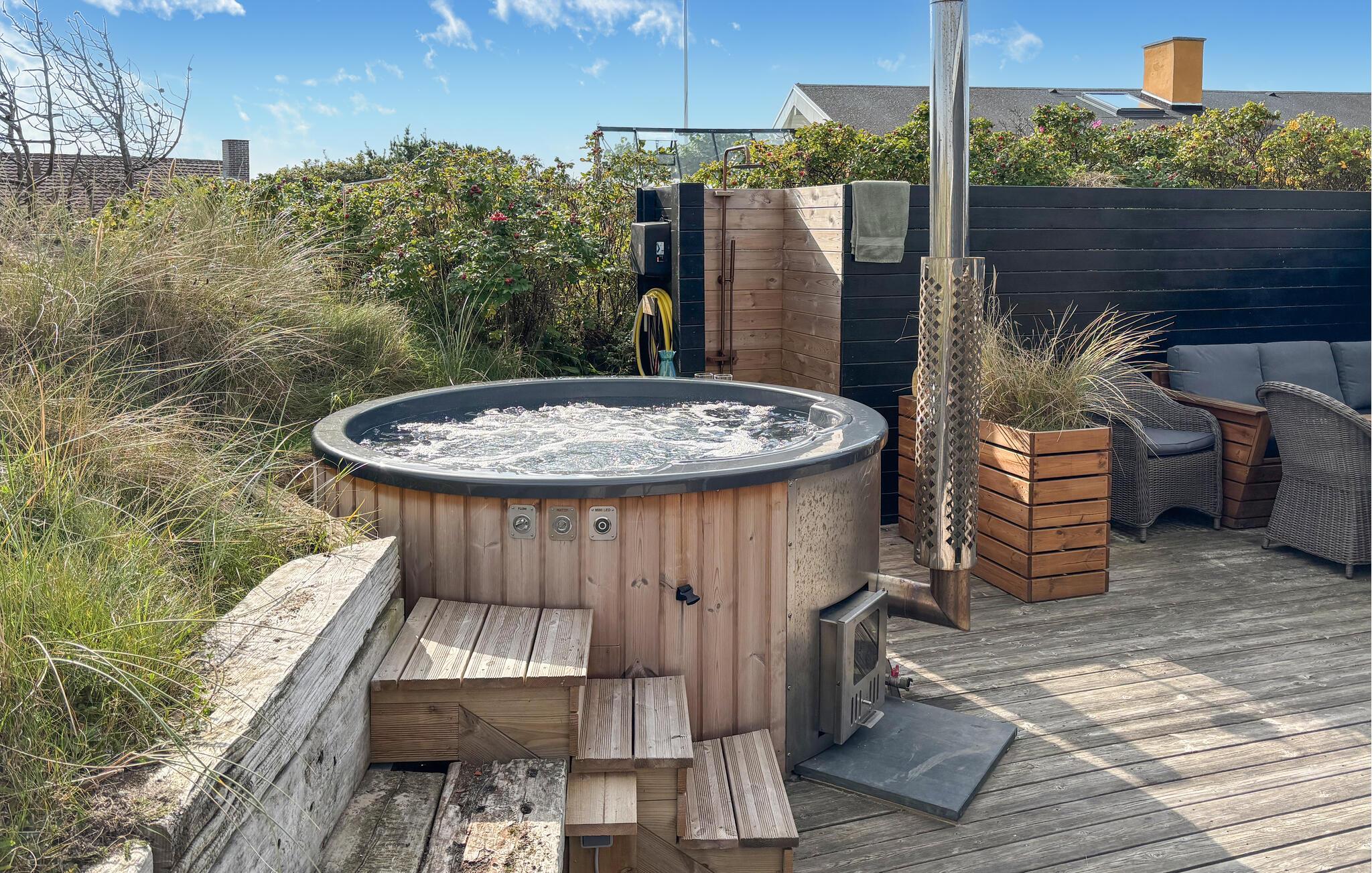 Eingebettet in die Dünenlandschaft von Hvorup Klit, nahe Løkken, bietet dieses gemütliche Ferienhaus den idealen Rückzugsort für einen entspannten Urlaub mit der ganzen Familie. Die helle, moderne Küche ist geräumig und lädt nicht nur zum Kochen ein, sondern bietet auch einen schönen Blick auf die umliegende Natur. Auch der Wohnbereich zeichnet sich durch große Fenster aus, die viel Tageslicht hereinlassen und eine warme, einladende Atmosphäre schaffen. Entspannen Sie abends in Sauna und Whirlpool oder machen Sie es sich in der bequemen Sofalandschaft gemütlich und verbringen Sie gesellige Abende mit Gesellschaftsspielen am prasselnden Kaminofen.