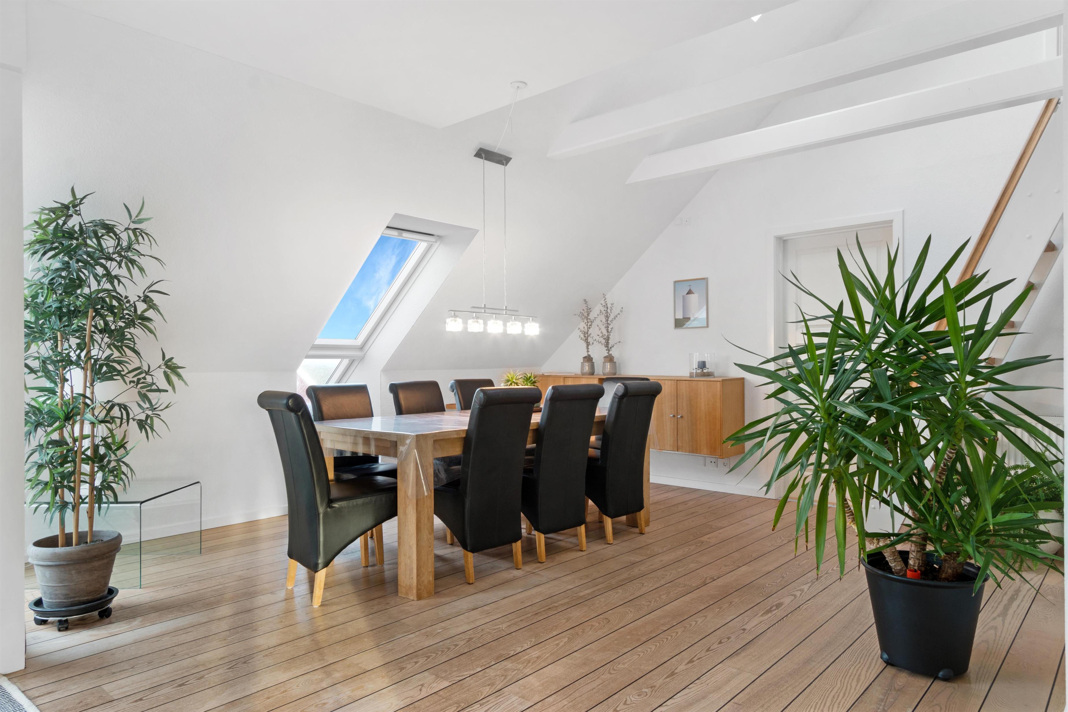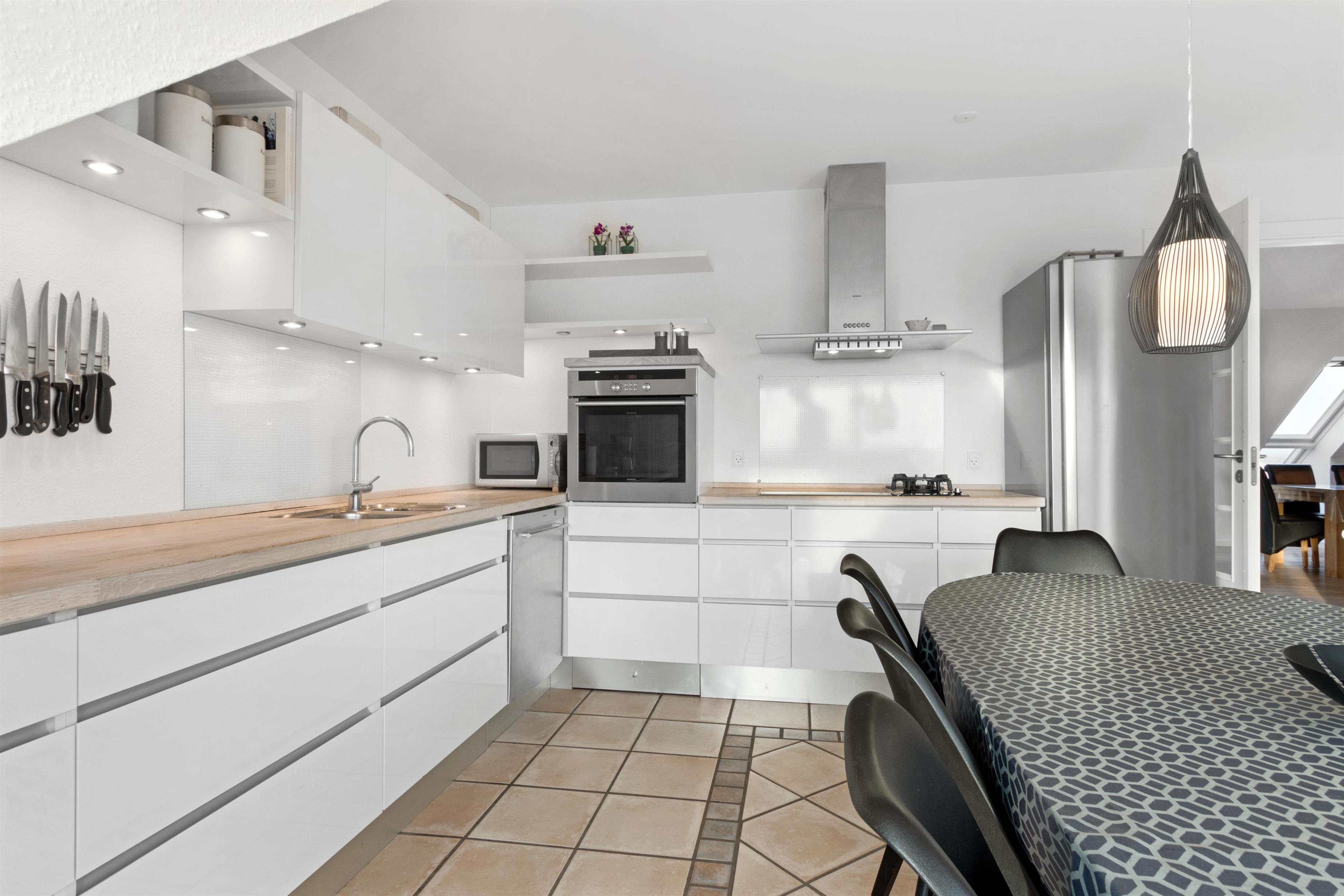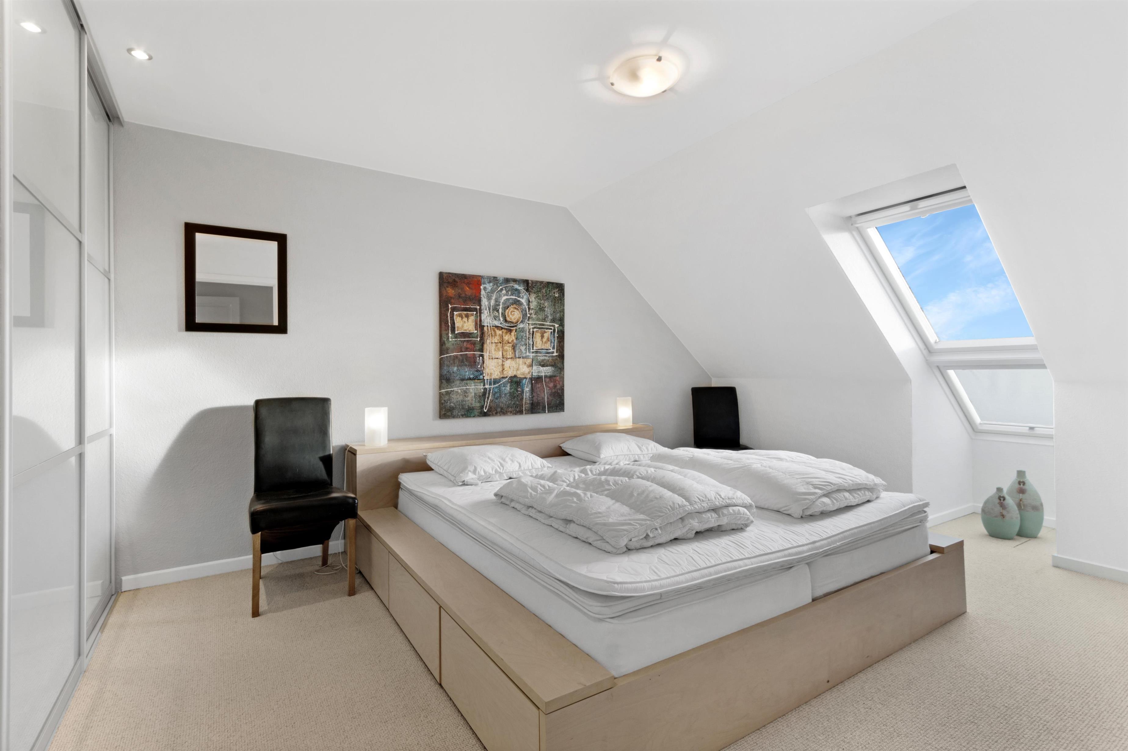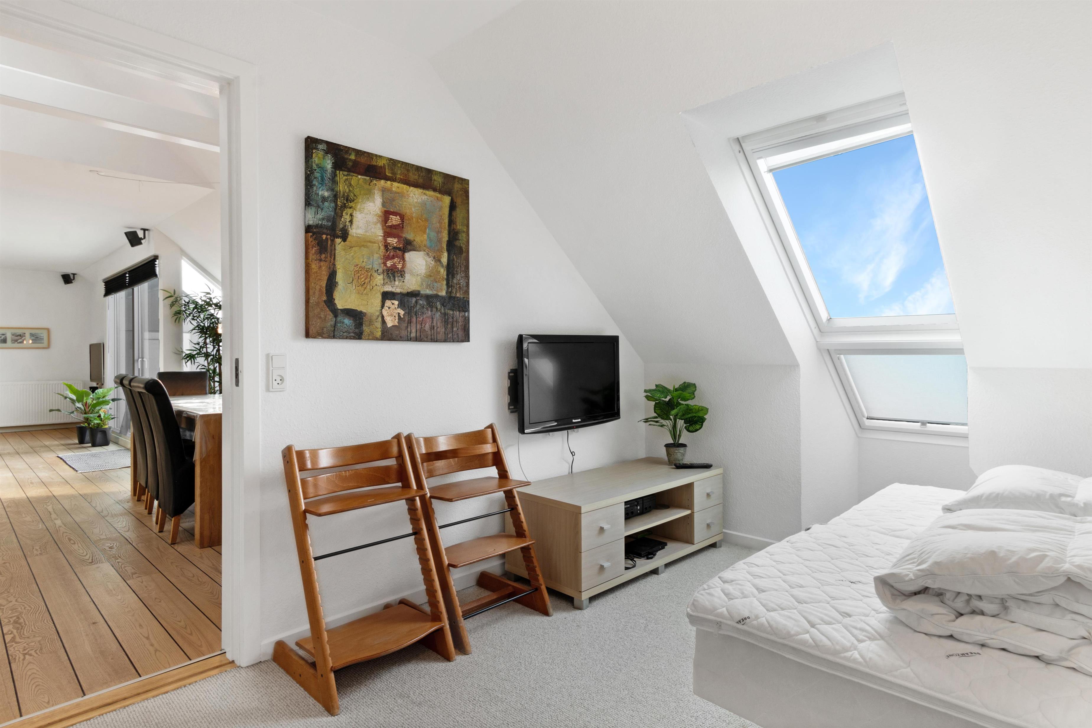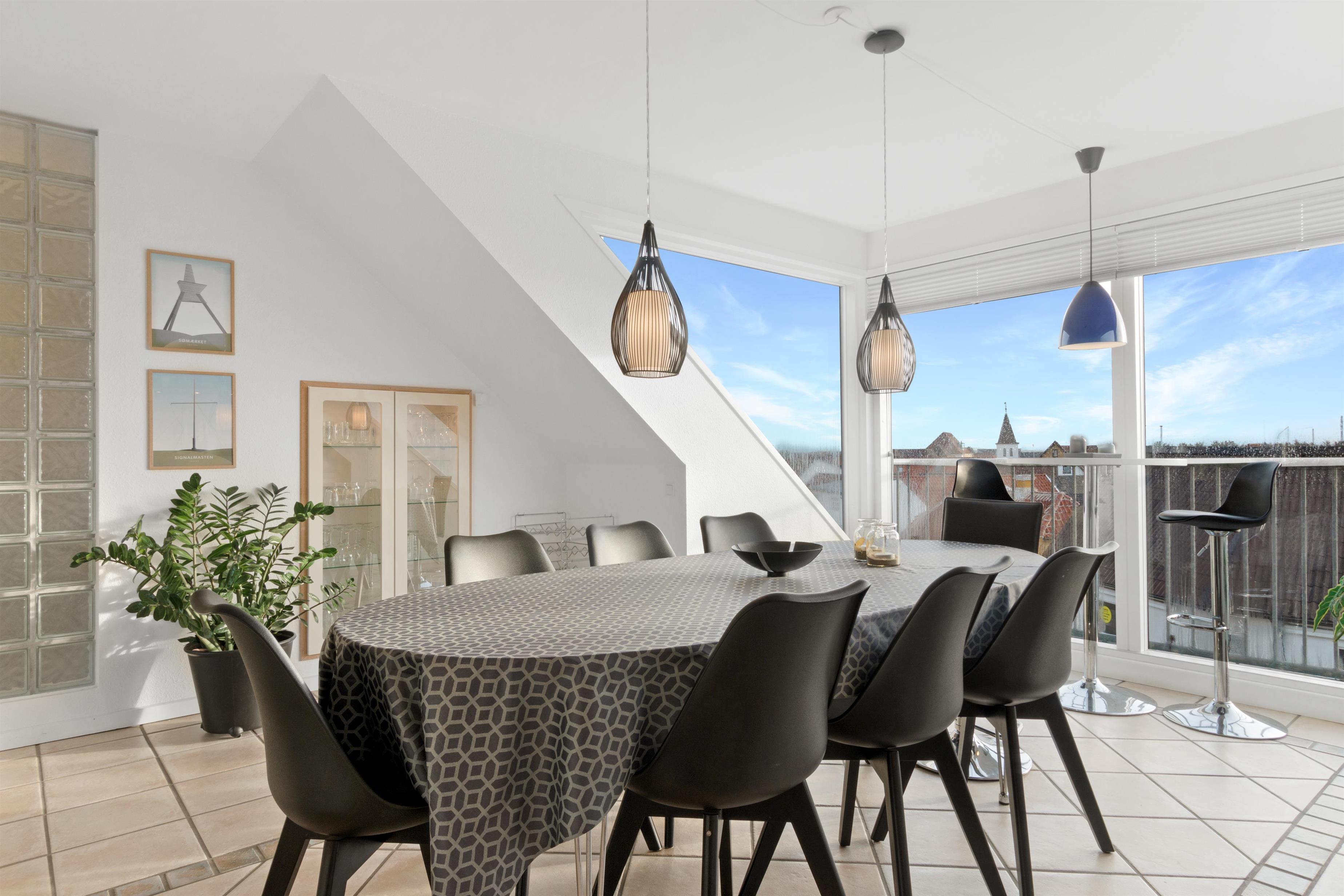 This holiday apartment, located in the absolute center of Løkken in Denmark, is truly a gem of a holiday rental. The apartment is on two floors + a loft with a separate bedroom, and the view over both the city of Løkken and the North Sea is definitely worth a visit! There is room for 10 people and a child up to 3 years old. There are 5 bedrooms and two bathrooms spread over the wonderful 172 m² - 8 sleeping places in double beds and 2 in single beds. In addition, there is 1 children’s bed, and you are allowed to bring your pet. There is floor heating in the kitchen and in both bathrooms. In addition, there are several super characteristics of the apartment.