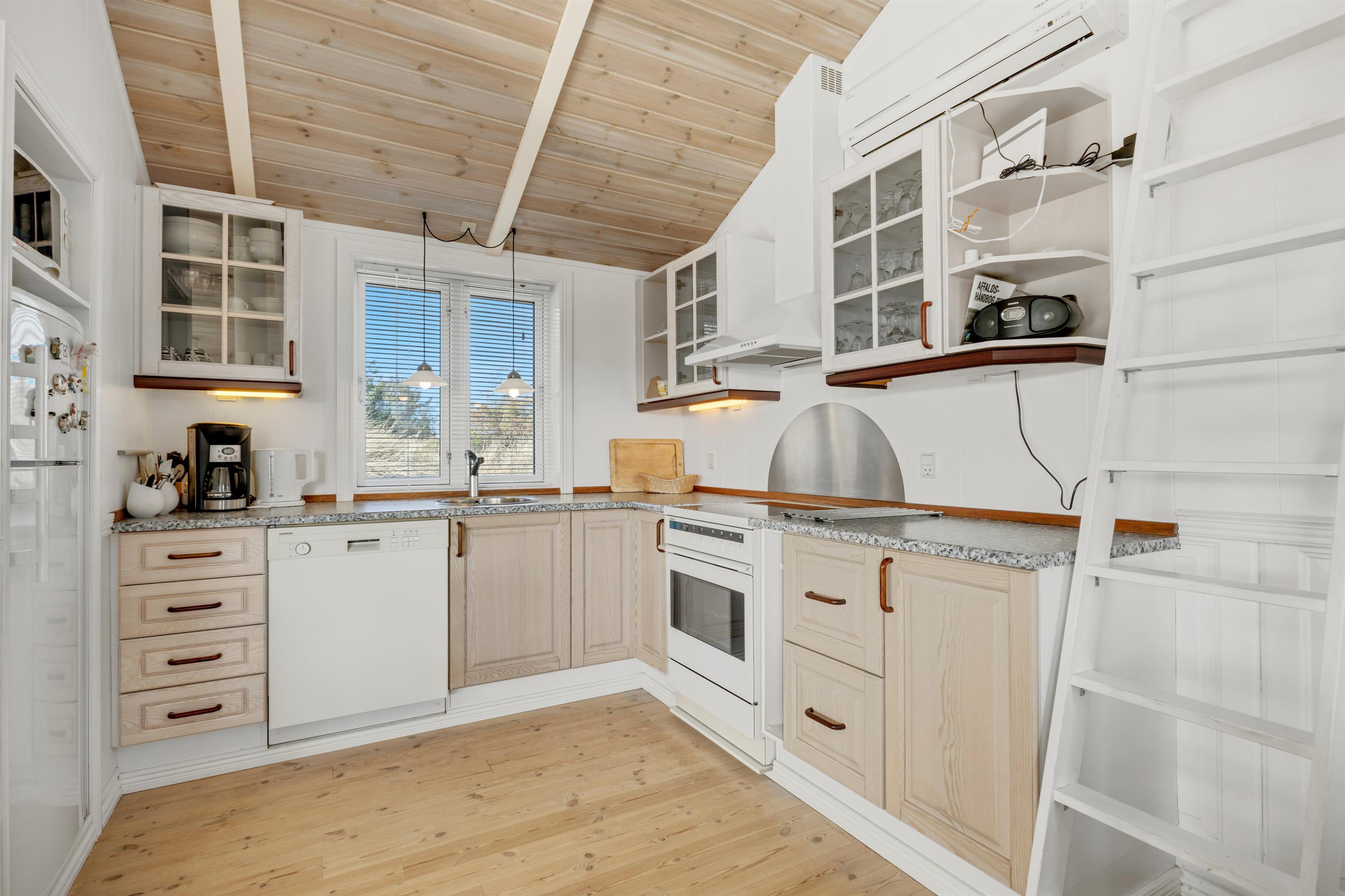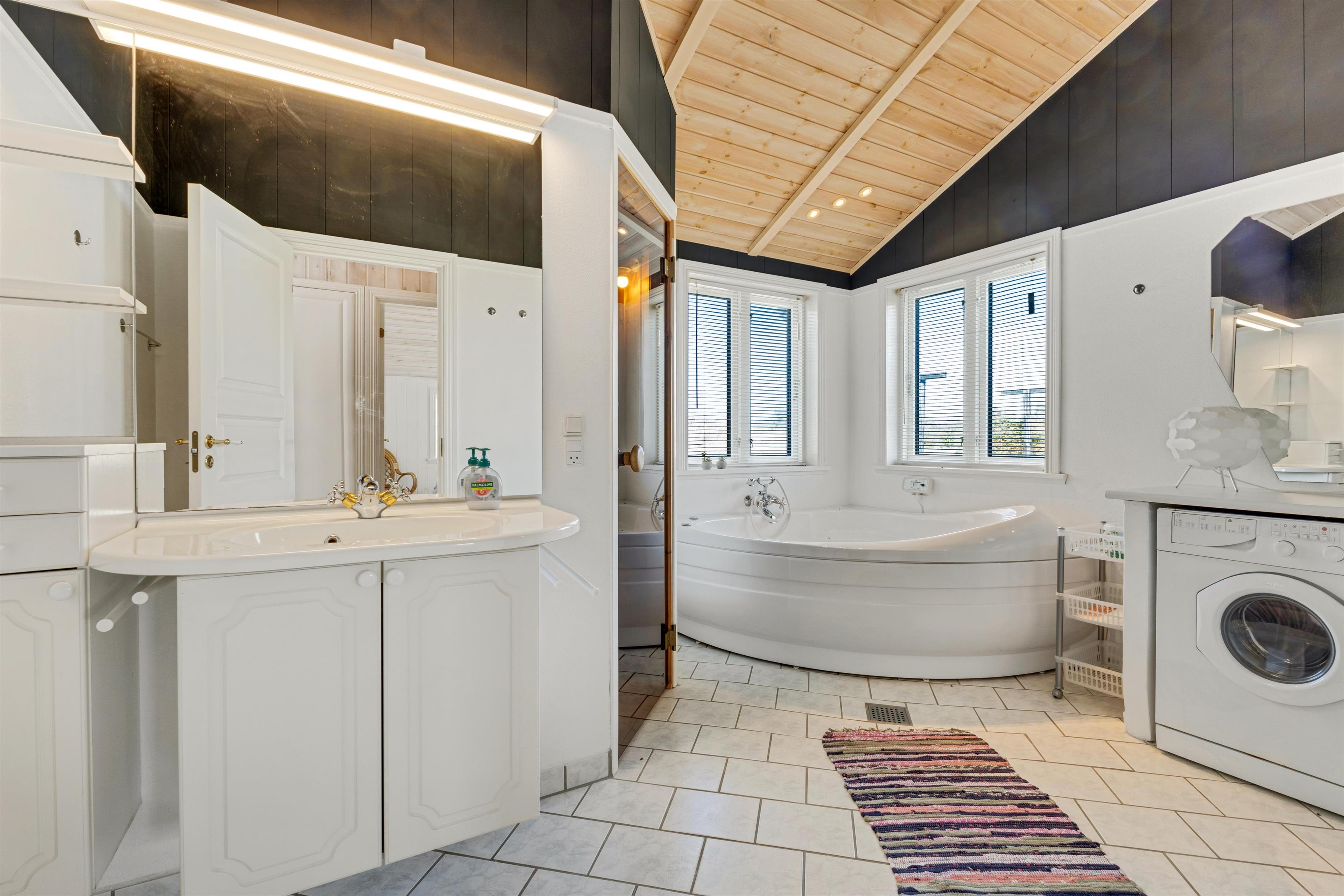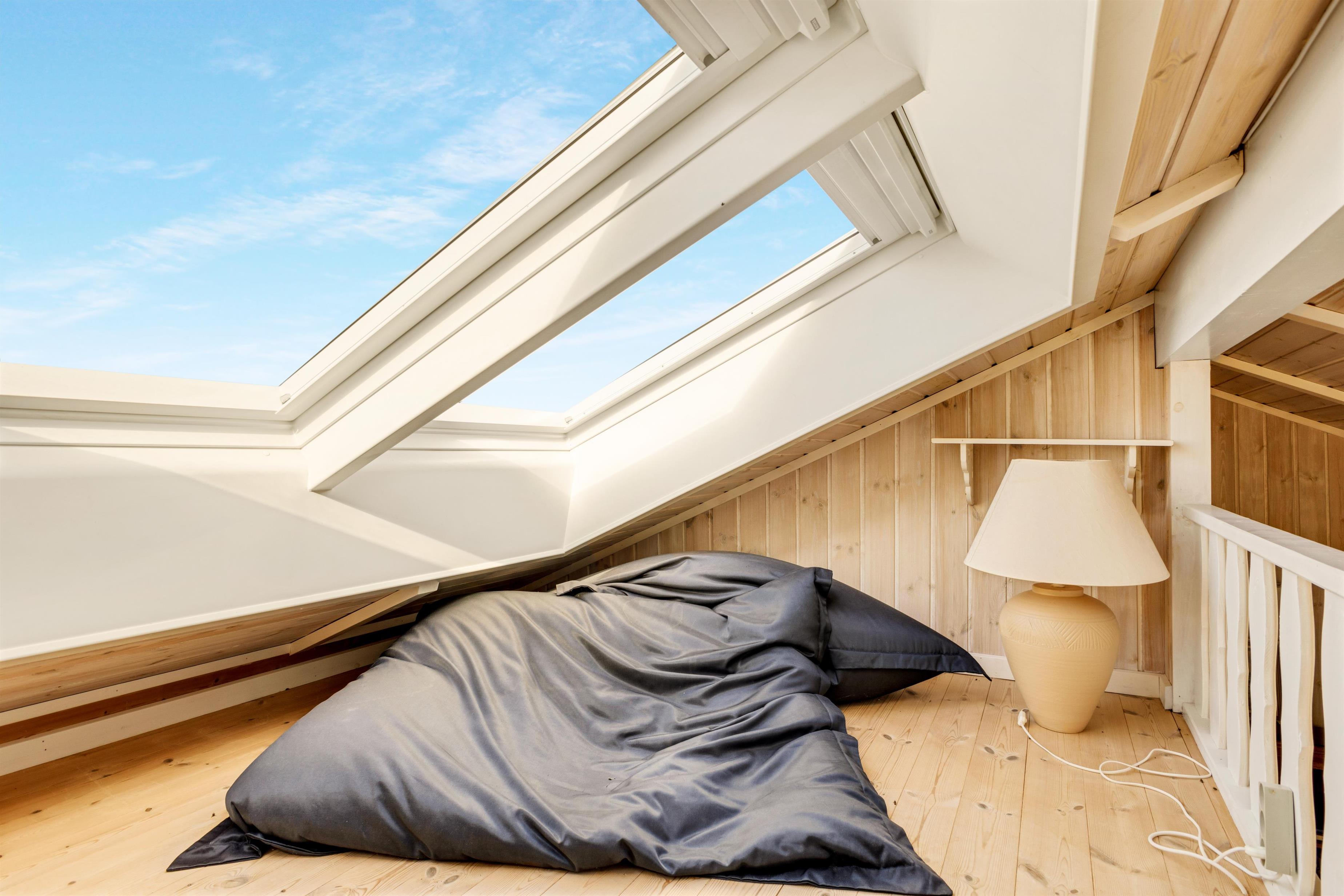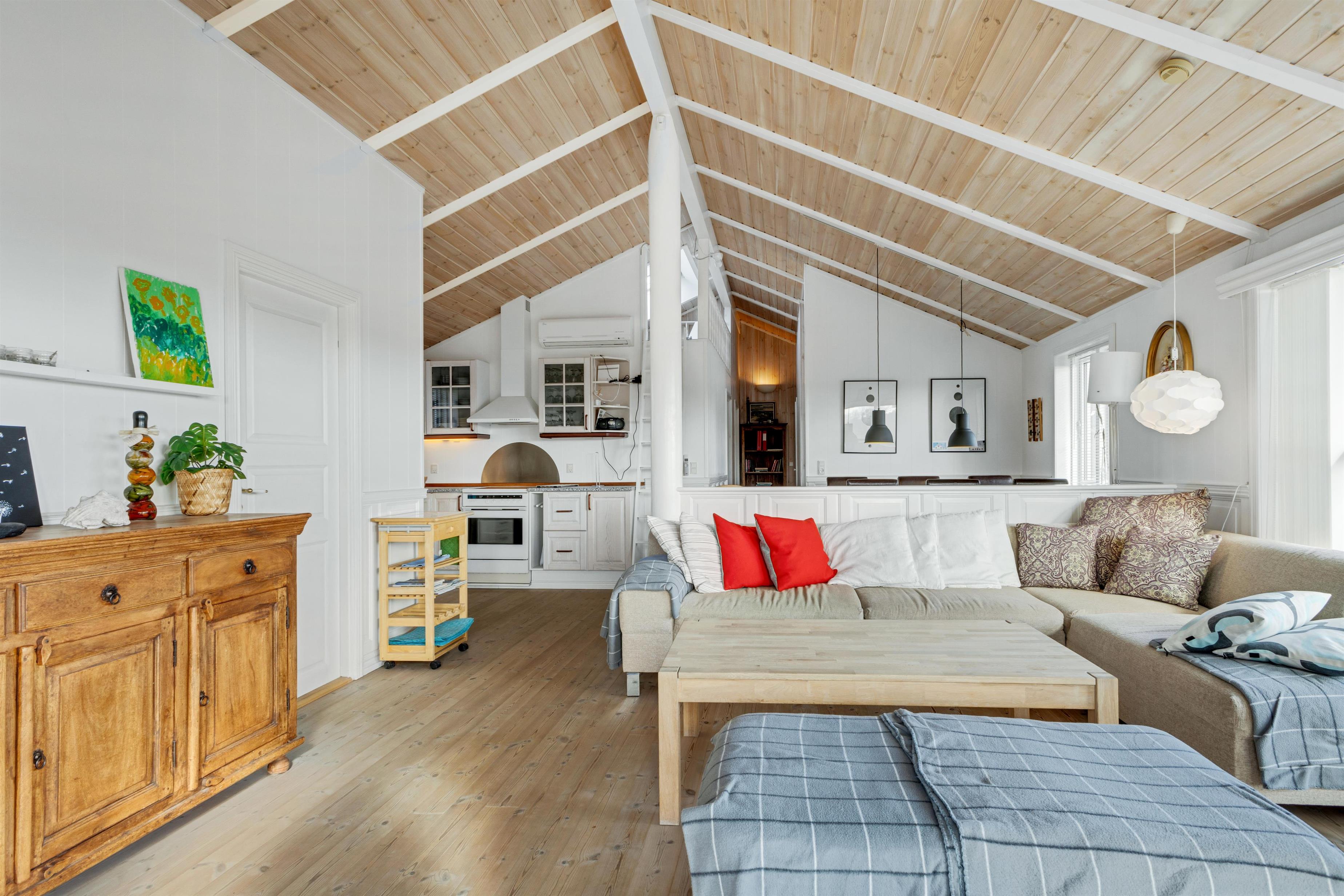 In the house, there are two bathrooms - one of which is with sauna and spa - three bedrooms, and a large, bright kitchen and dining area. Here, there is a genuine holiday home atmosphere with a cozy dining area, panels on the walls, and a lovely sofa area with a fireplace and a view of the beautiful nature outside. There is a loft where the kids can retreat and enjoy the sound of the living room's laughter and the crackling of the fireplace. A really lovely holiday home that invites many hours of vacation relaxation.