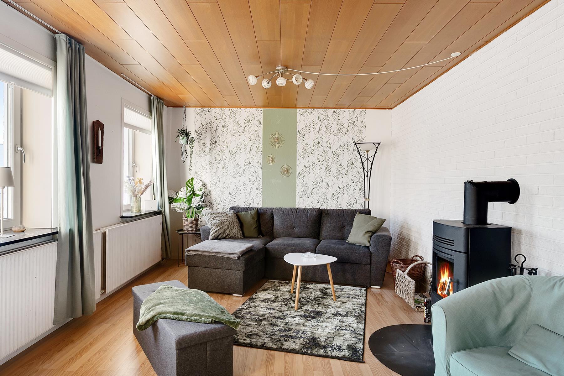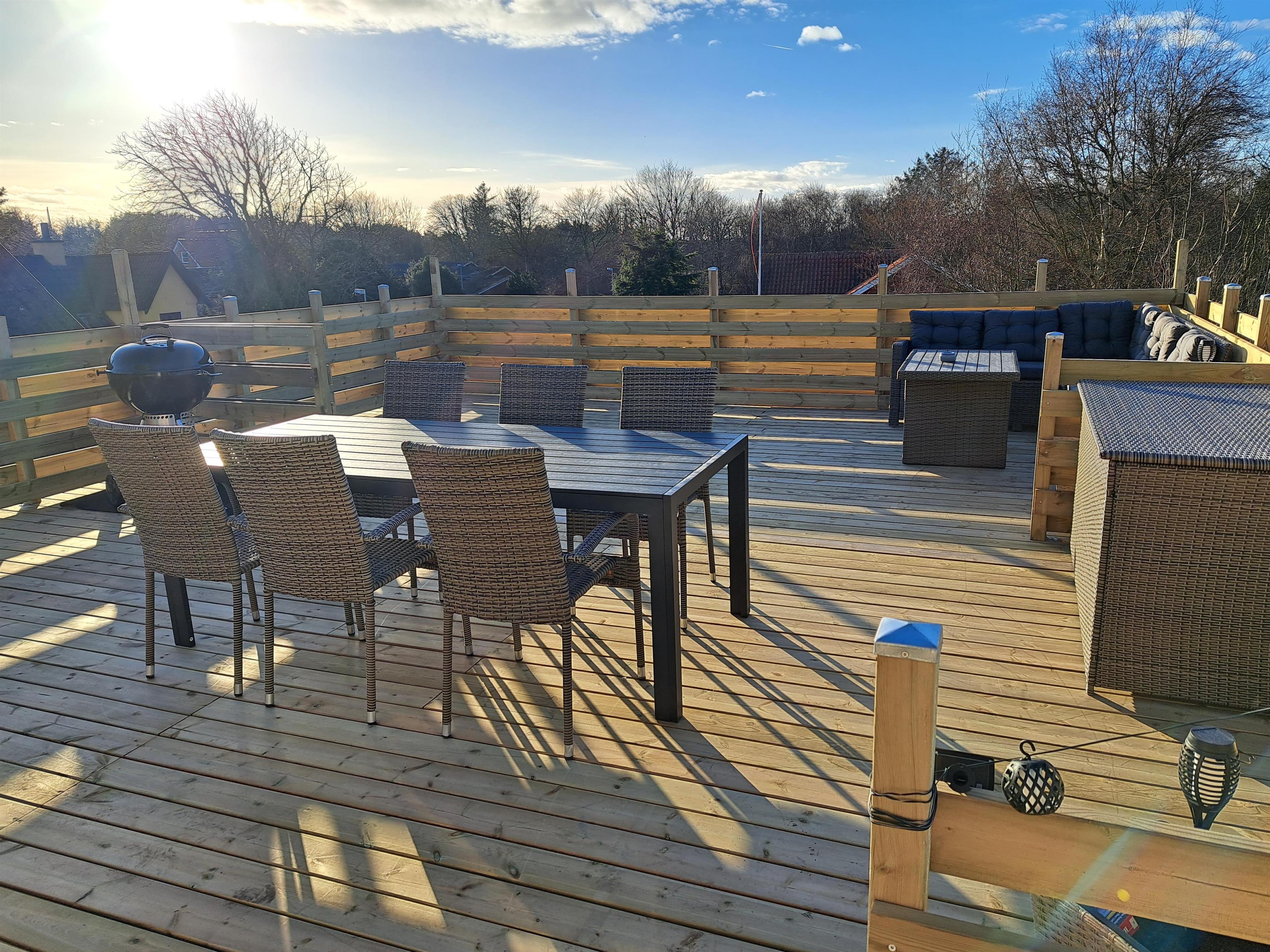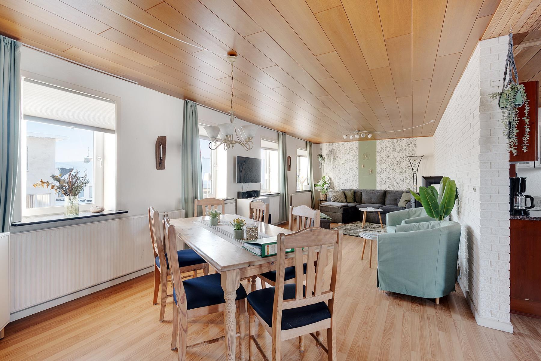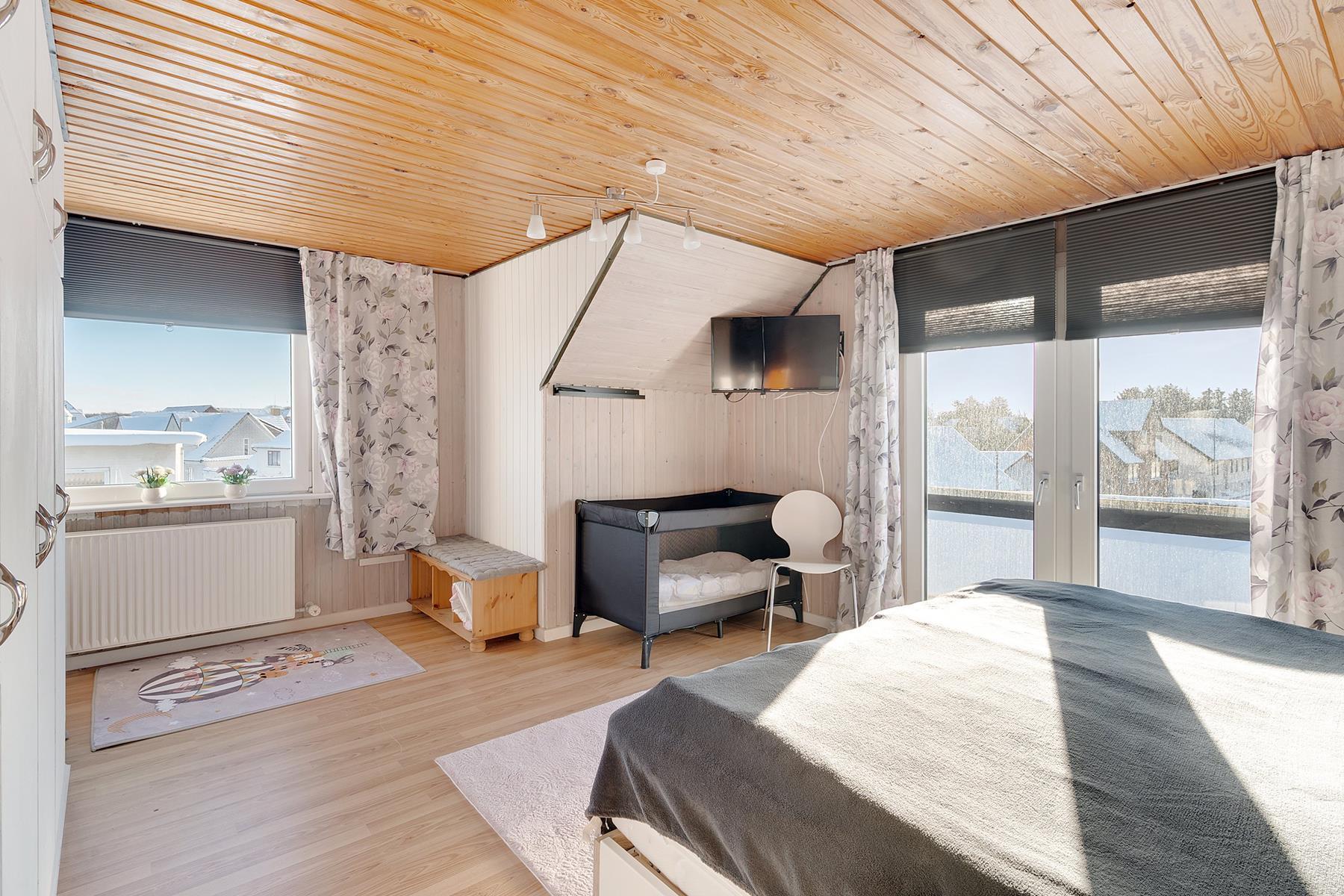 The holiday home is 168 square meters spread over two floors, and it is allowed to bring 2 pets. There are 3 bedrooms, 2 toilets, and 1 bathroom with a bathtub. The kitchen is open, and the style of the apartment is cozy with a wood-burning stove by the sofa area and a lovely, large terrace.