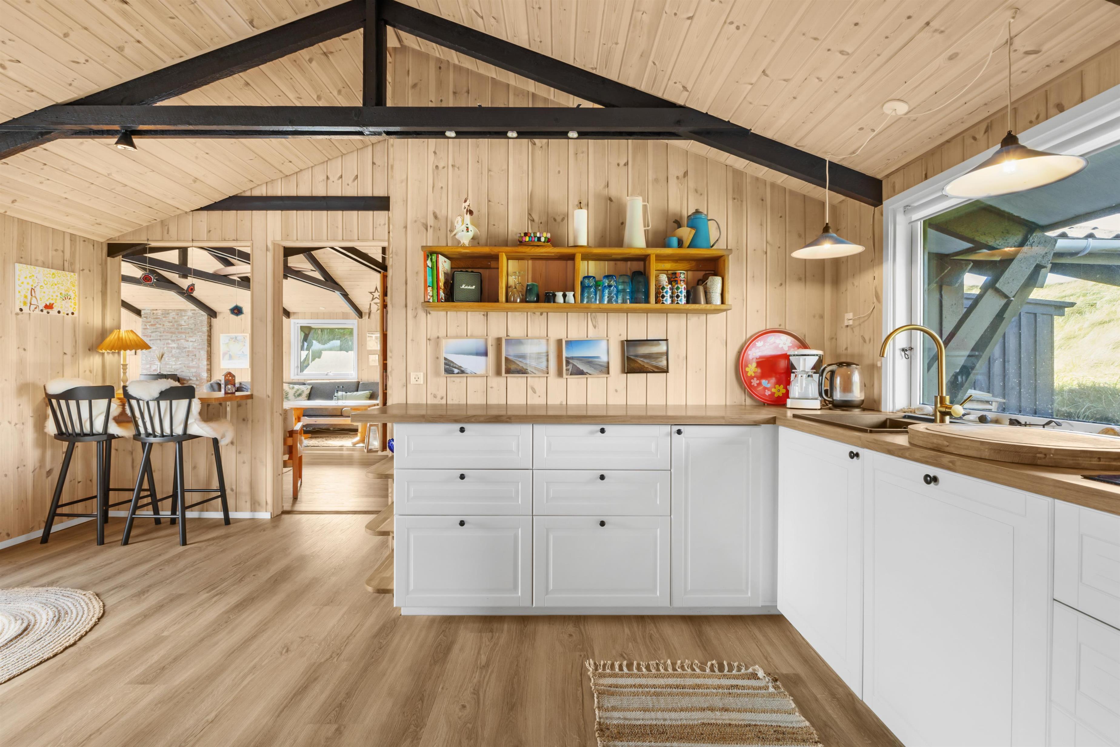 Outside the summer house, there are plenty of opportunities to enjoy nature. The house is just 50 meters from the beach, at the end of a dead-end road, in a summer house area that’s sufficiently secluded from the town’s hustle and bustle, but still within a 5-minute drive to the city. It’s also easy to bike into Løkken, and cars are allowed on the beach, one of Denmark’s best beaches. During the high season, lifeguards patrol certain stretches of the beach. Take a walk through the beautiful dunes or drive 15 minutes to spend a day at one of Europe’s largest amusement parks, Fårup Sommerland. There are plenty of opportunities for both relaxation and more action-packed experiences. Outside the house, there is a Swedish bath and an outdoor shower.