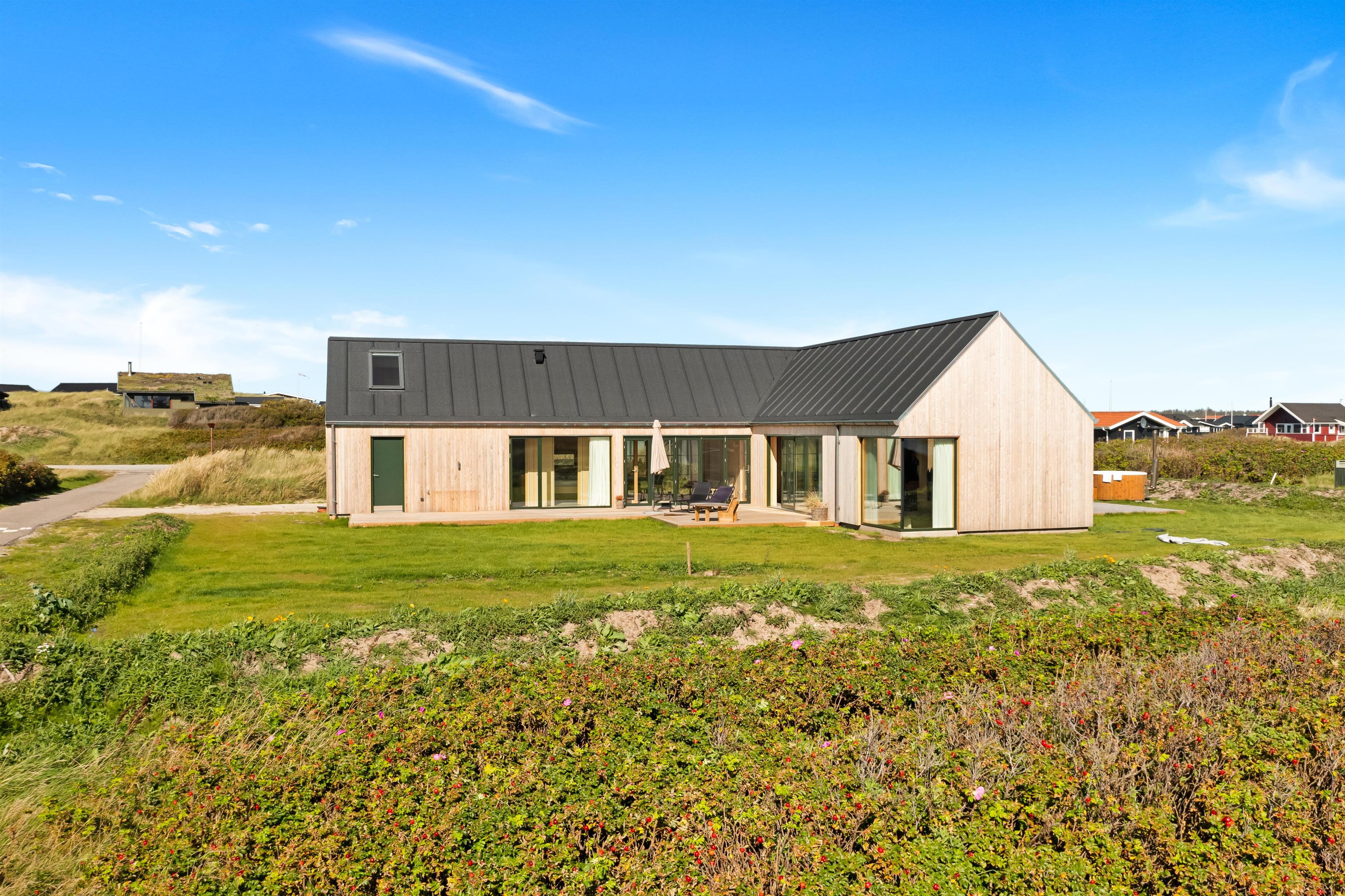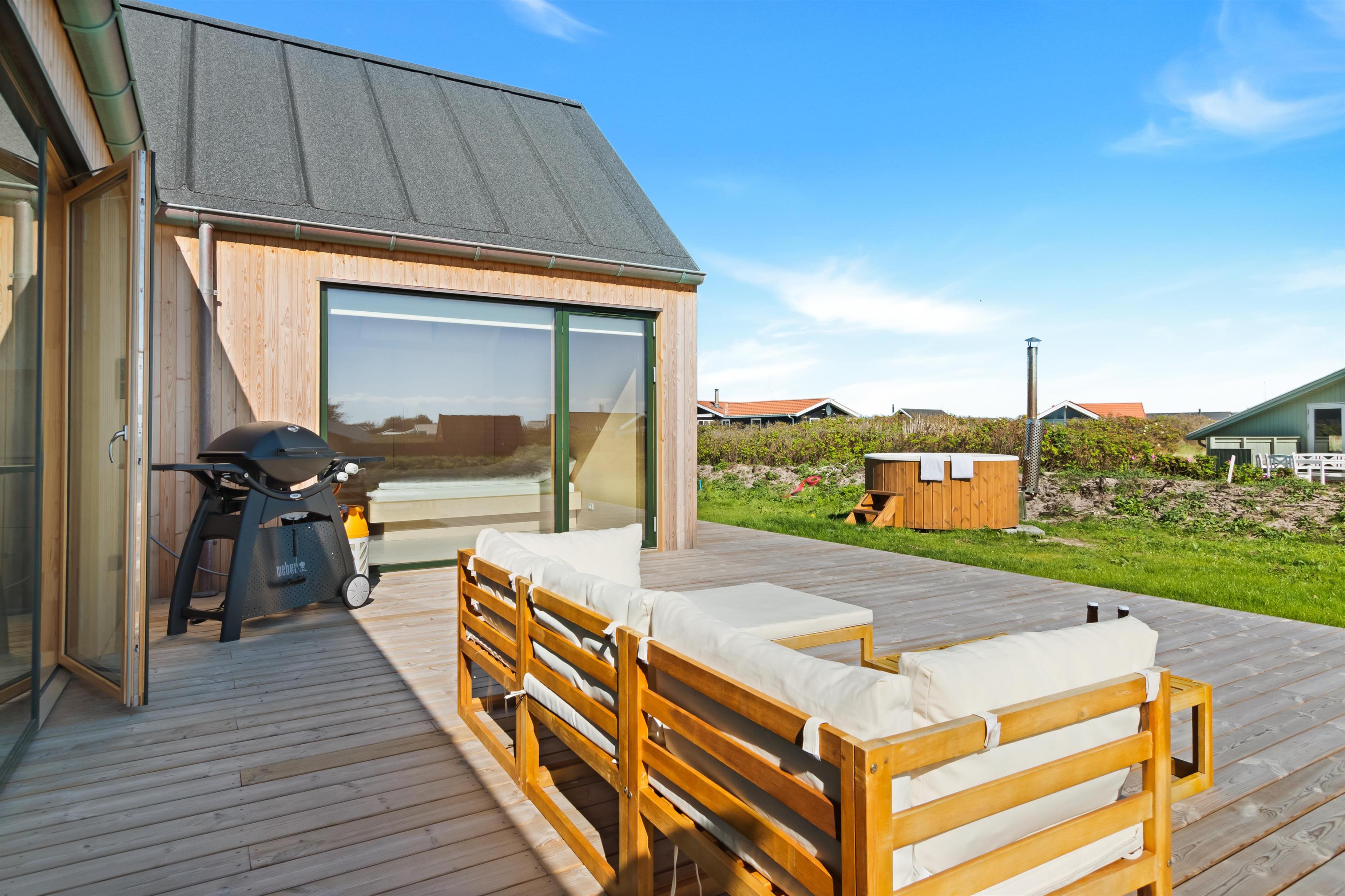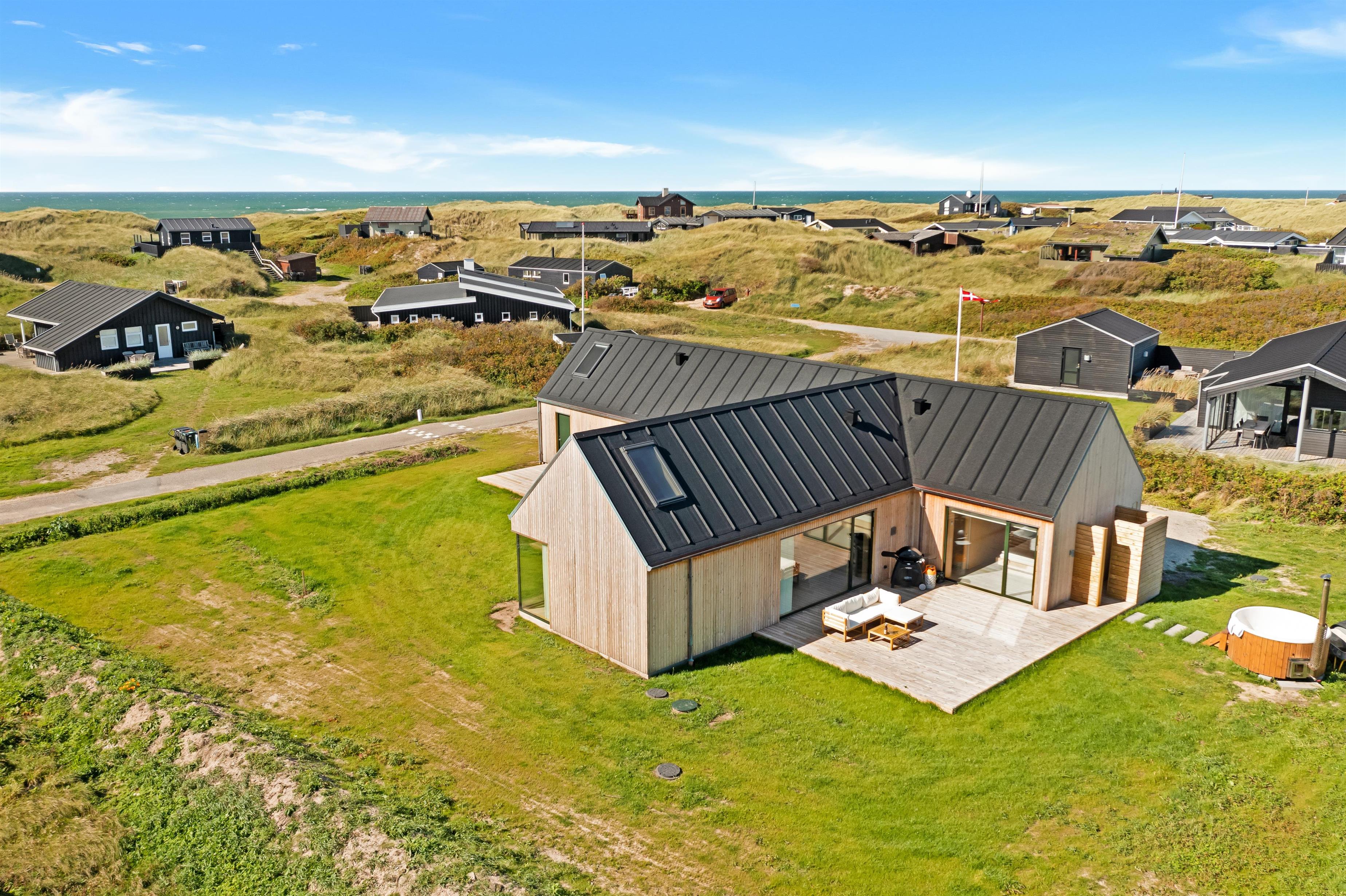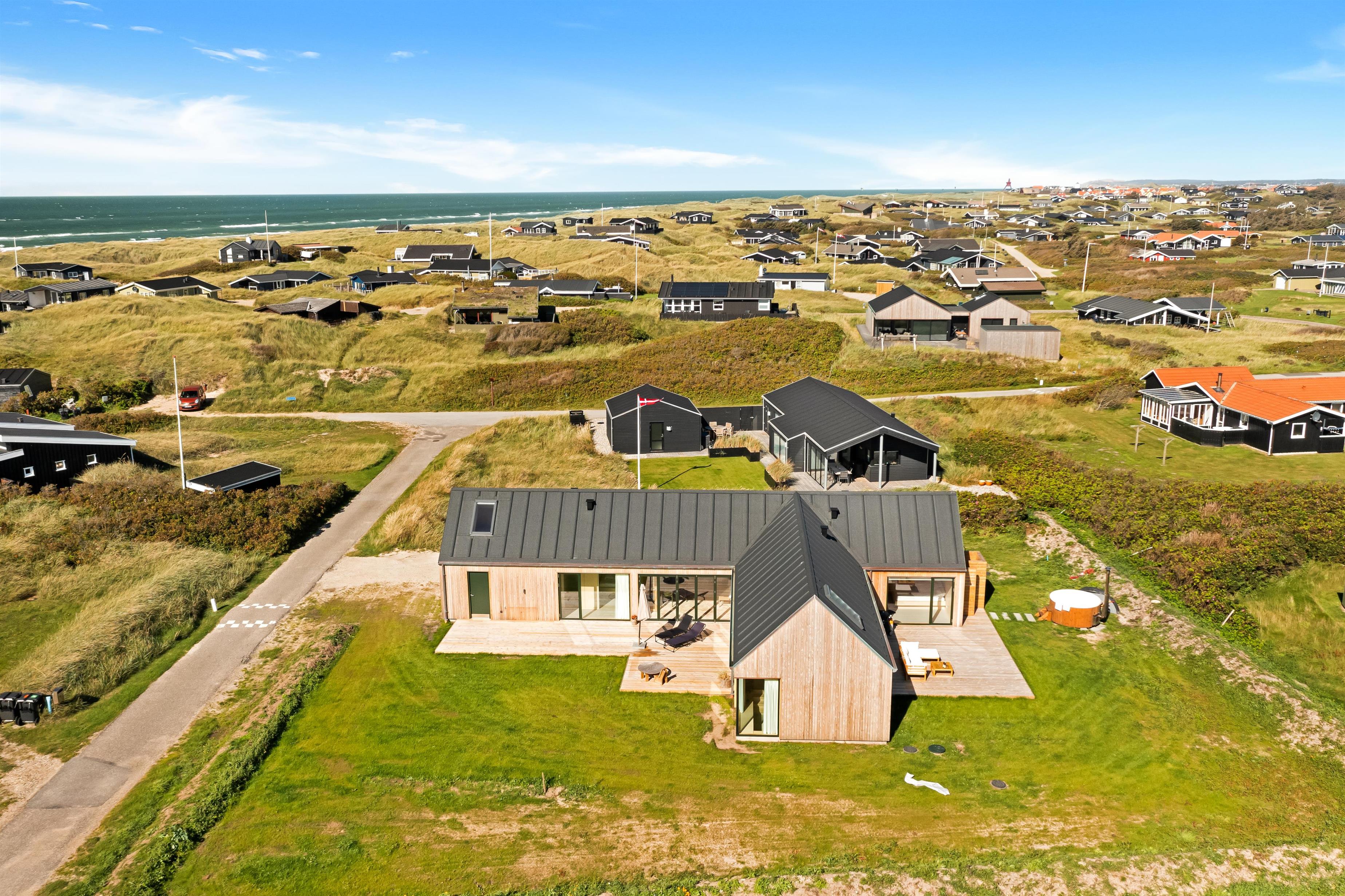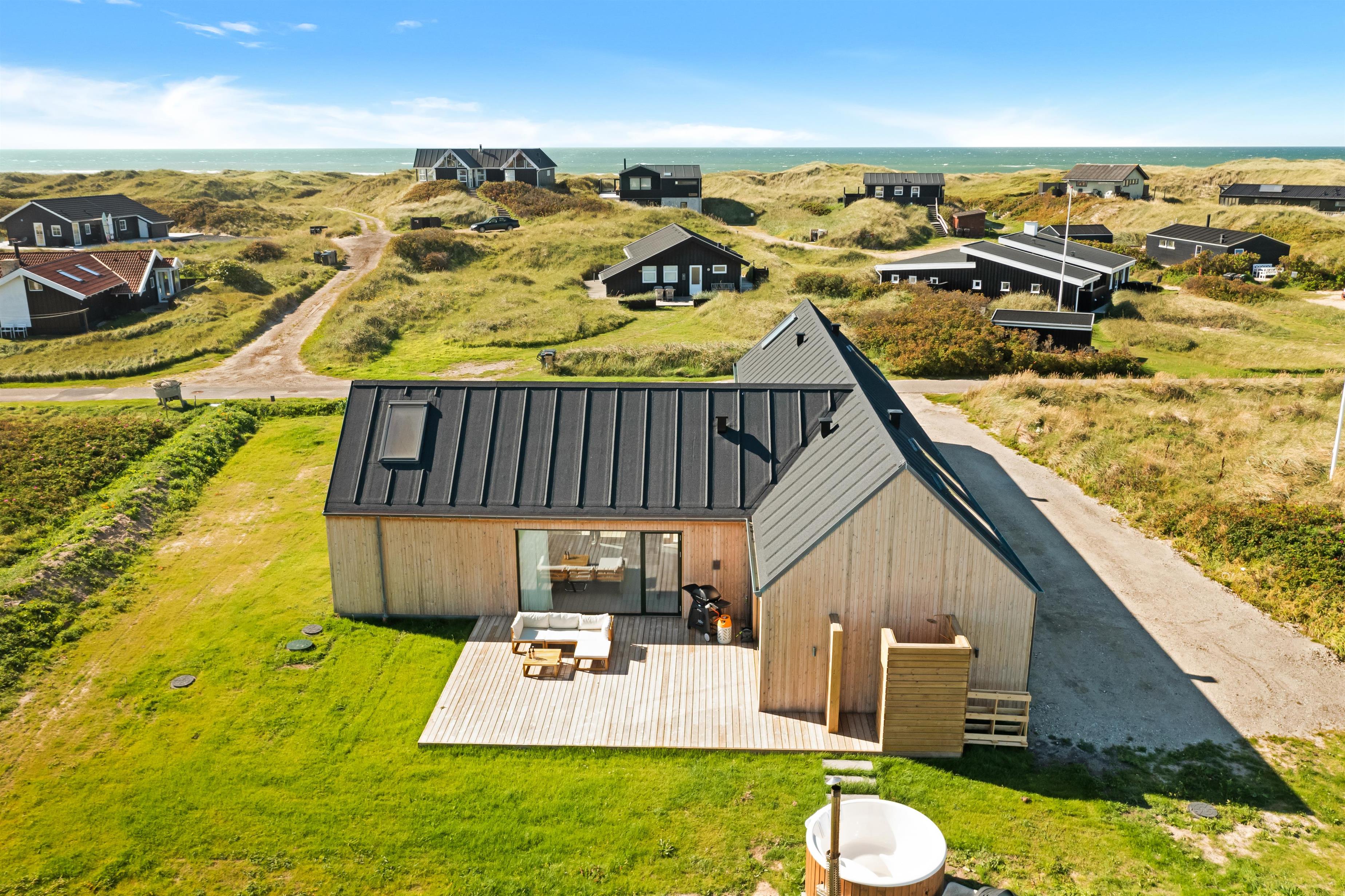 The holiday home is situated on a spacious 1200-square-meter natural plot, only 250 meters from the beach. The area is also close to Løkken center, shopping, transportation, shopping, restaurants, and plenty of indoor and outdoor activities. There is a delightful outdoor spa, an outdoor shower, spacious terraces, a barbecue, and lovely garden furniture. There are footpaths leading down to the beach, which is only 250 meters away.