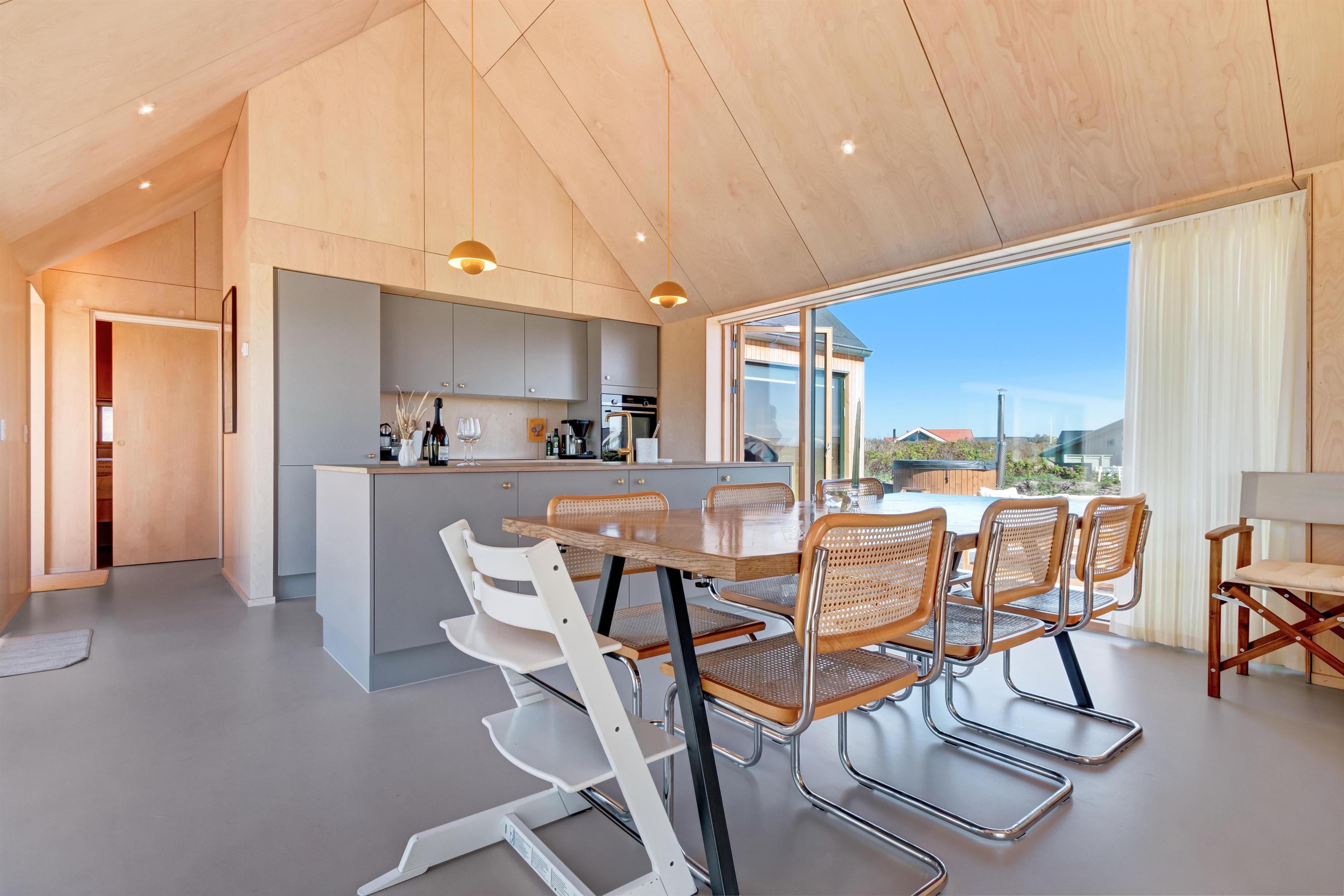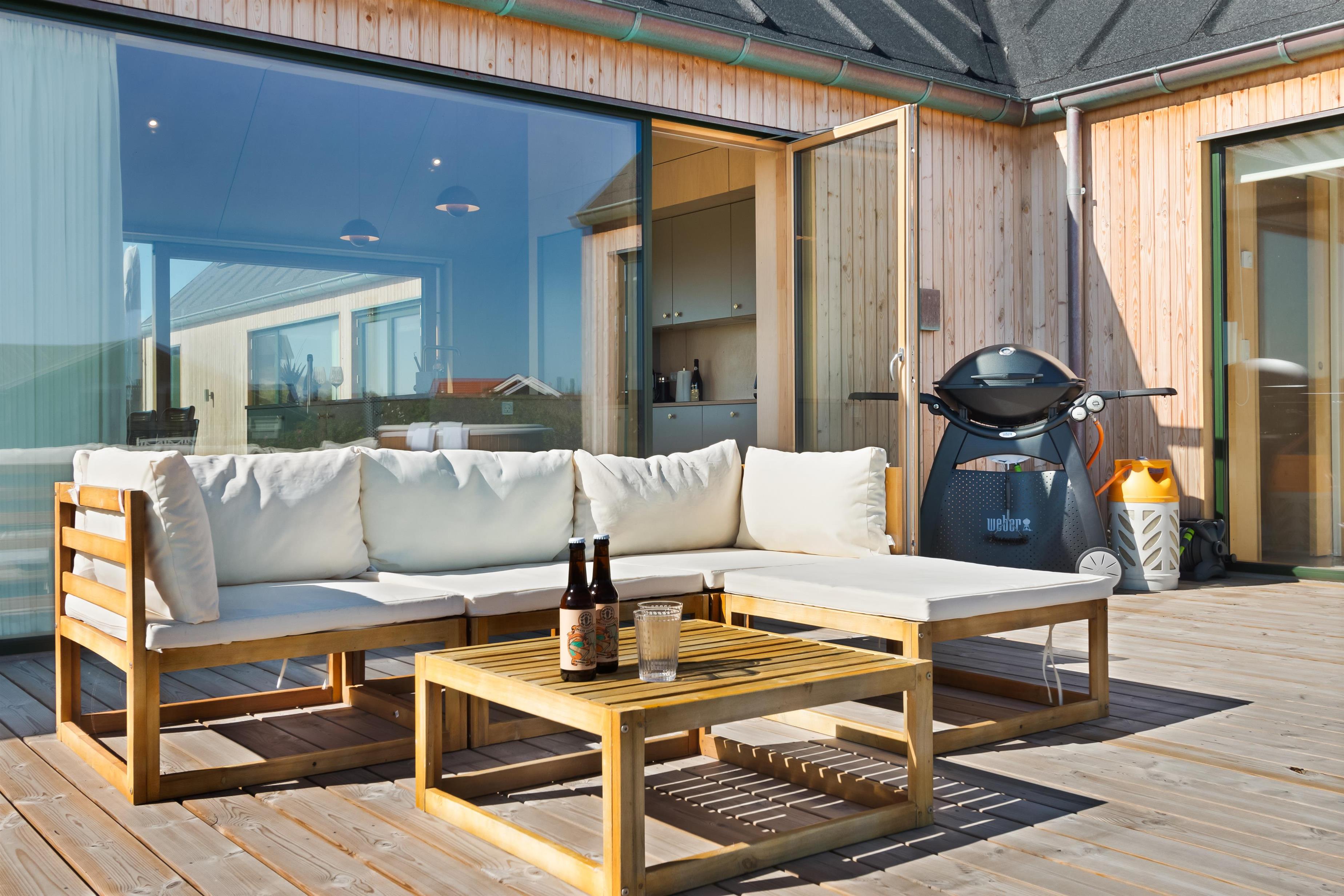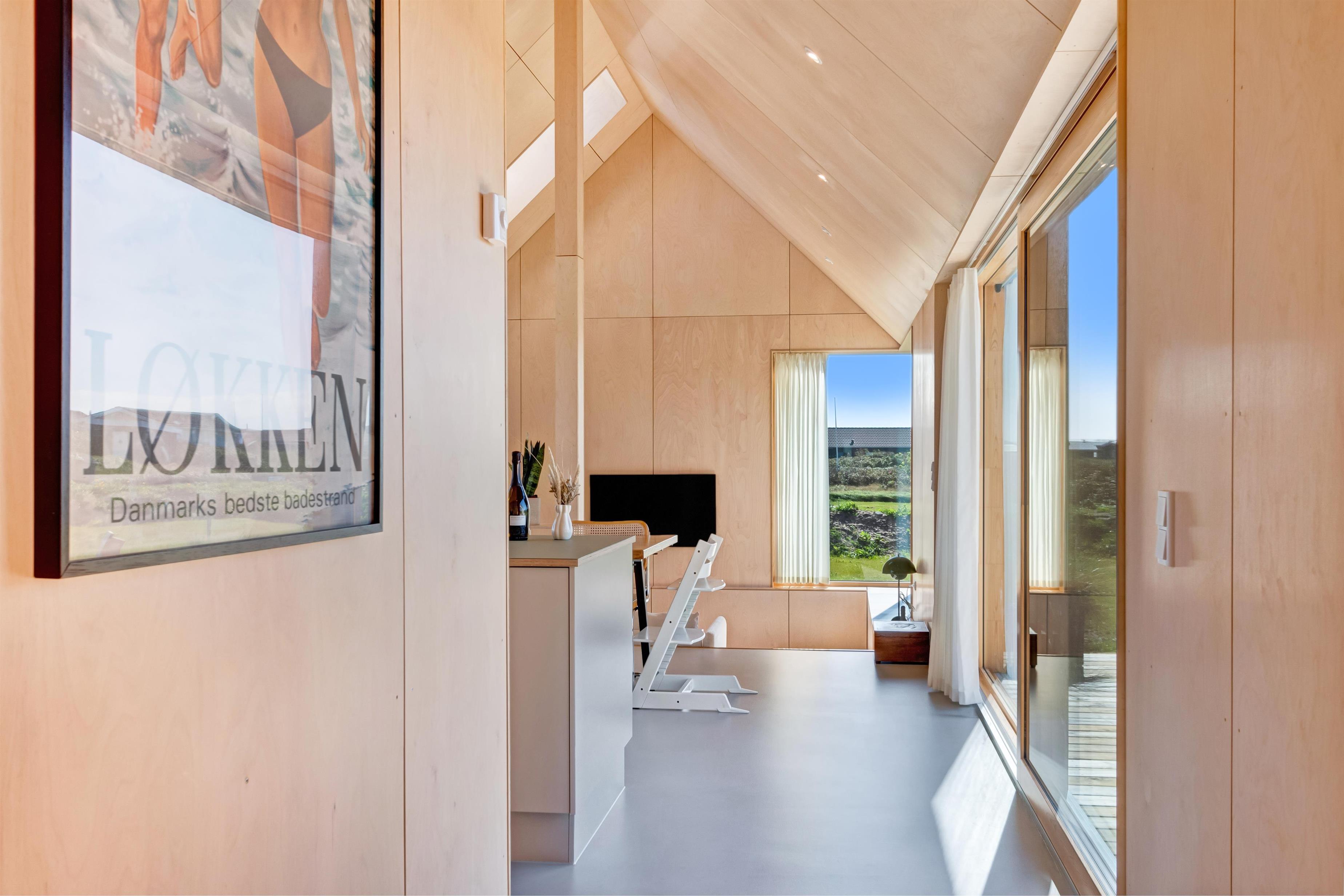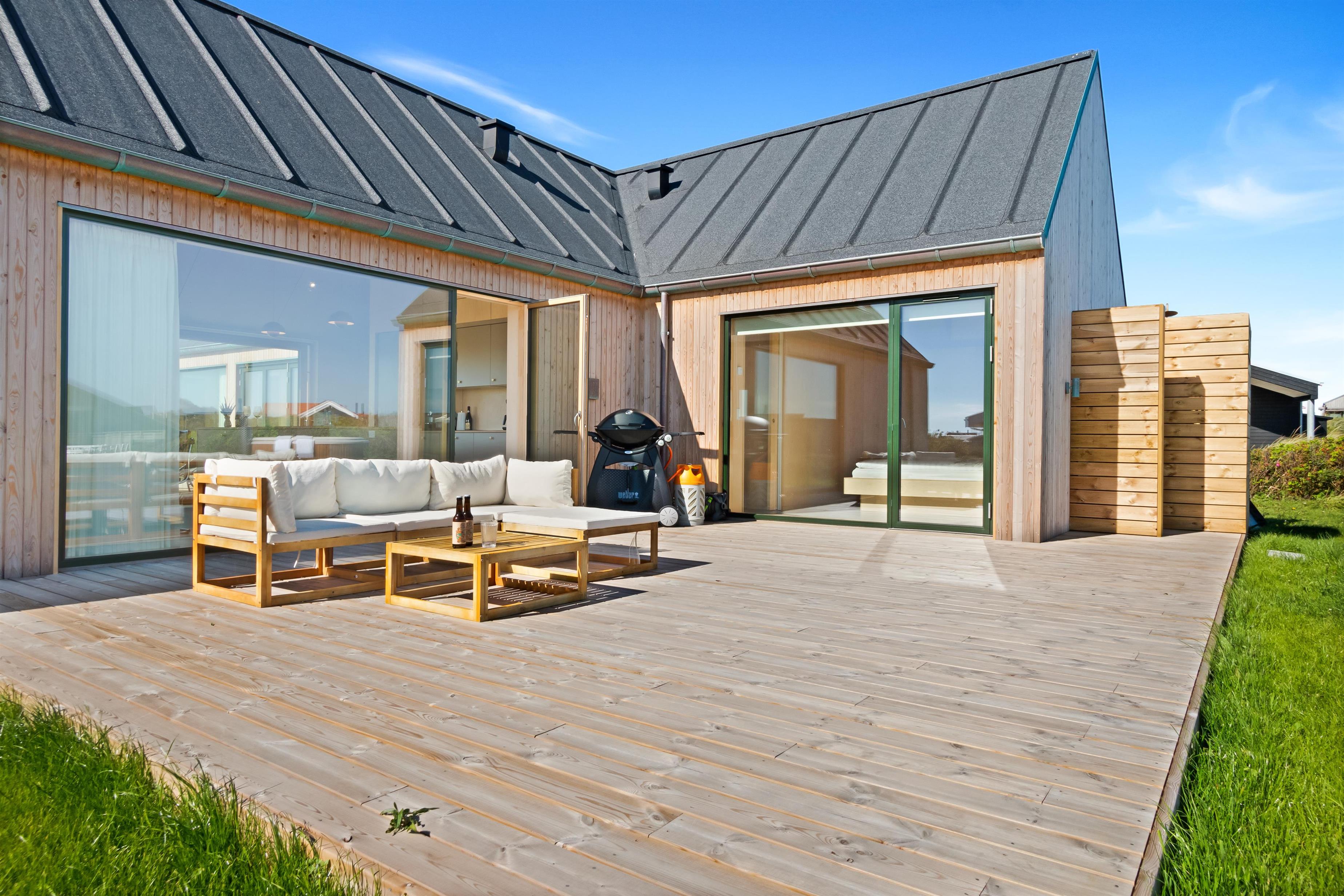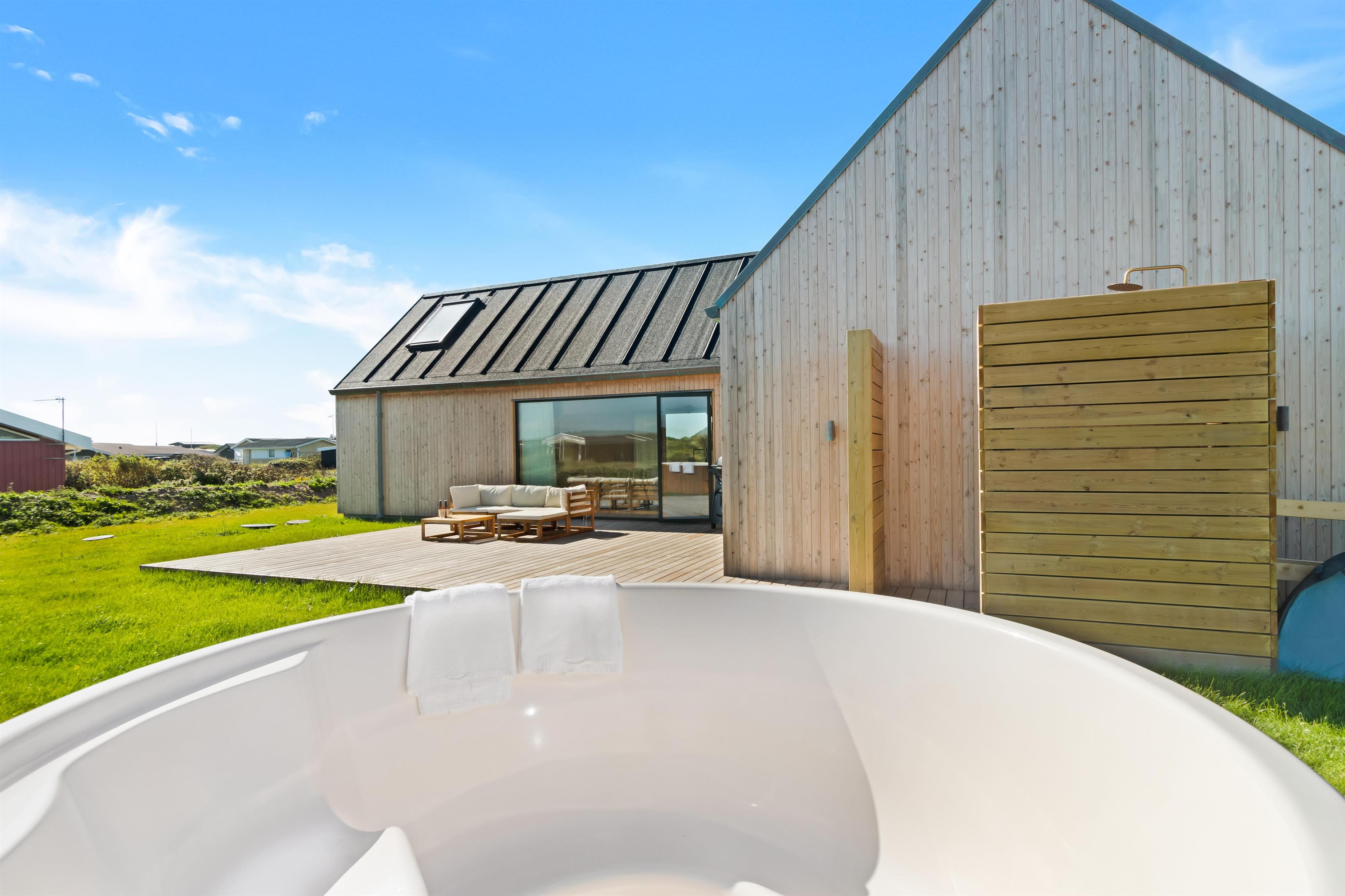 The holiday home is situated on a spacious 1200-square-meter natural plot, only 250 meters from the beach. The area is also close to Løkken center, shopping, transportation, shopping, restaurants, and plenty of indoor and outdoor activities. There is a delightful outdoor spa, an outdoor shower, spacious terraces, a barbecue, and lovely garden furniture. There are footpaths leading down to the beach, which is only 250 meters away.
