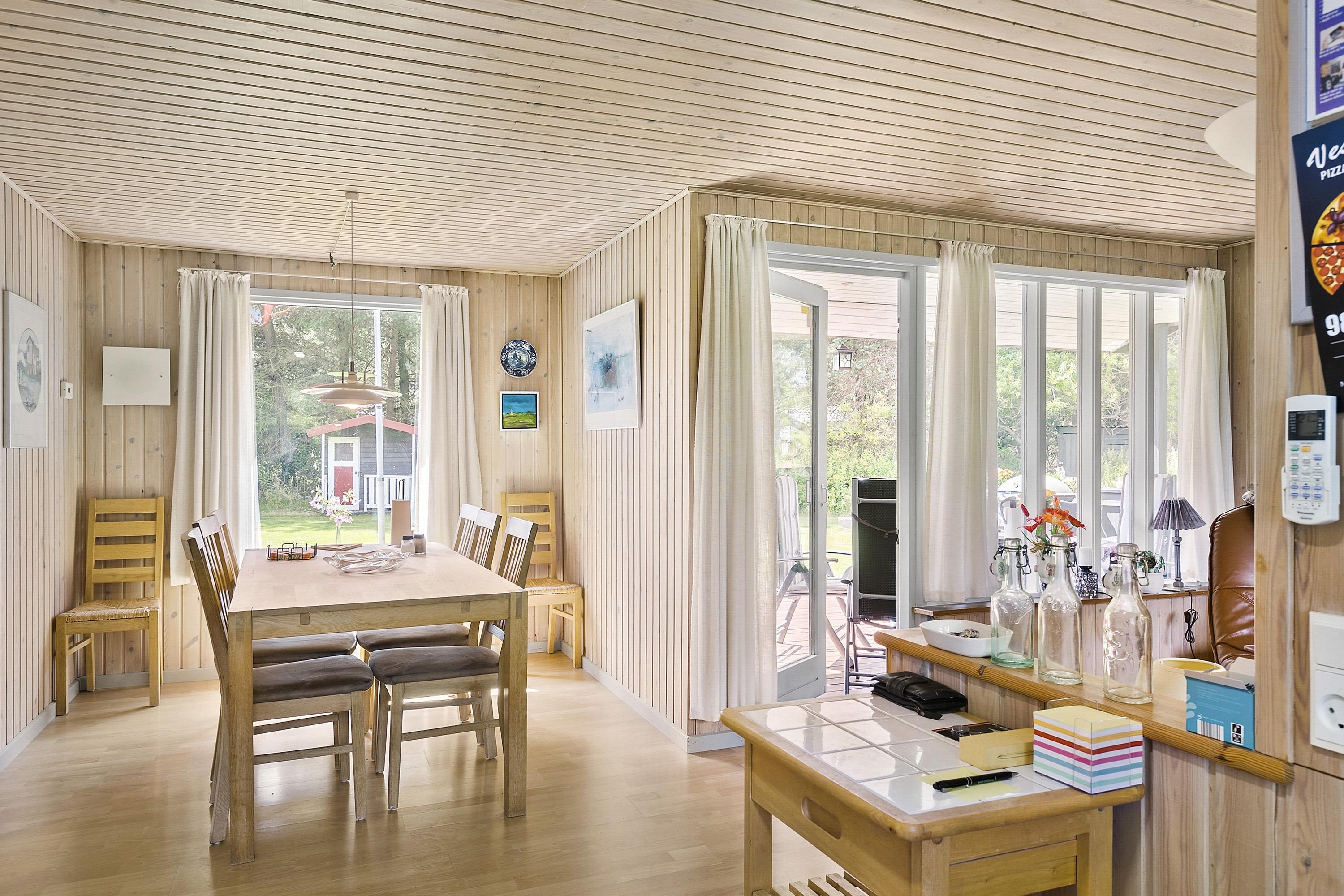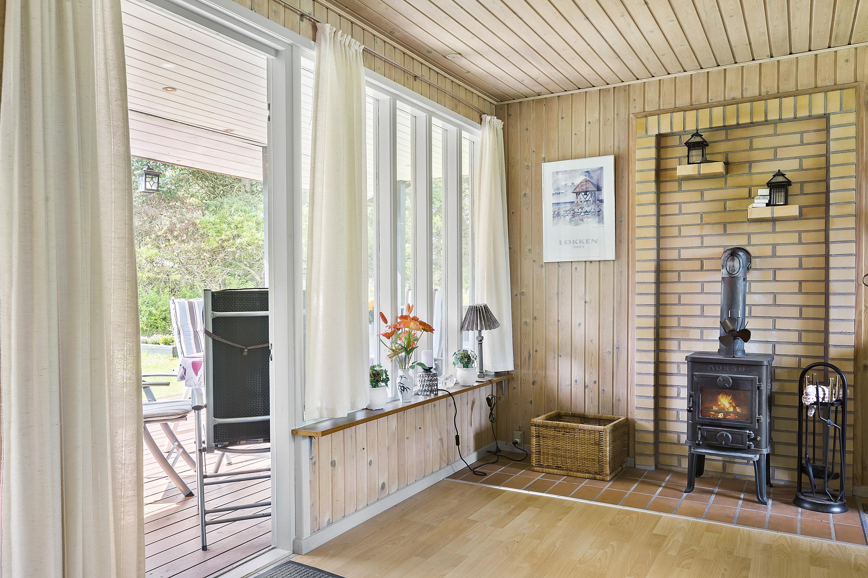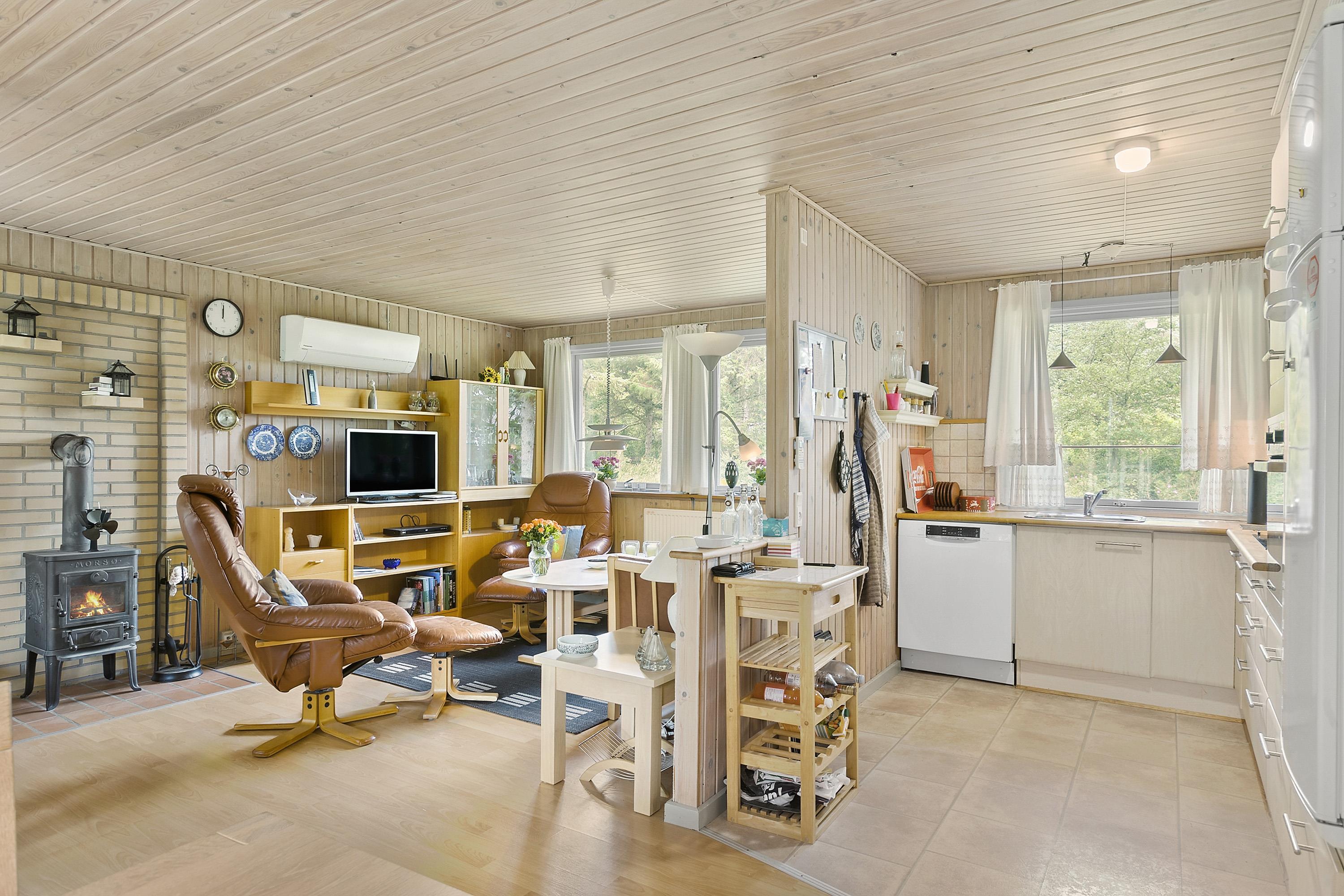 This well-maintained and classic holiday home offers 75 square meters with 3 bedrooms, a large bathroom with a shower, spa, and sauna, an open kitchen/dining area, and a very cozy fireplace room. There are two sheds and a carport for your car. As mentioned, the house is a classic summer cottage and is in good condition. All three bedrooms have ample closet space, with one of them being smaller. From the living room, you have access to the lovely terrace, where you can enjoy hours in the sun when the weather is at its best, or you can retreat to the delightful fireplace room, which has an open connection to the kitchen/dining area.