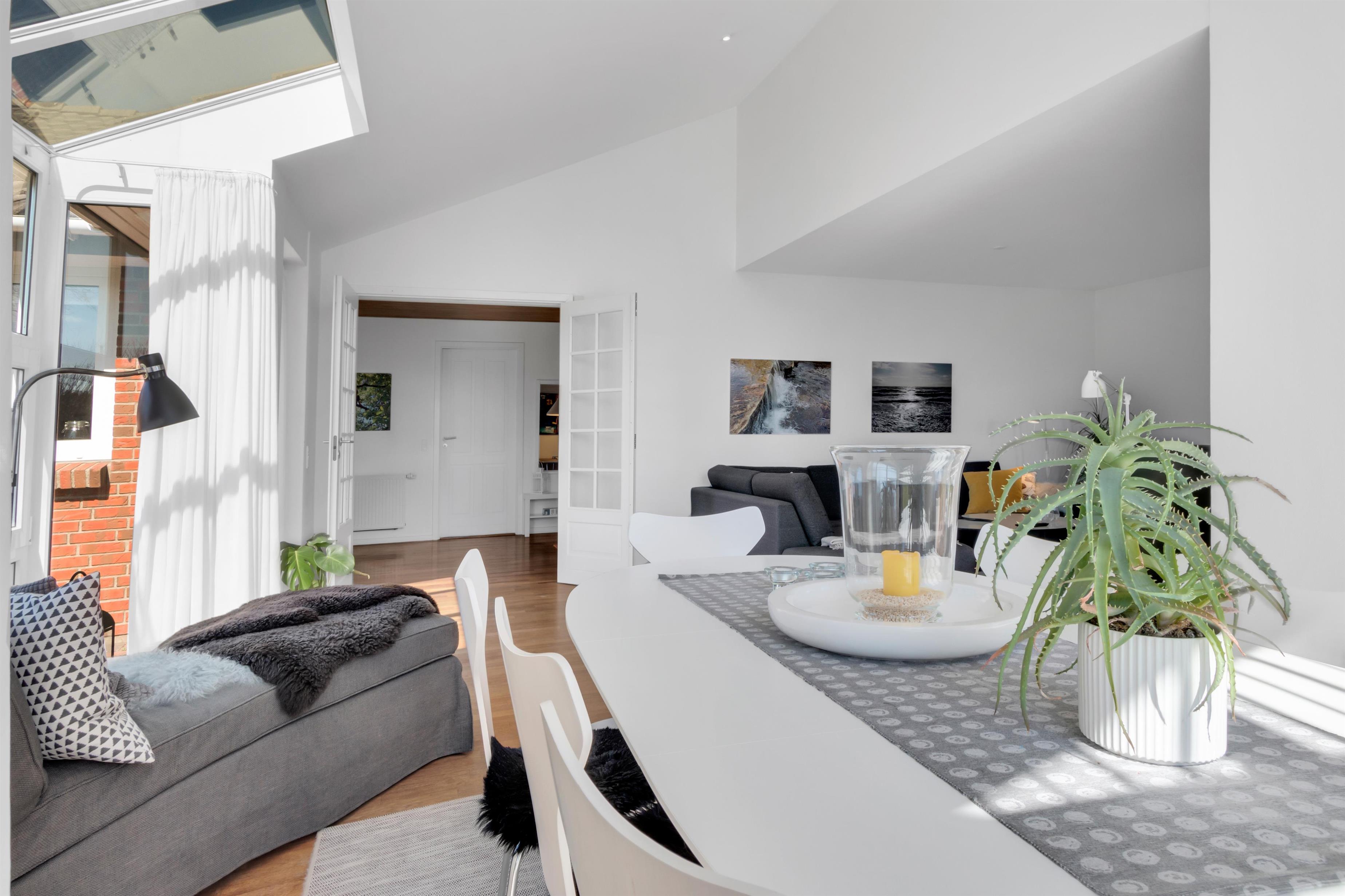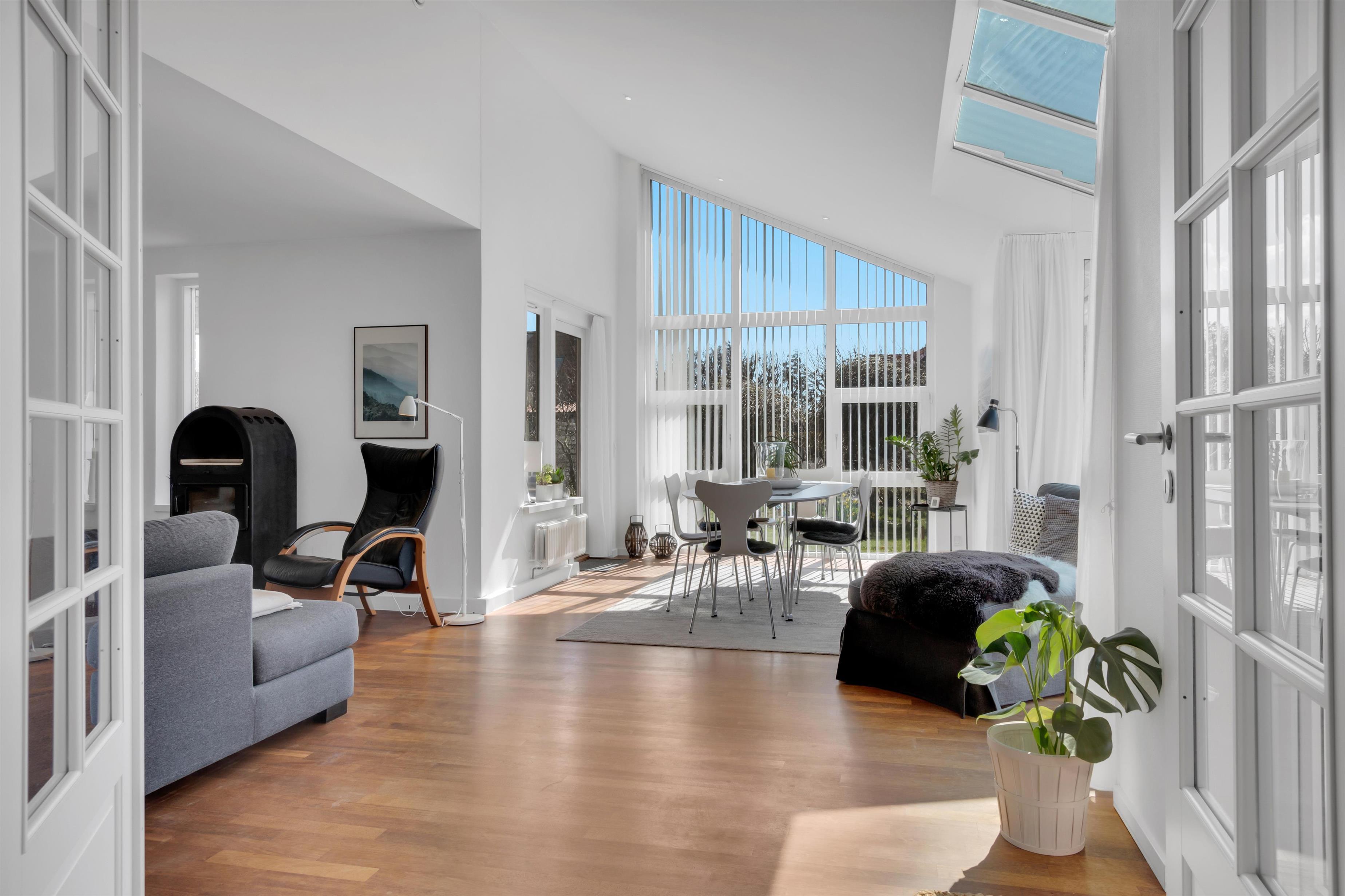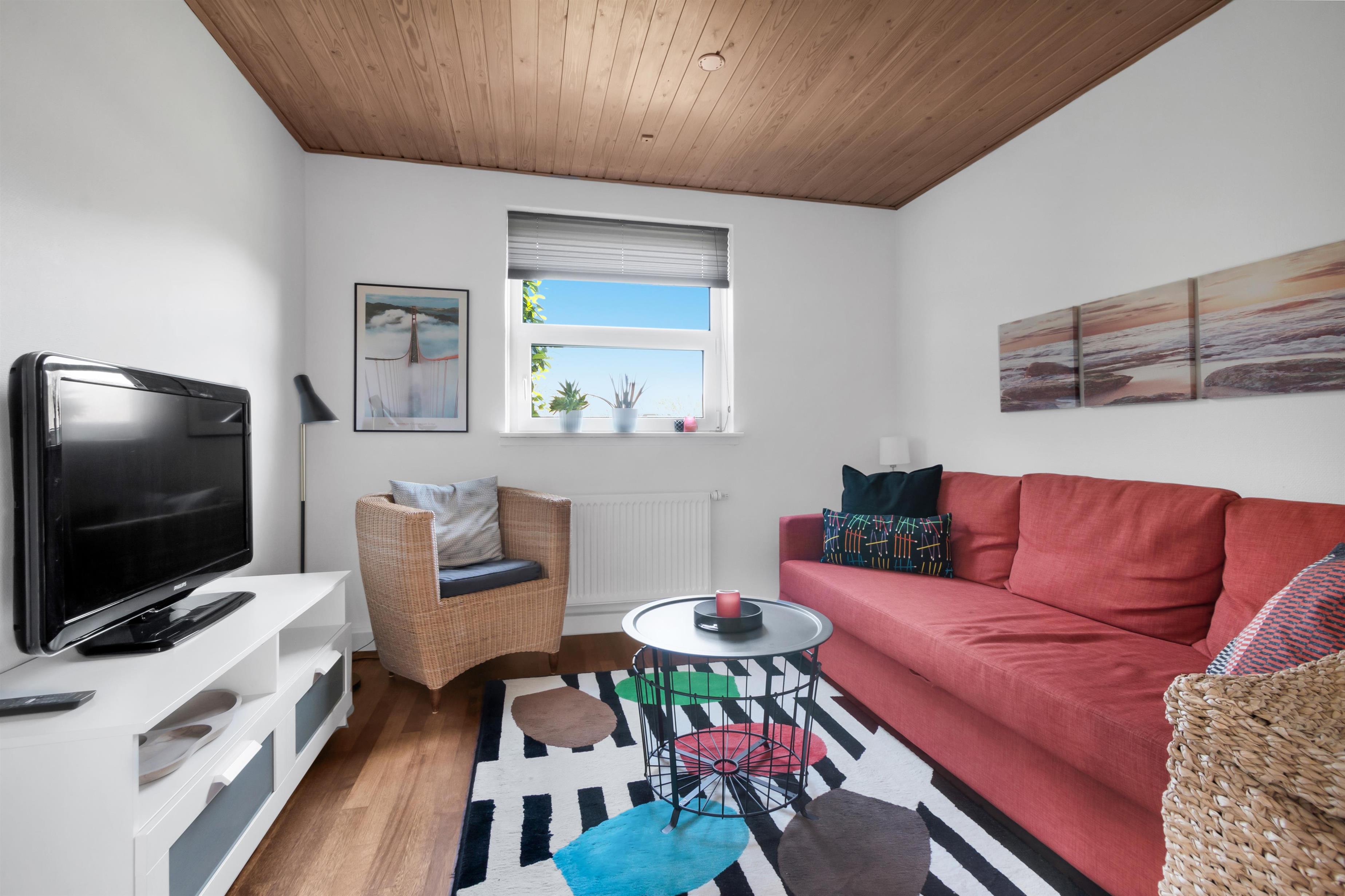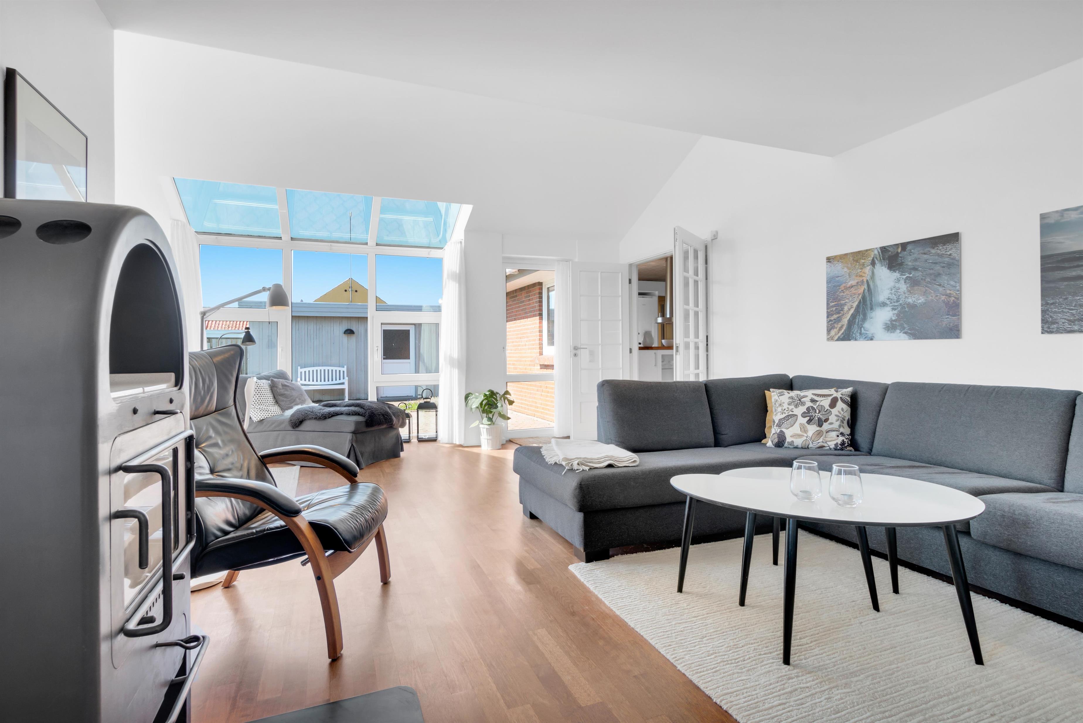 In addition to accommodating up to 9 people, the heart of the house is undoubtedly the incredibly beautiful living room with large windows and fantastic natural light. There is a chaise lounge to relax in, a large dining table, and a real floating sofa in front of the wood-burning stove. On one side of the living room, there are double doors leading to the kitchen, where there is also extra dining space, and on the other side, there is access to the lovely, sheltered garden. There are four bedrooms with sleeping arrangements that include bunk beds, single beds, a double bed, a sofa bed, and a crib. The kitchen is open and spacious, and the house has district heating, which is an affordable source of heat. There is one bathroom with a toilet, an extra toilet and a lovely utility room.