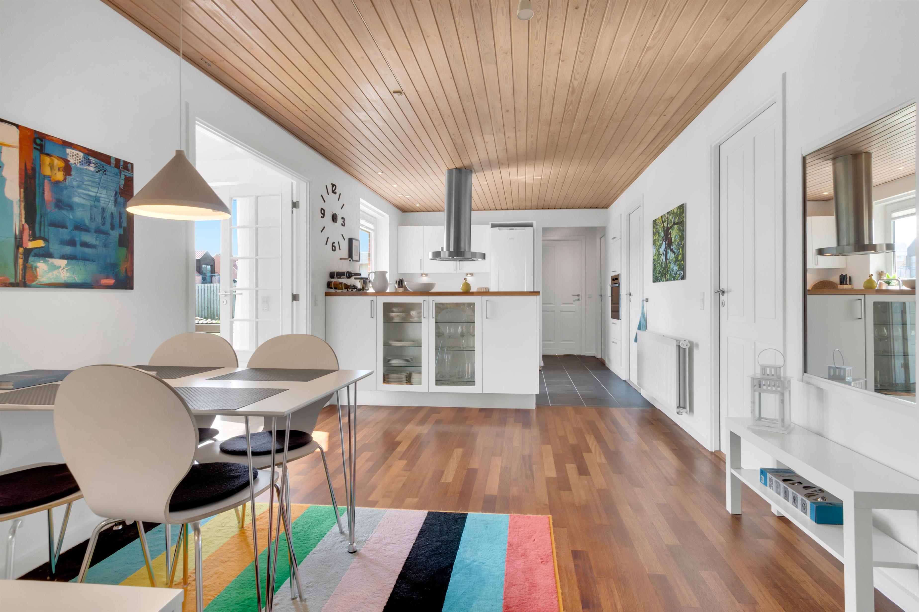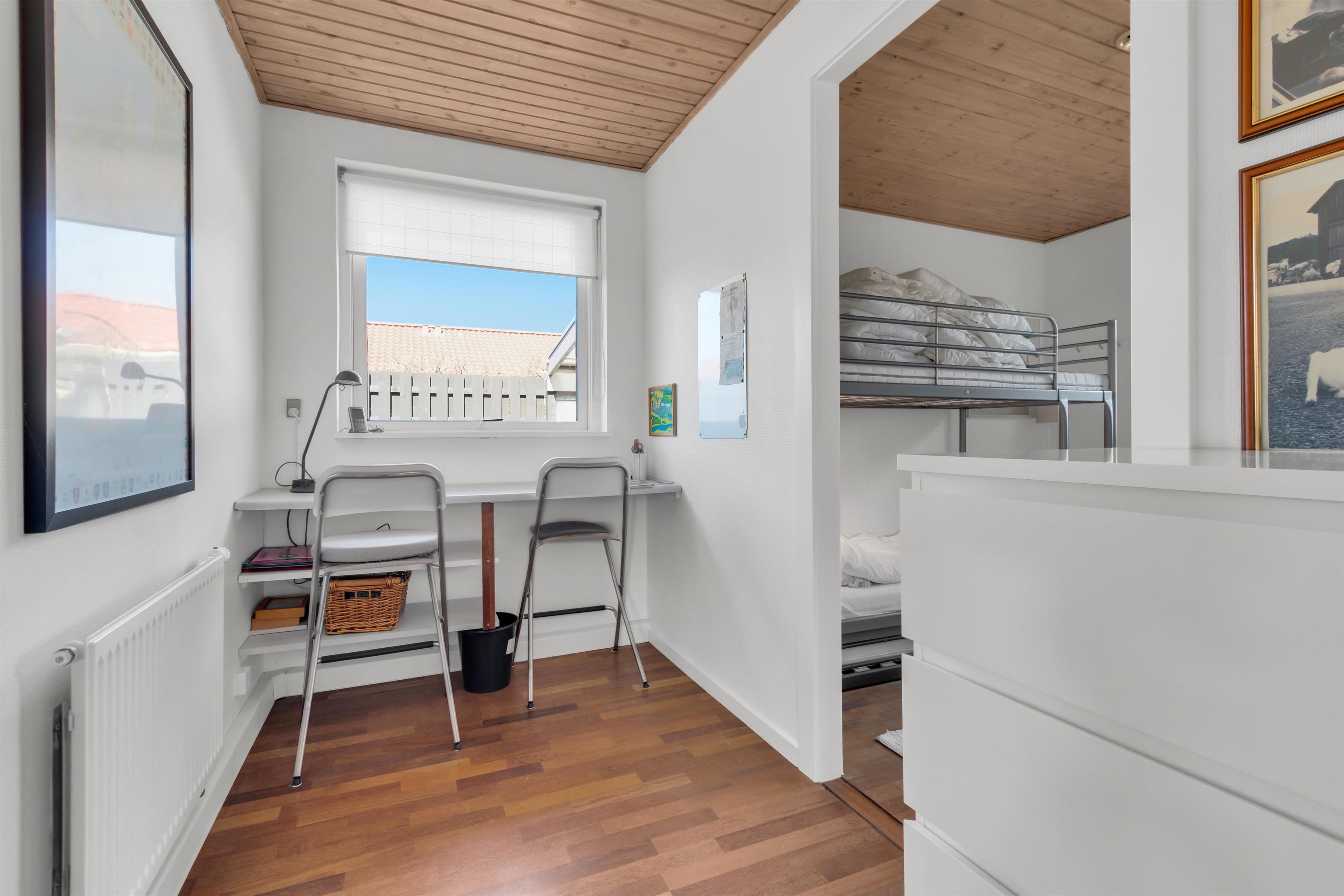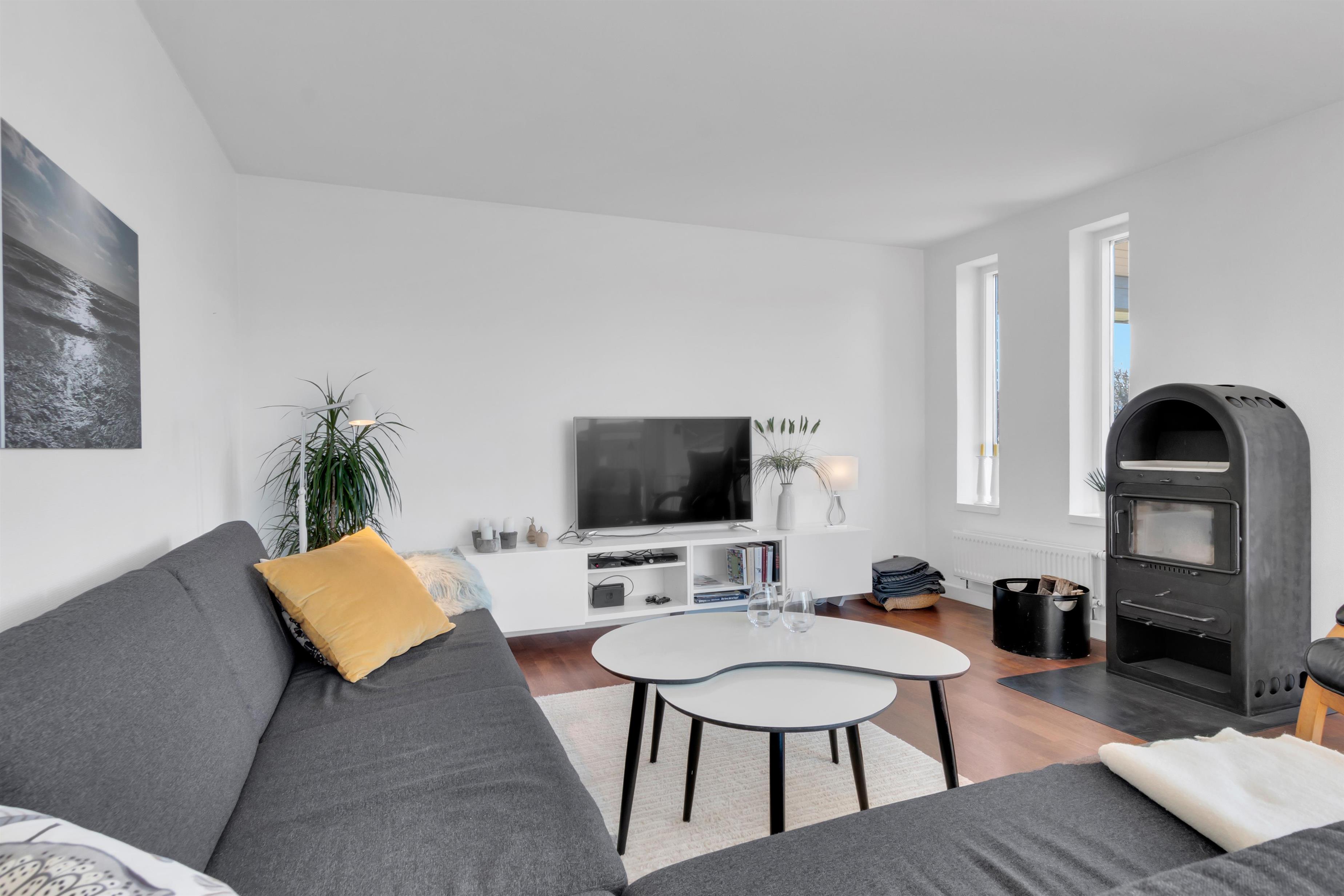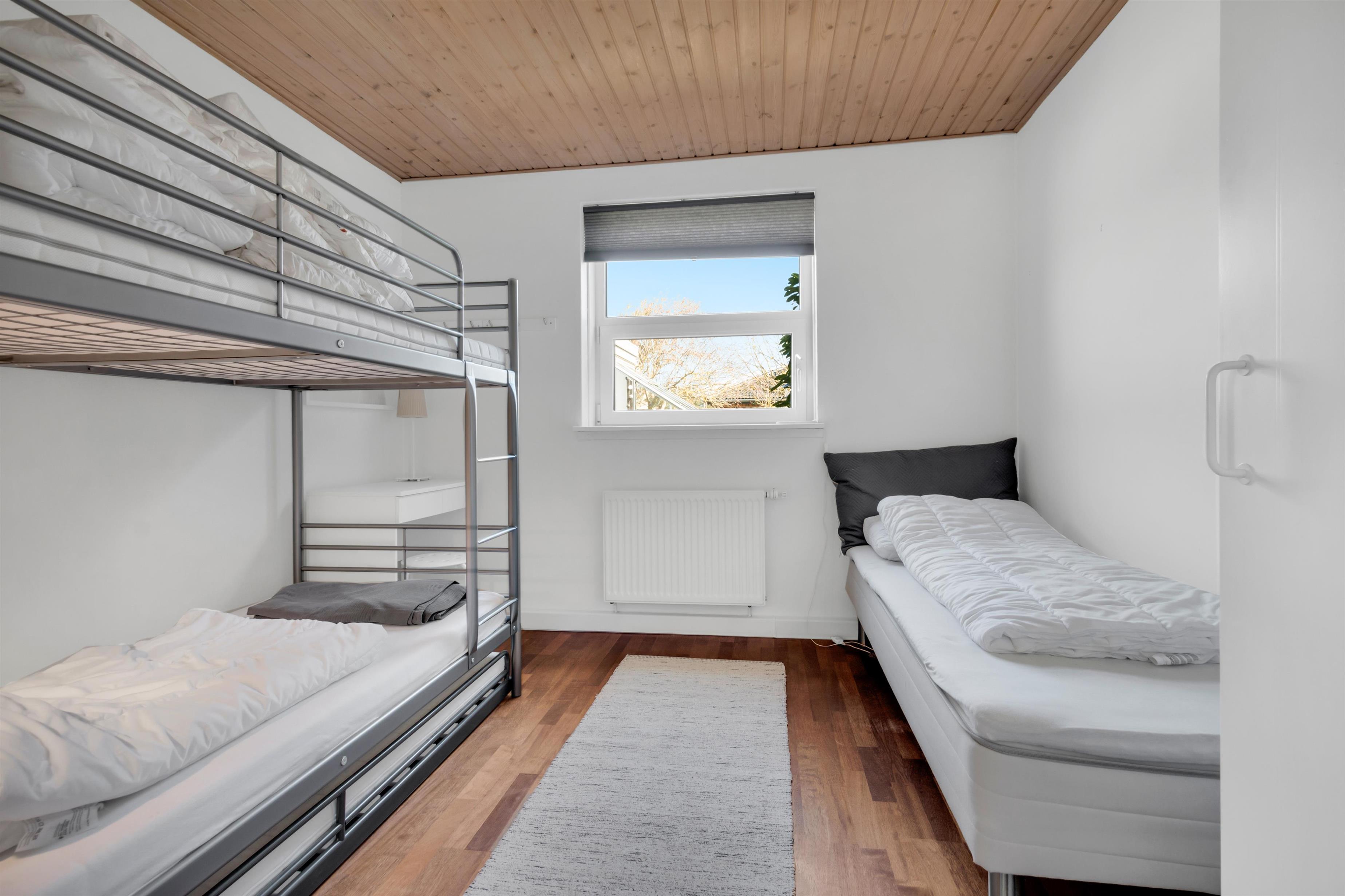 In addition to accommodating up to 9 people, the heart of the house is undoubtedly the incredibly beautiful living room with large windows and fantastic natural light. There is a chaise lounge to relax in, a large dining table, and a real floating sofa in front of the wood-burning stove. On one side of the living room, there are double doors leading to the kitchen, where there is also extra dining space, and on the other side, there is access to the lovely, sheltered garden. There are four bedrooms with sleeping arrangements that include bunk beds, single beds, a double bed, a sofa bed, and a crib. The kitchen is open and spacious, and the house has district heating, which is an affordable source of heat. There is one bathroom with a toilet, an extra toilet and a lovely utility room.