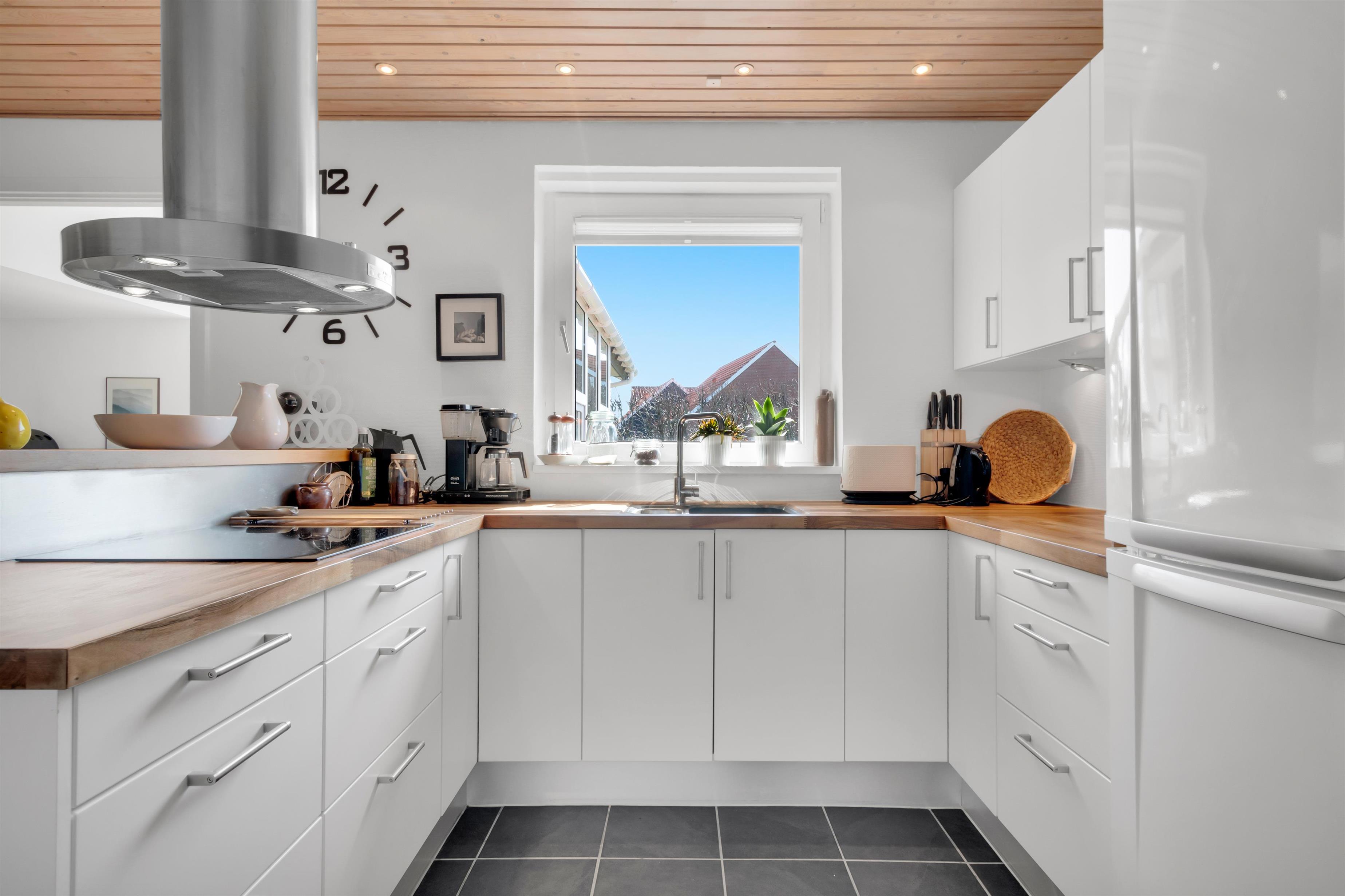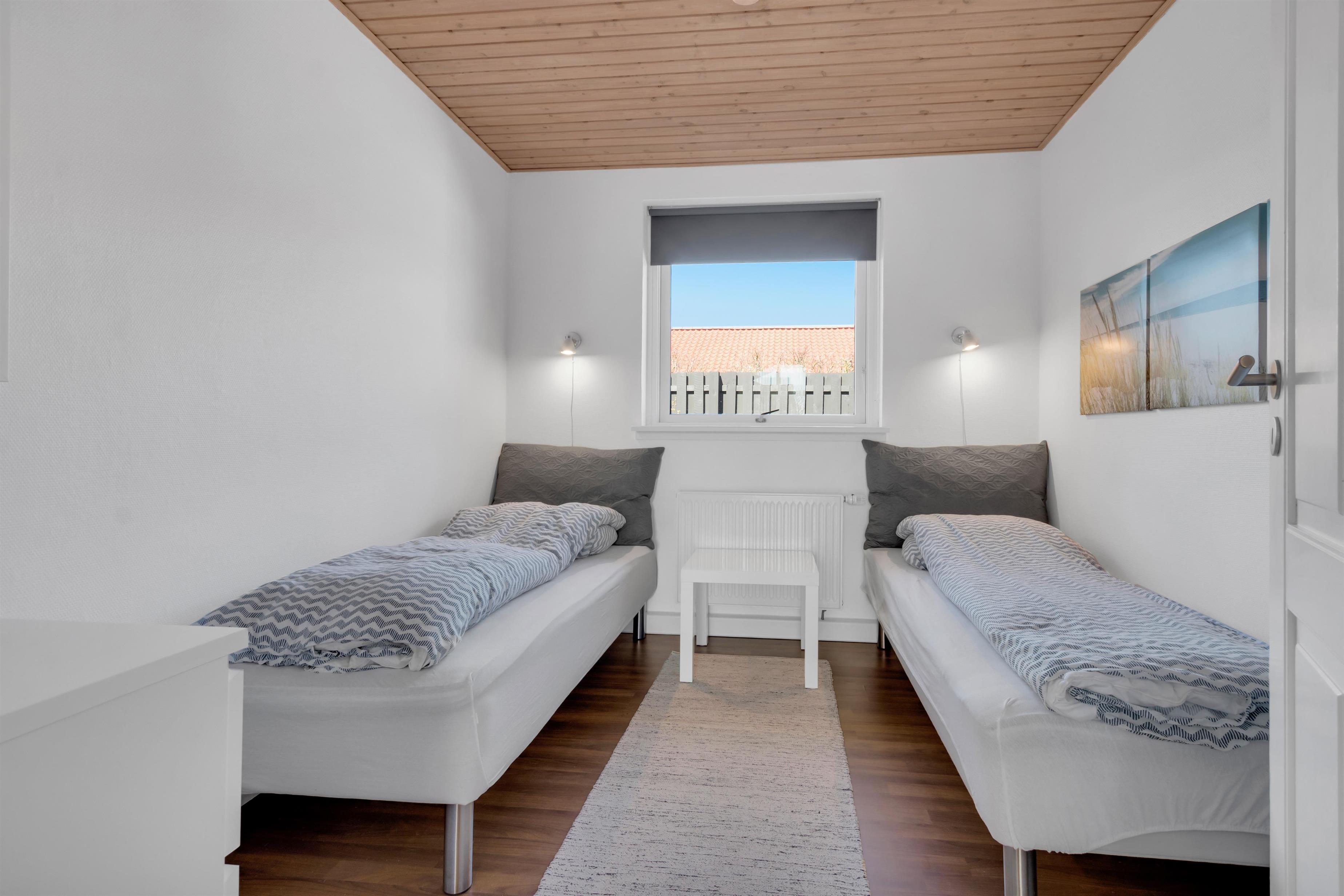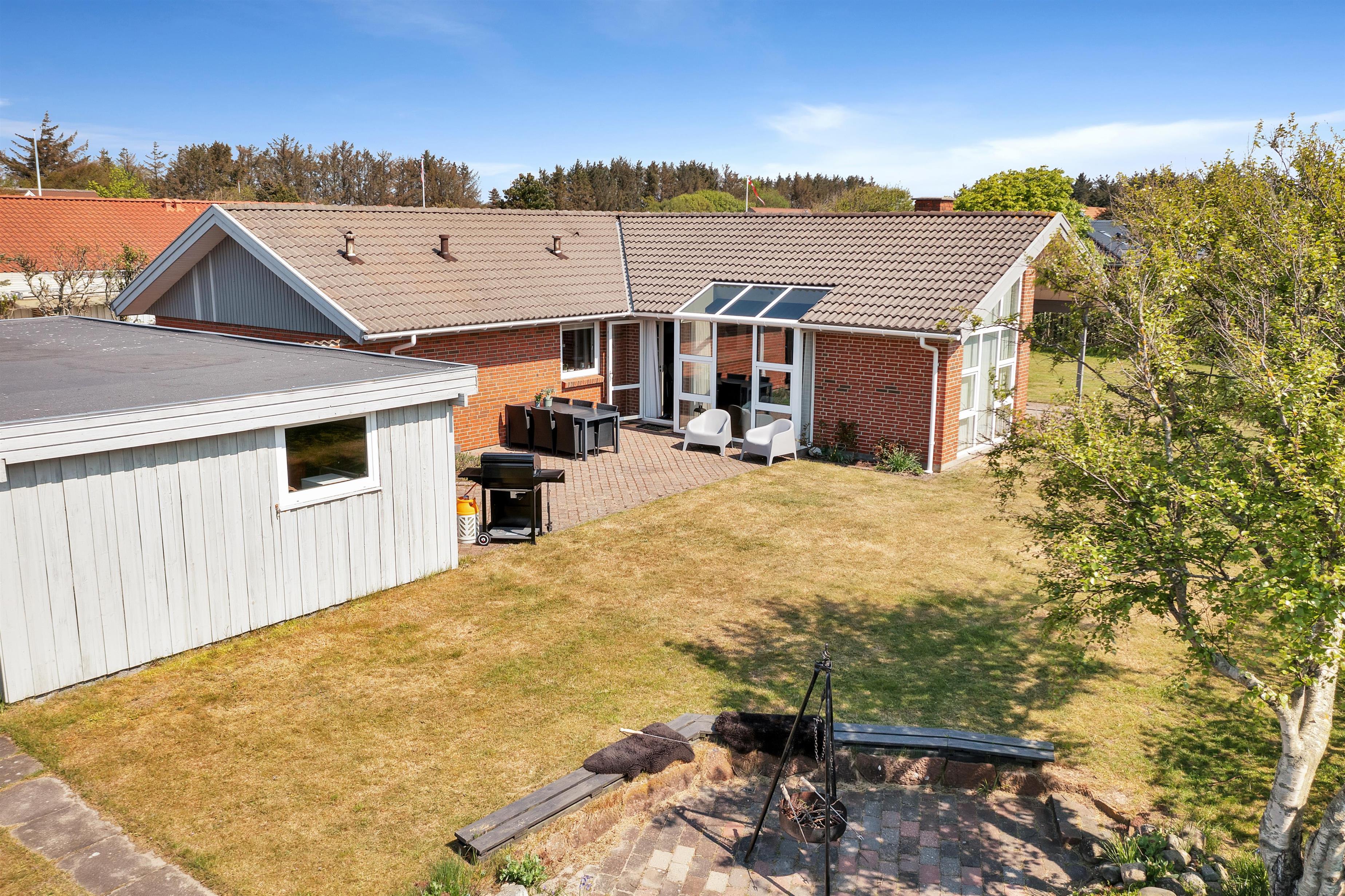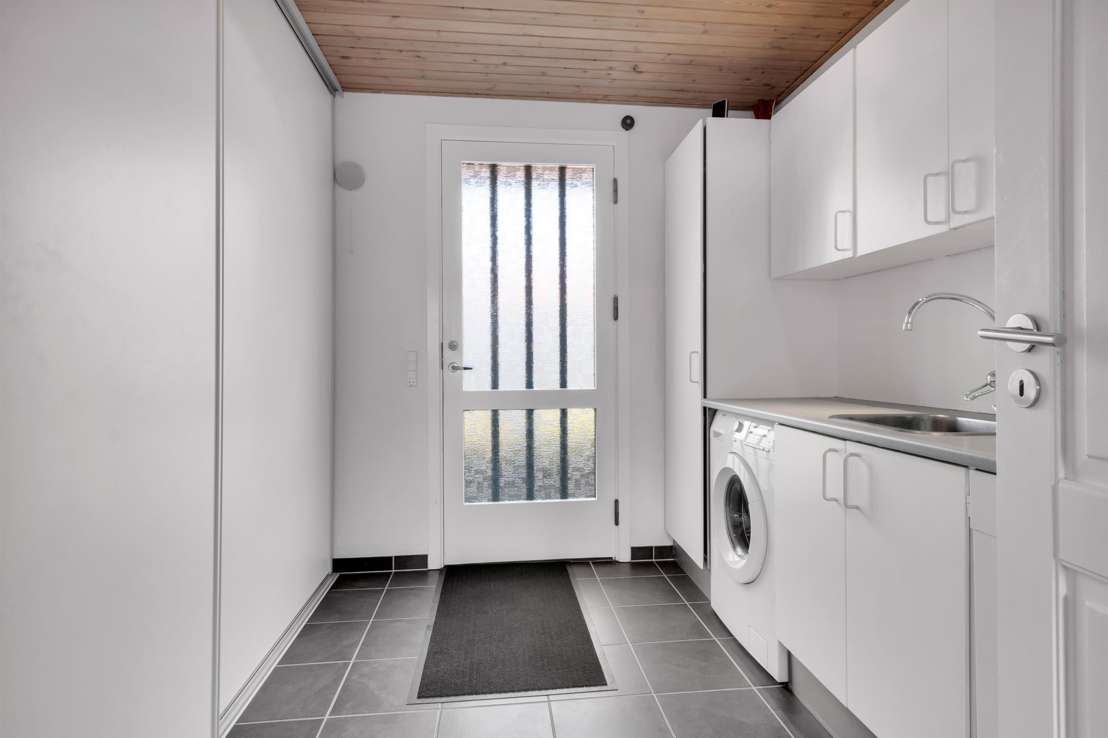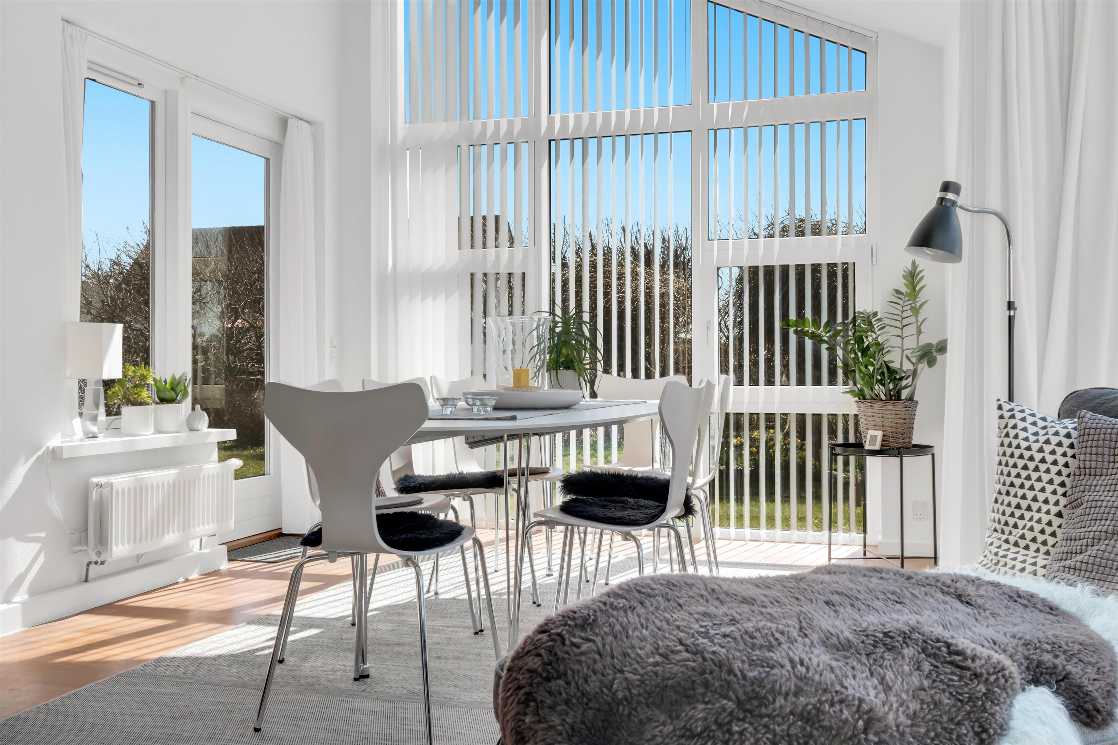 In addition to accommodating up to 9 people, the heart of the house is undoubtedly the incredibly beautiful living room with large windows and fantastic natural light. There is a chaise lounge to relax in, a large dining table, and a real floating sofa in front of the wood-burning stove. On one side of the living room, there are double doors leading to the kitchen, where there is also extra dining space, and on the other side, there is access to the lovely, sheltered garden. There are four bedrooms with sleeping arrangements that include bunk beds, single beds, a double bed, a sofa bed, and a crib. The kitchen is open and spacious, and the house has district heating, which is an affordable source of heat. There is one bathroom with a toilet, an extra toilet and a lovely utility room.