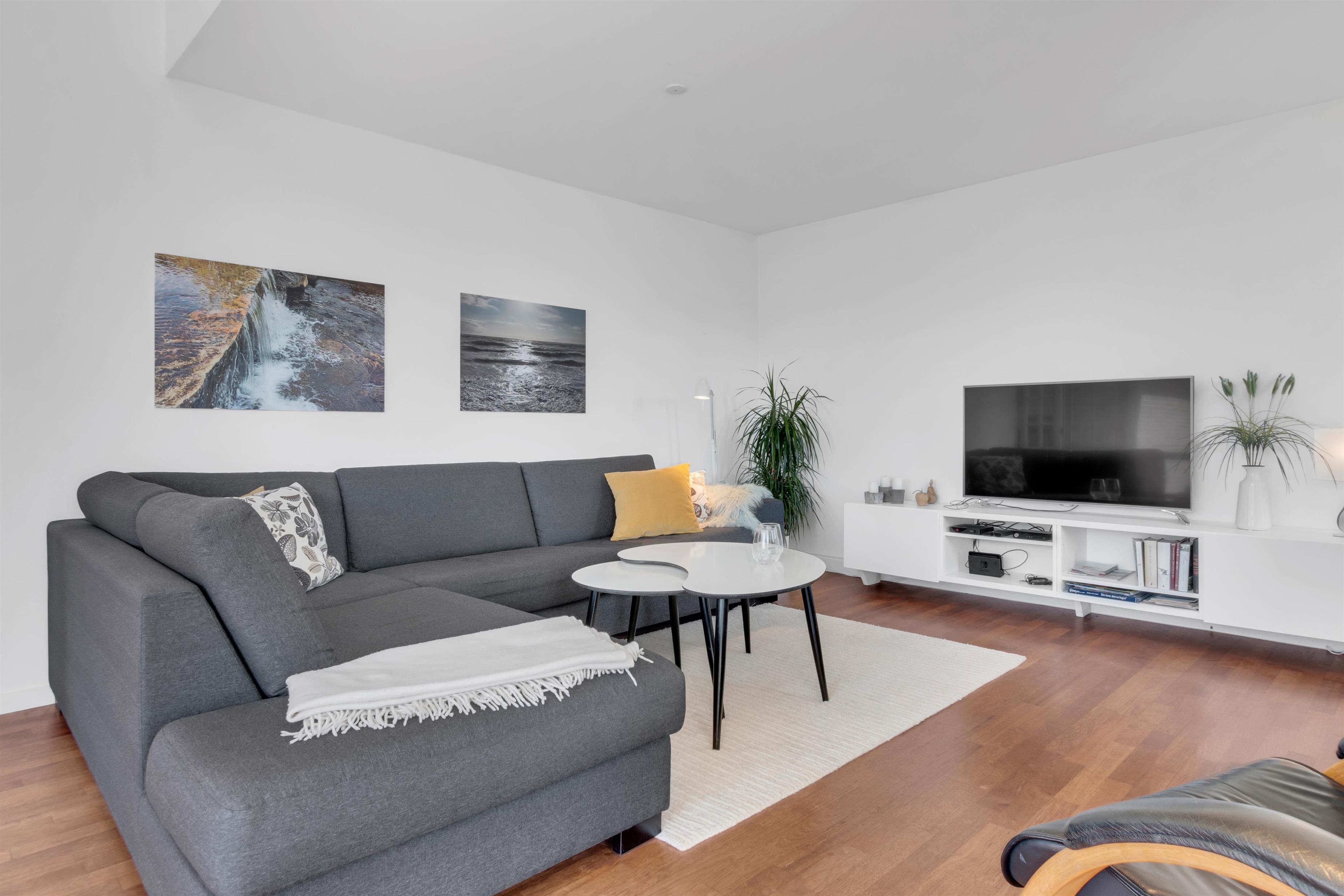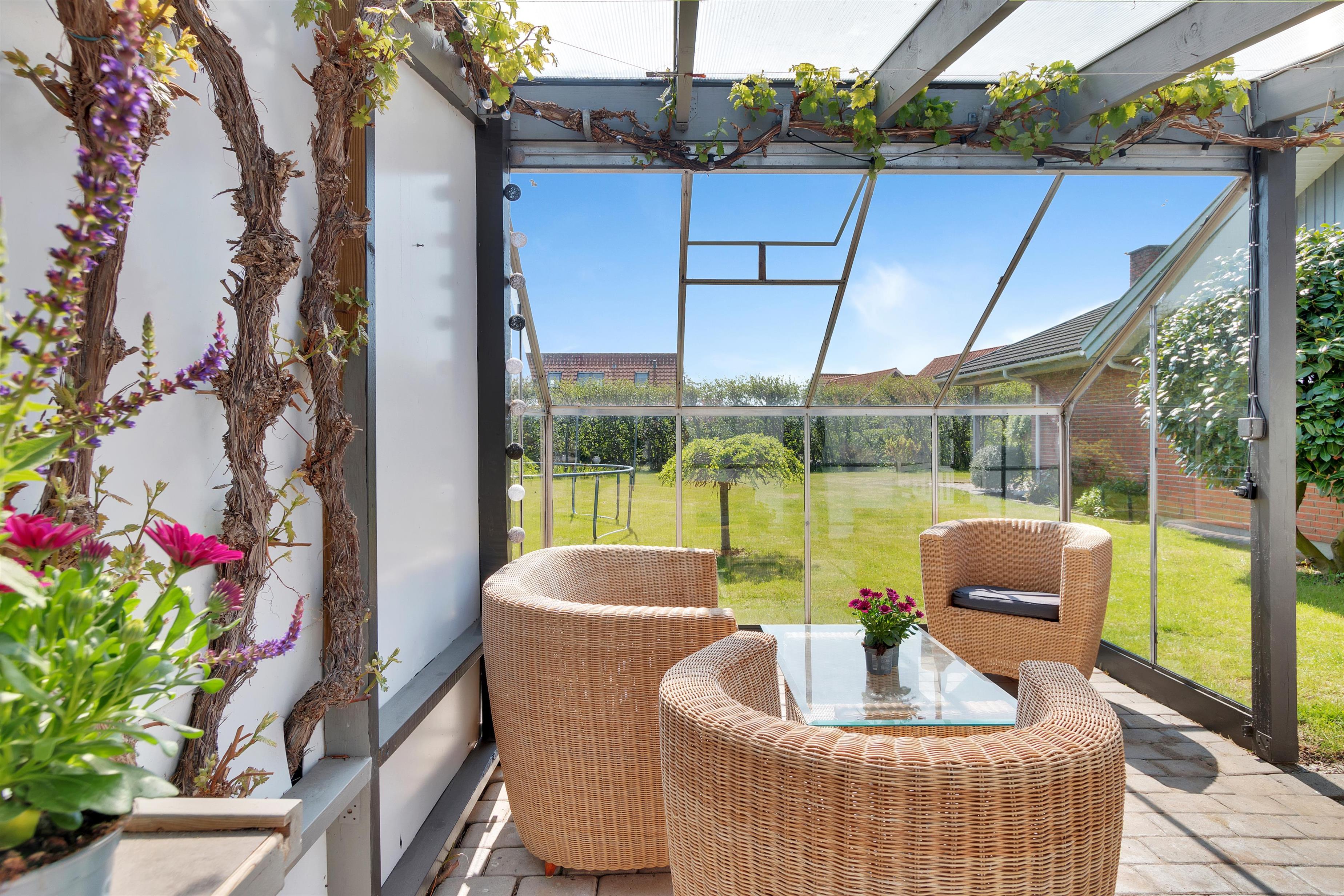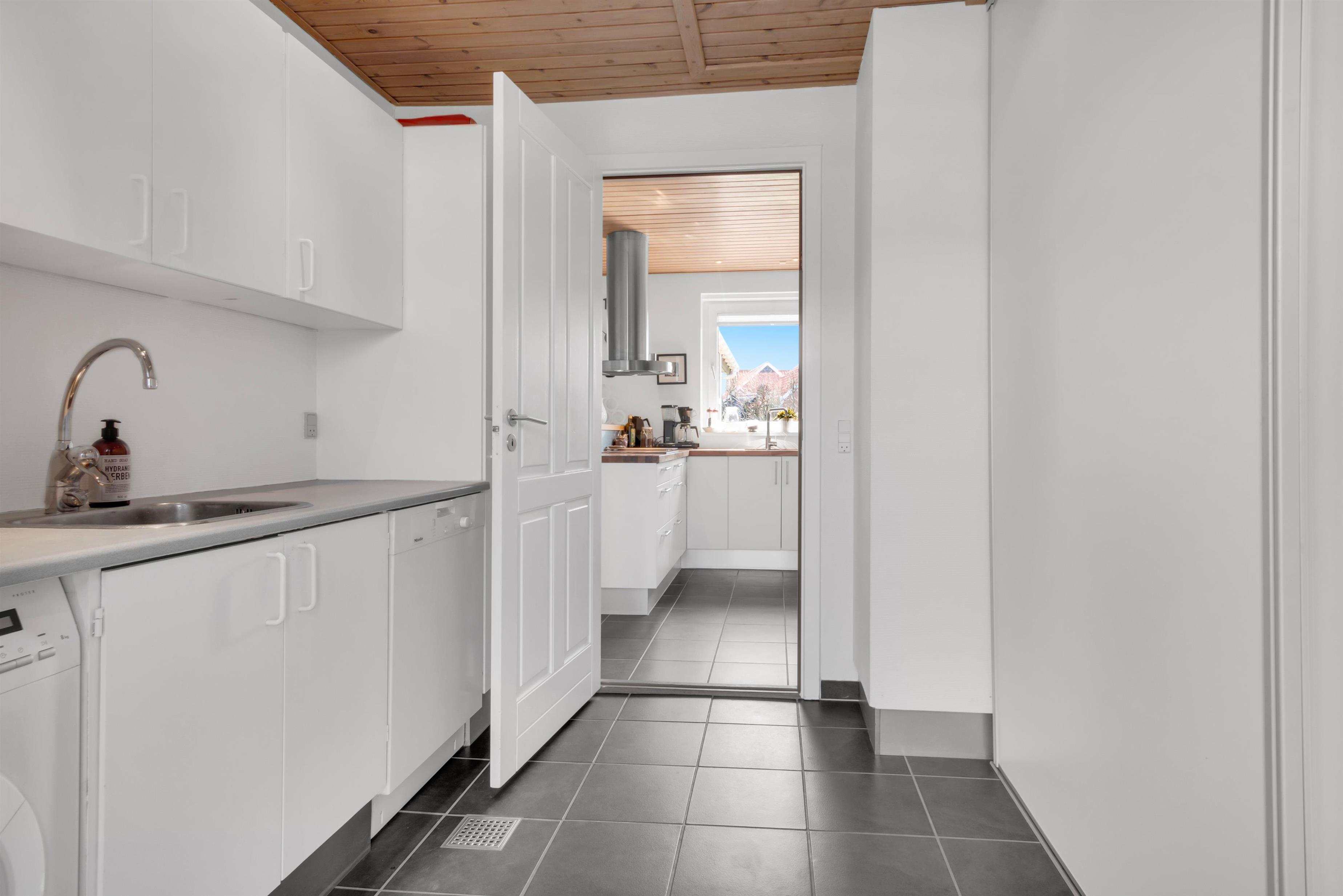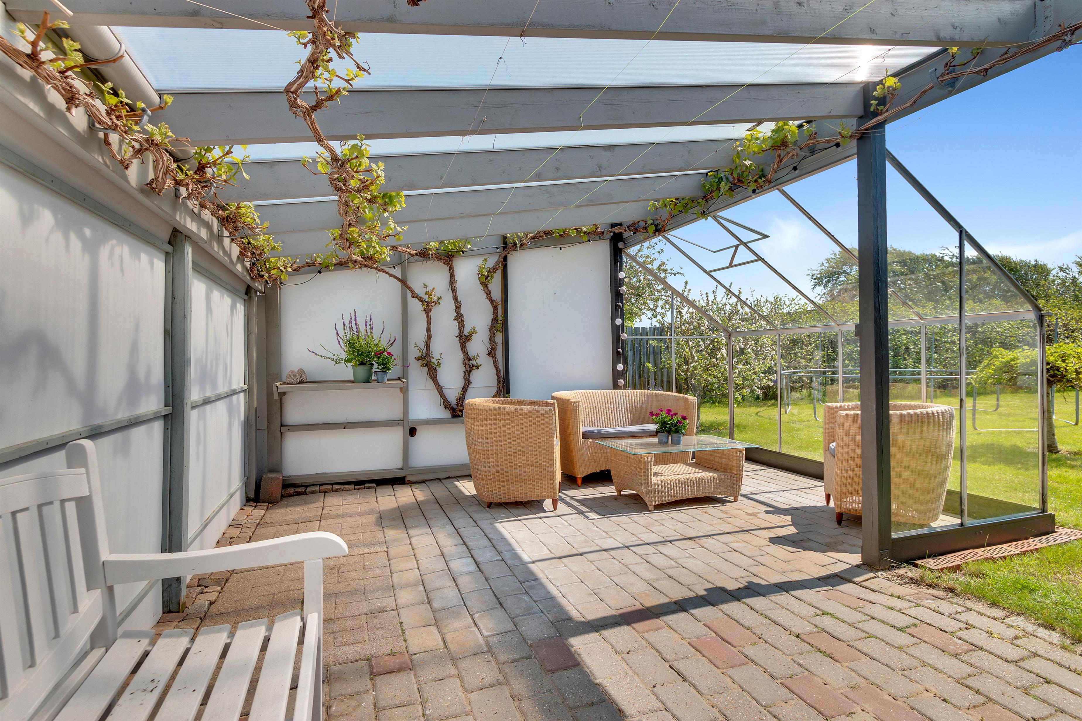 In addition to accommodating up to 9 people, the heart of the house is undoubtedly the incredibly beautiful living room with large windows and fantastic natural light. There is a chaise lounge to relax in, a large dining table, and a real floating sofa in front of the wood-burning stove. On one side of the living room, there are double doors leading to the kitchen, where there is also extra dining space, and on the other side, there is access to the lovely, sheltered garden. There are four bedrooms with sleeping arrangements that include bunk beds, single beds, a double bed, a sofa bed, and a crib. The kitchen is open and spacious, and the house has district heating, which is an affordable source of heat. There is one bathroom with a toilet, an extra toilet and a lovely utility room.